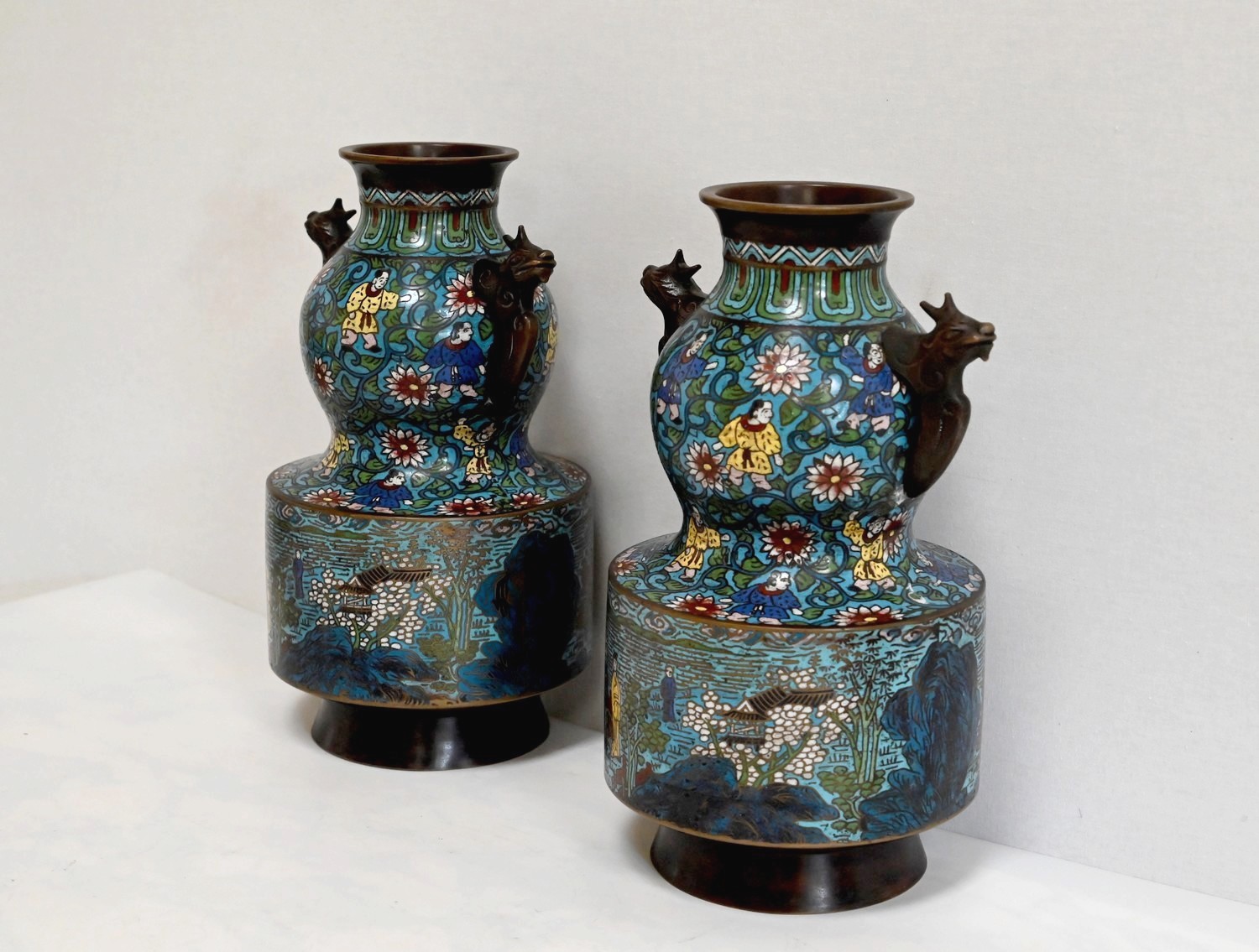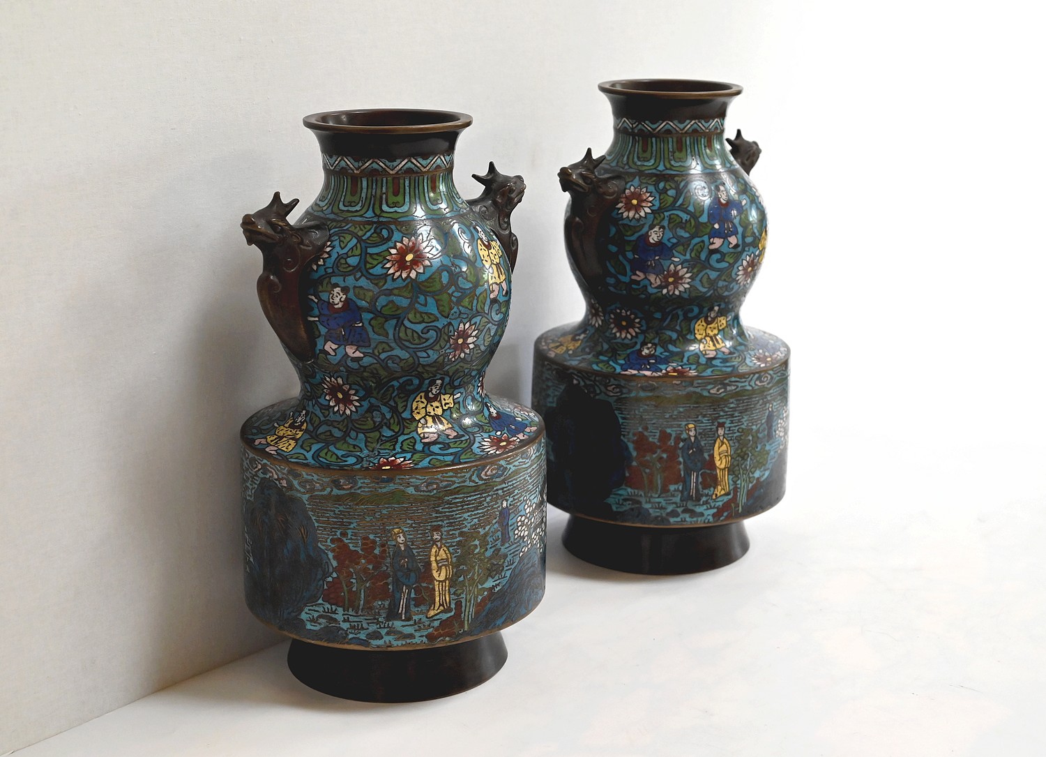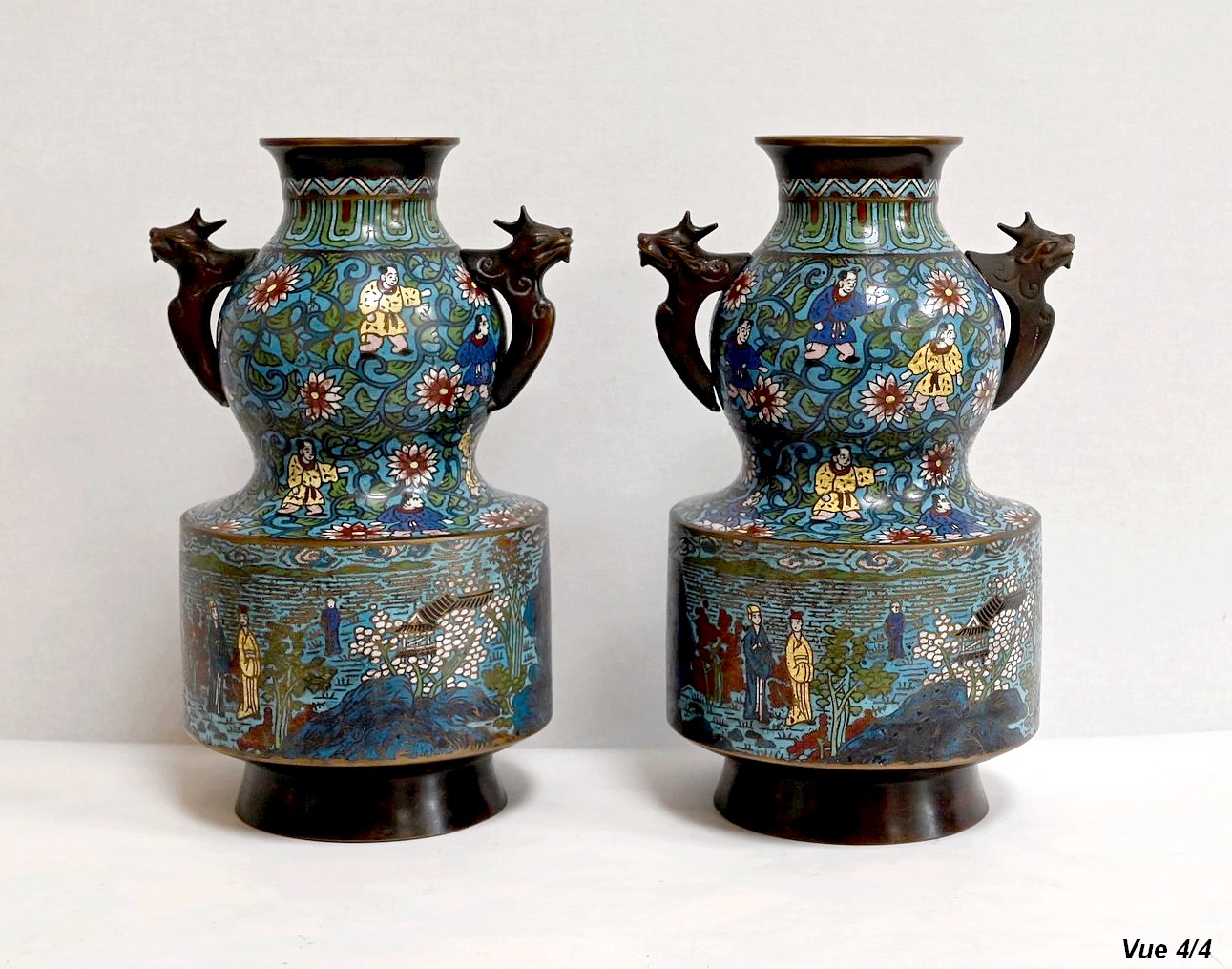 Cette paire de vase en émaux cloisonnés se compose d’une panse en deux parties. La plus basse, de forme cylindrique représente des scènes de vie japonaise, avec des personnages en kimonos et des pagodes. Différentes nuances de bleus parsemées de jaune, blanc, et vert, apportent de la profondeur à ces illustrations.