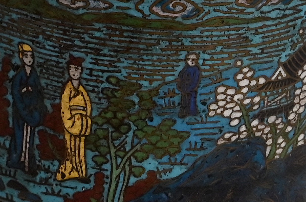 La partie plus haute, arrondie, a des anses en chiens de Fao en bronze ; des personnages se perdent dans des fleurs et feuillages, amenant au col orné de frises, puis à la lèvre en cuivre.