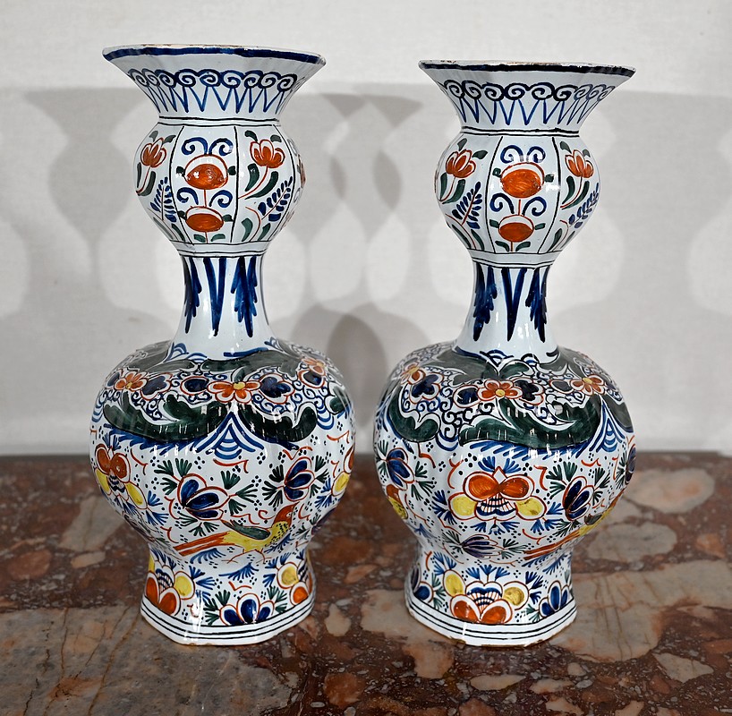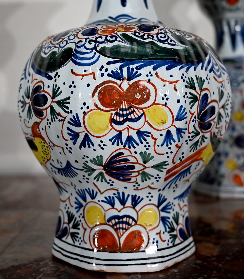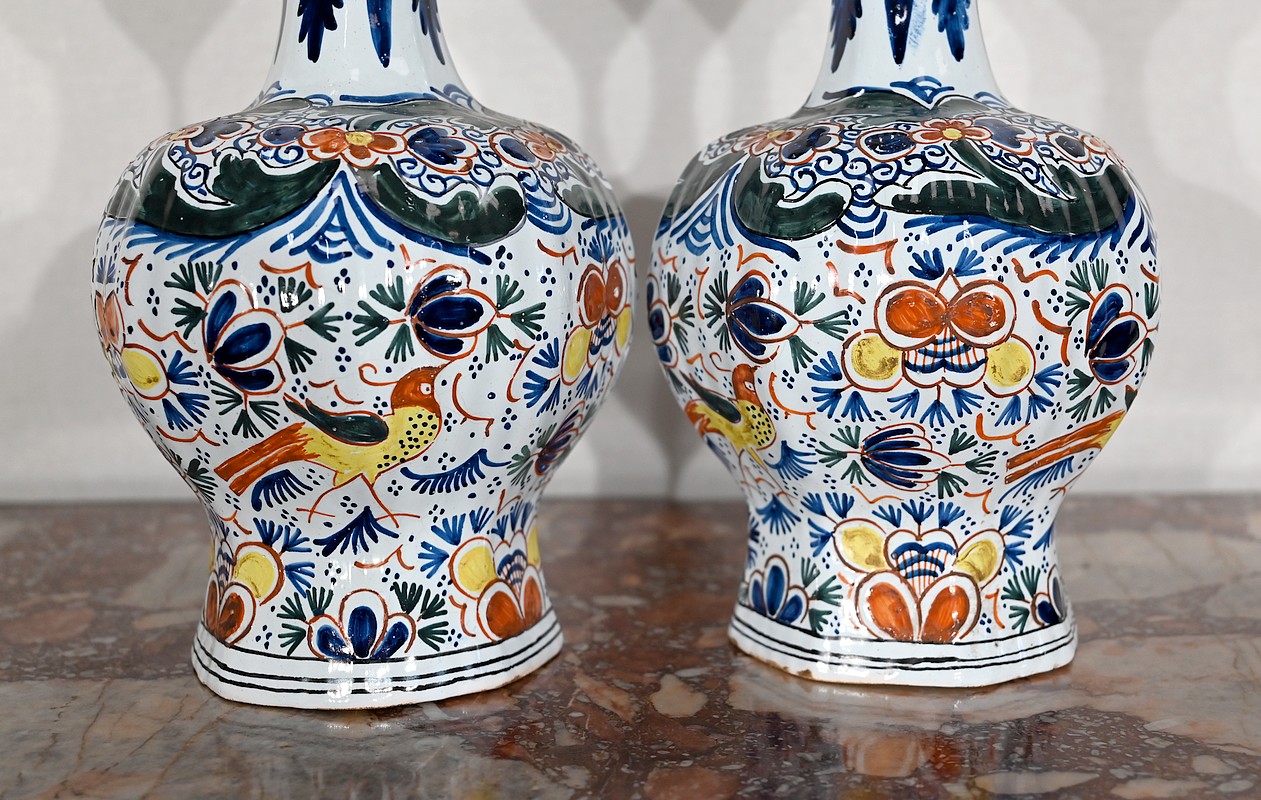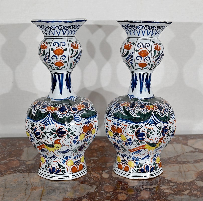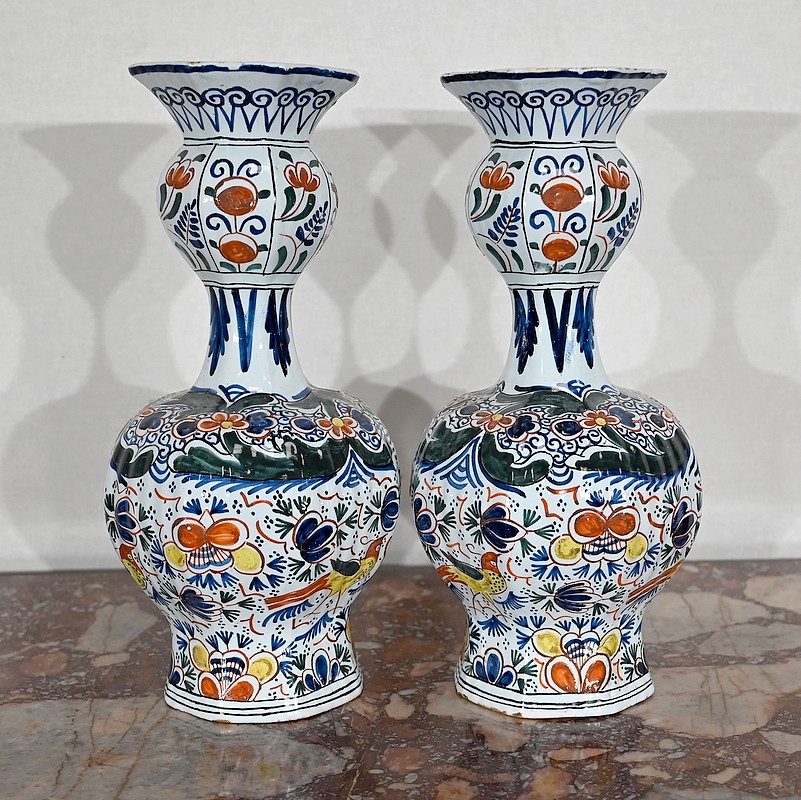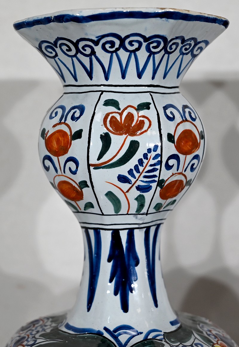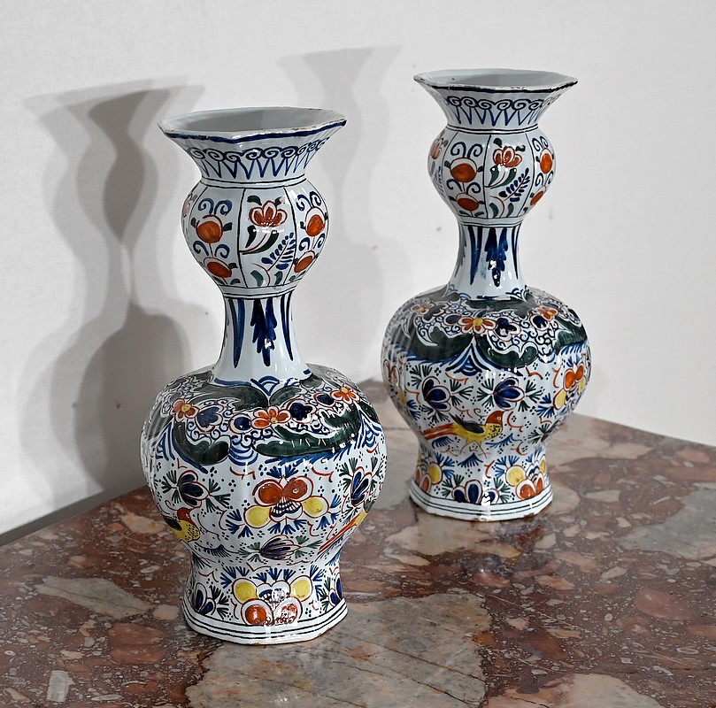 Vases en faïence de Delft du XIXe siècle, peint en polychromie, à panse ronde godronnée et col étroit se terminant par un bulbe ouvert.