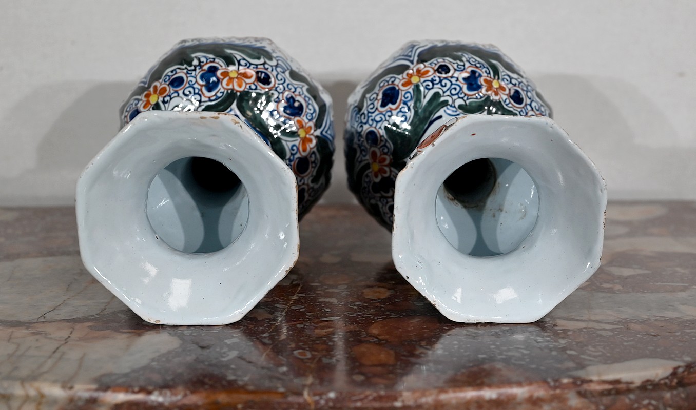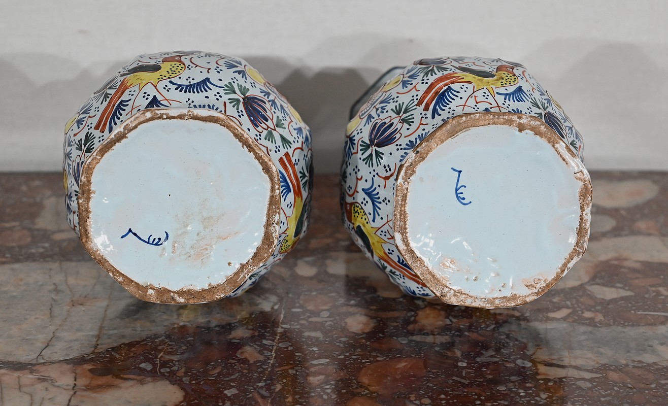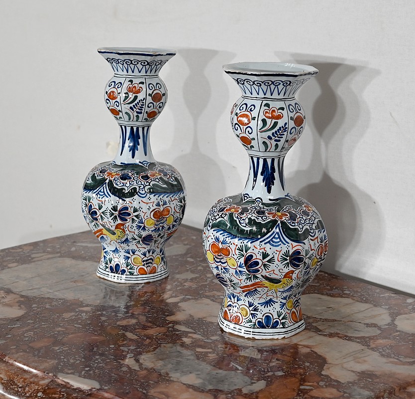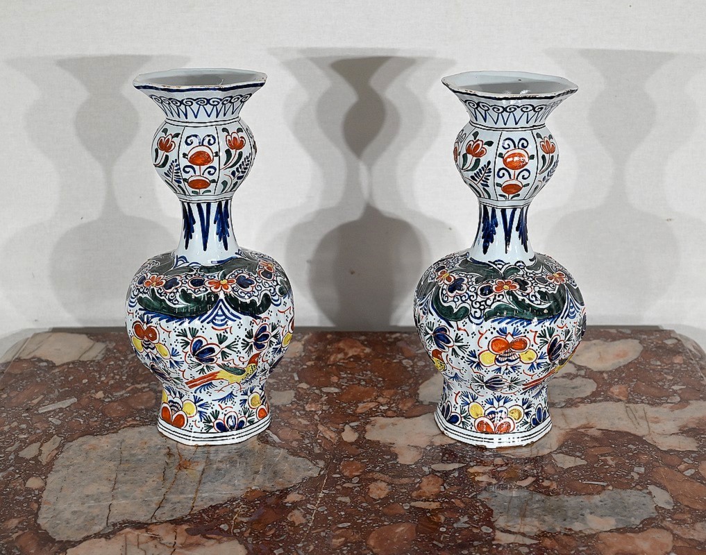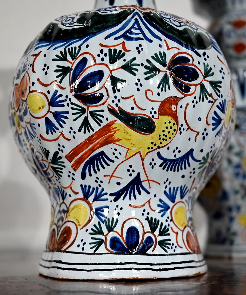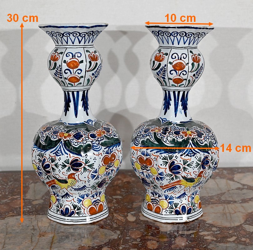 Vases en faïence de Delft du XIXe siècle, peint en polychromie, à panse ronde godronnée et col étroit se terminant par un bulbe ouvert.