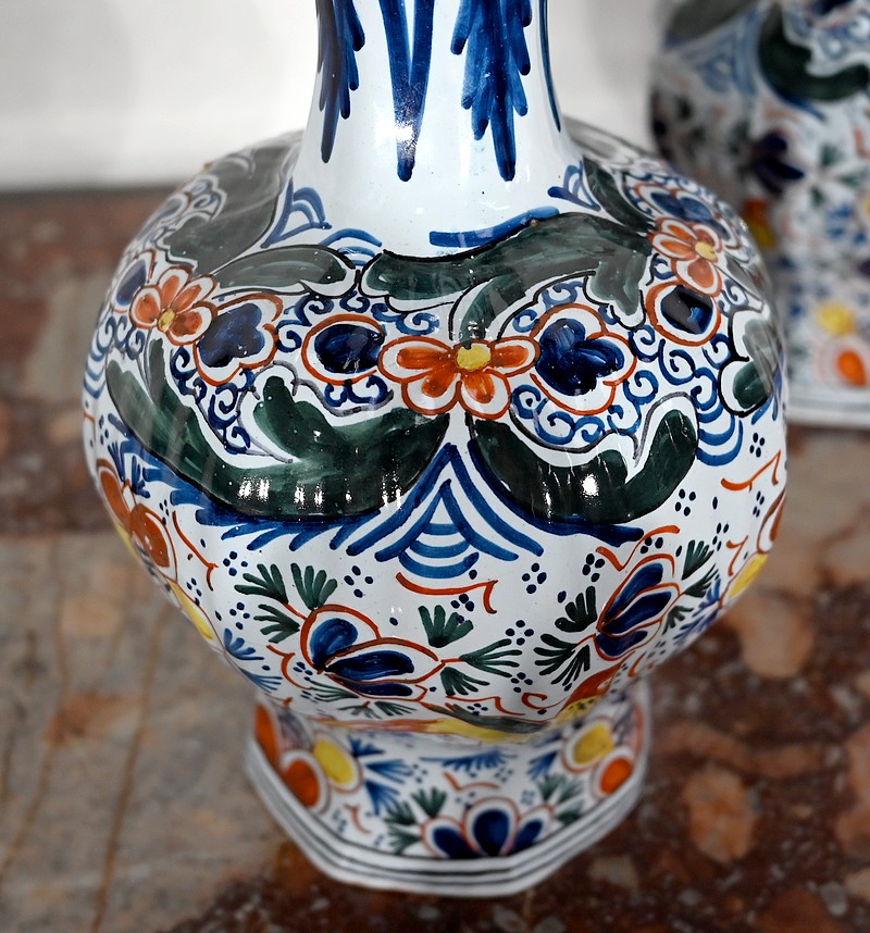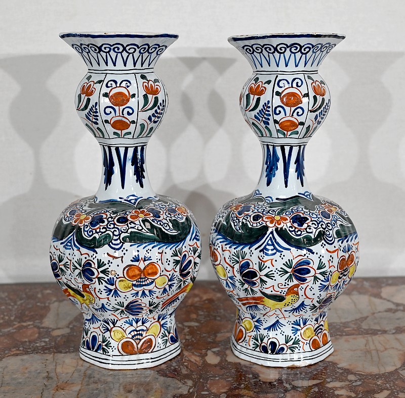 Signés au revers par un artisan de la faïencerie de Delft aux Pays-Bas, ces vases vous charmeront par leur forme originale et leurs couleurs lumineuses.