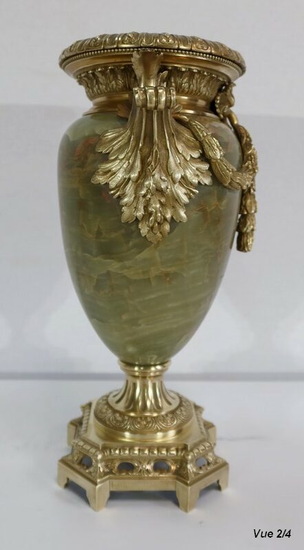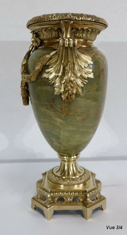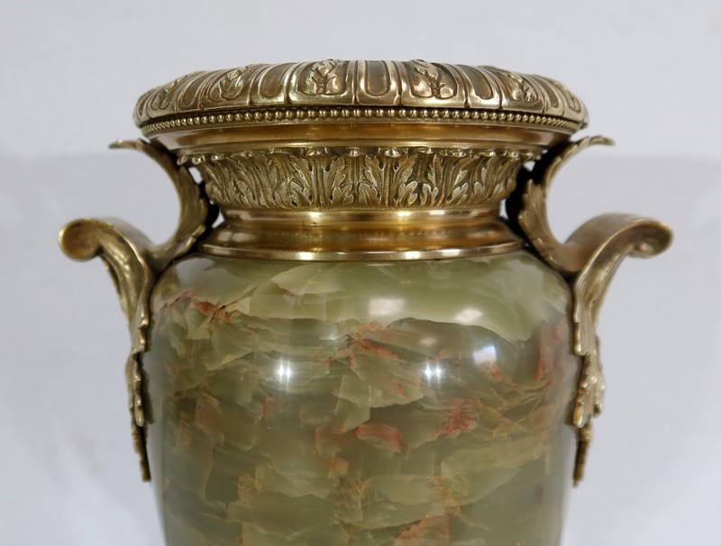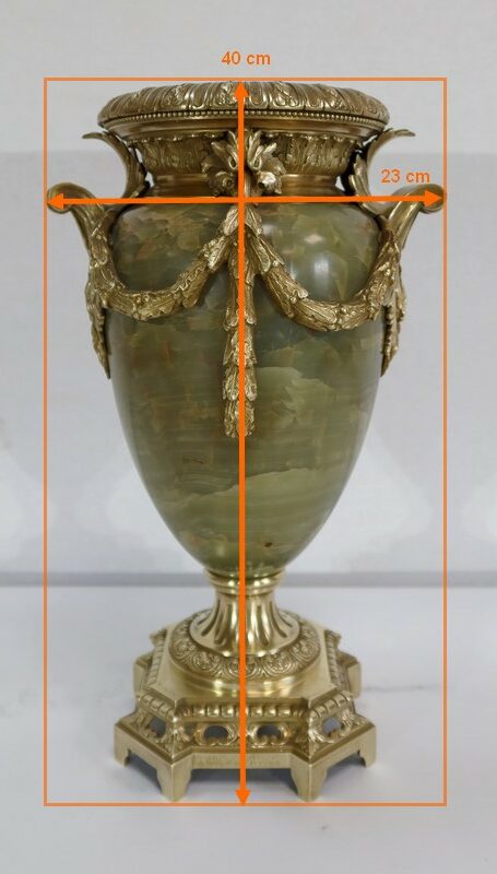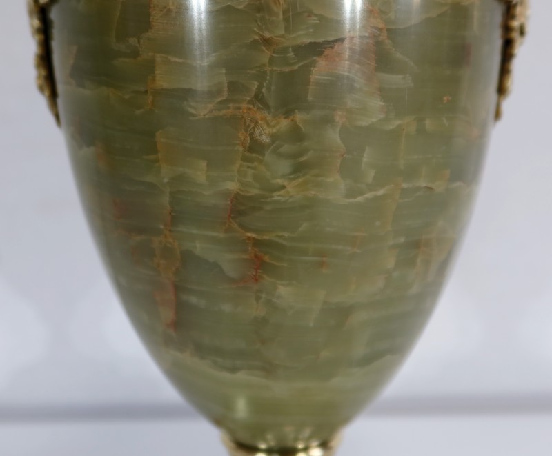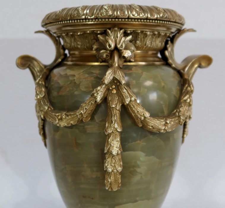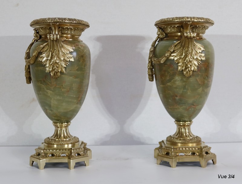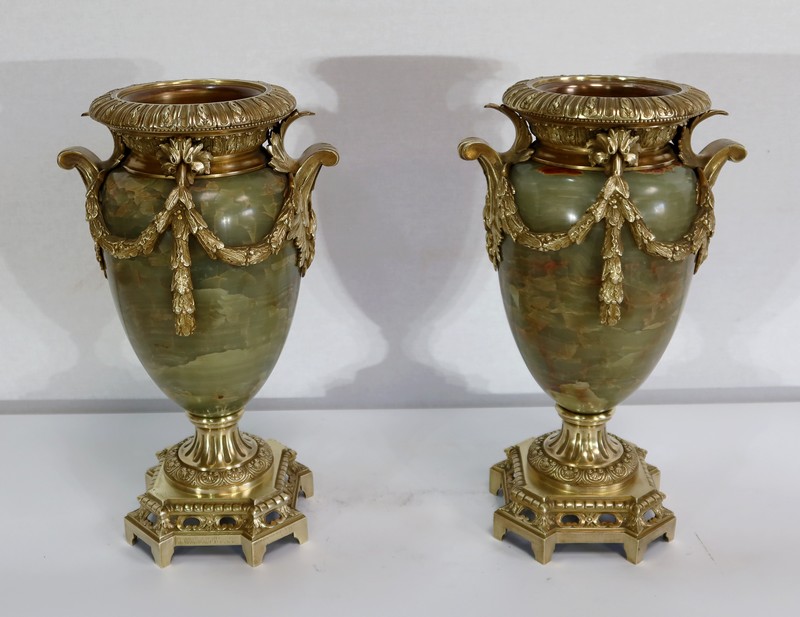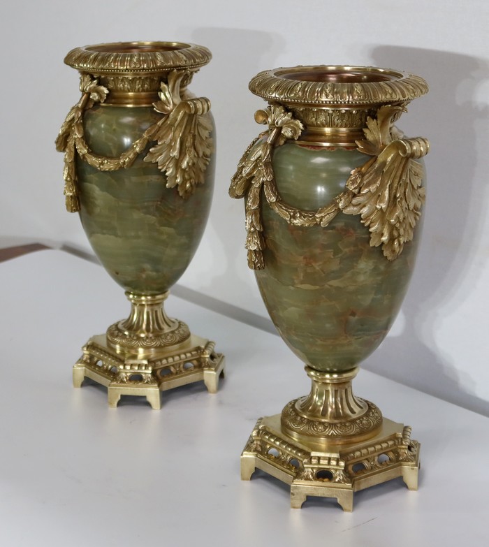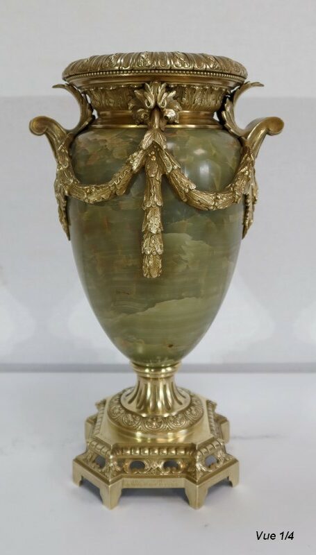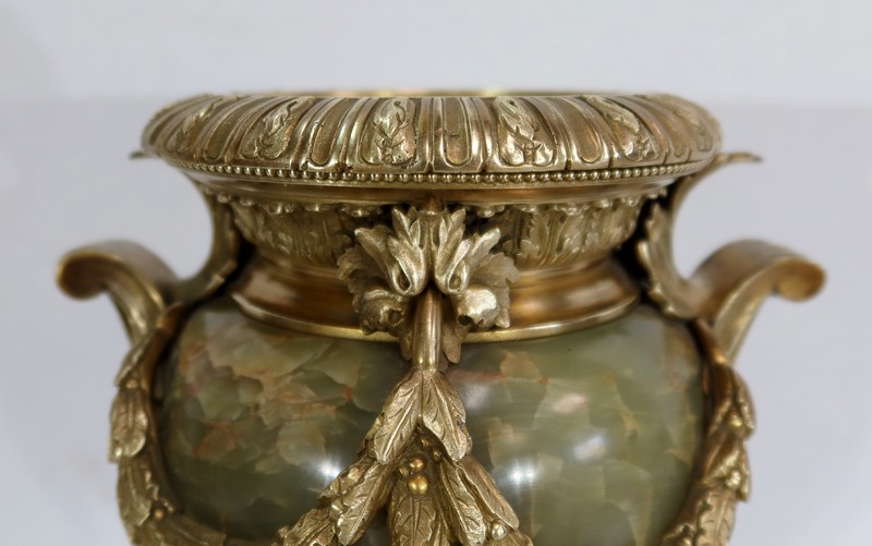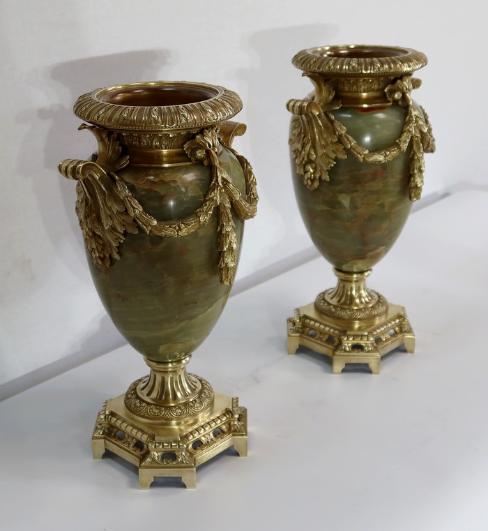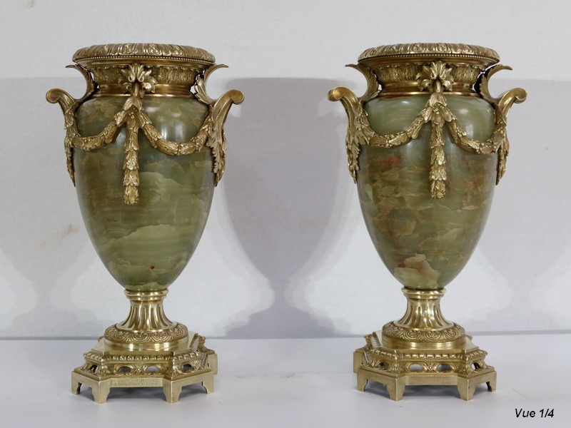 Élégante Paire de Vases de style Louis XVI, en Onyx de forme ovoïdale, enjolivé d’attributs en Bronze.