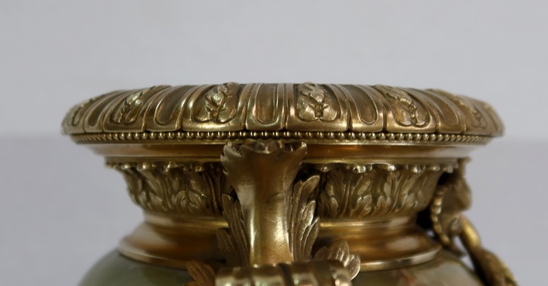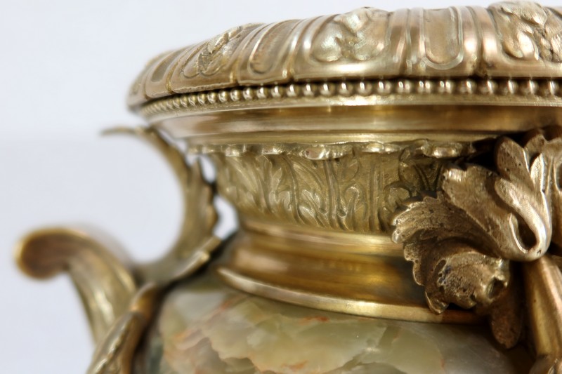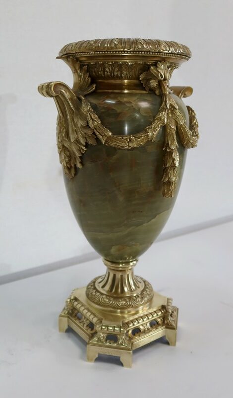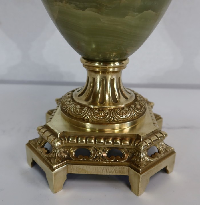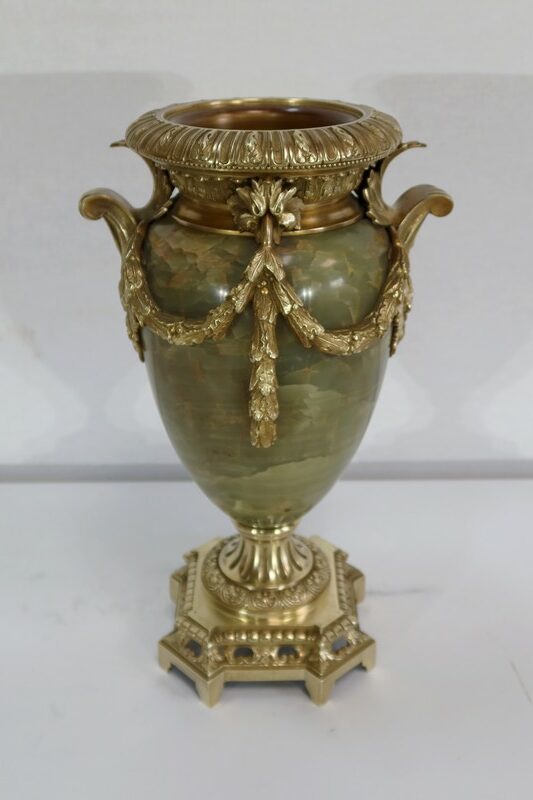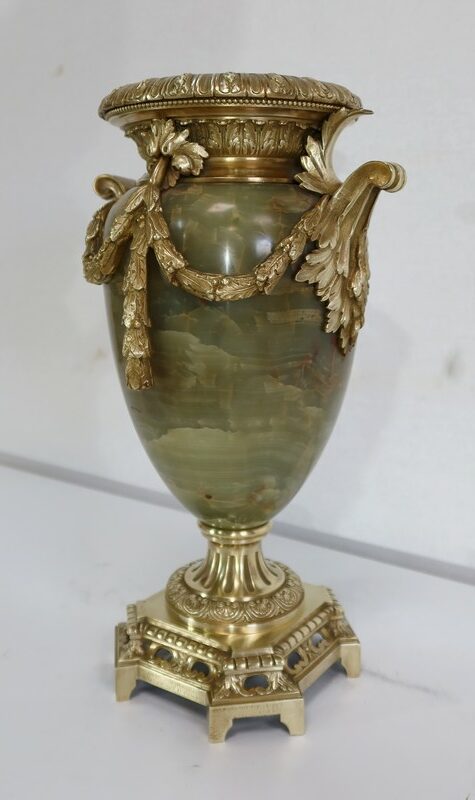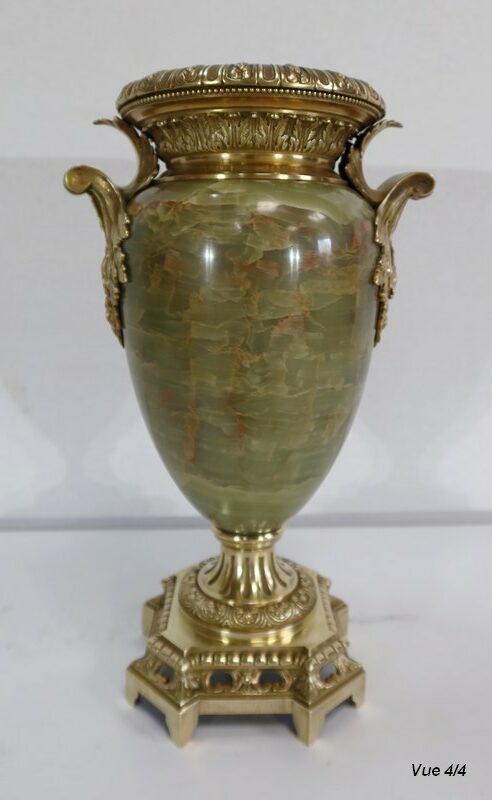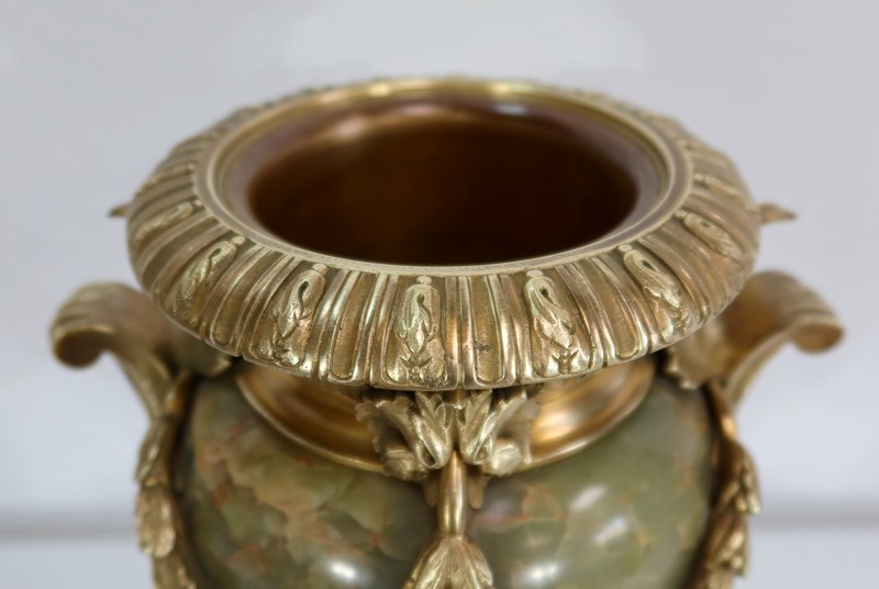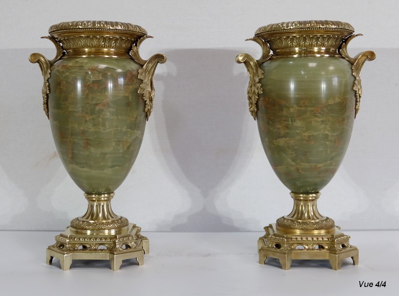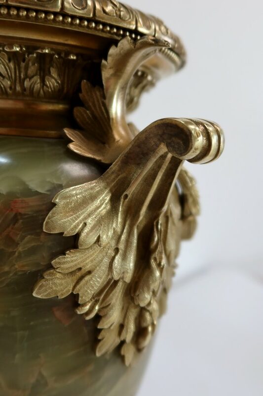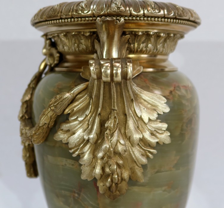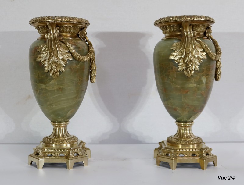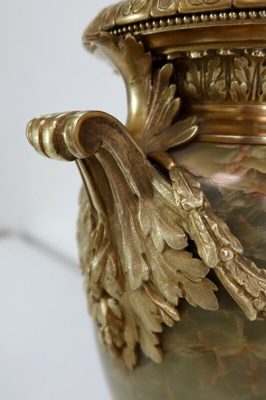 Élégante Paire de Vases de style Louis XVI, en Onyx de forme ovoïdale, enjolivé d’attributs en Bronze.