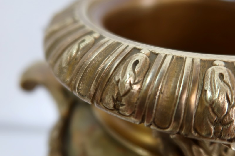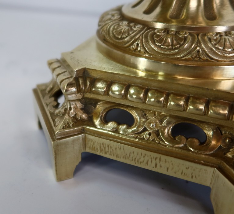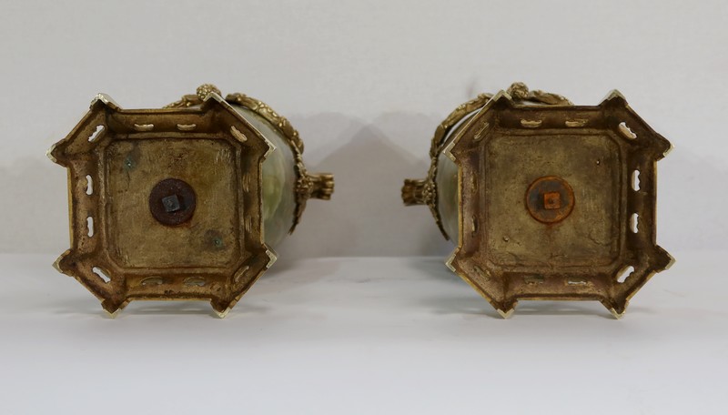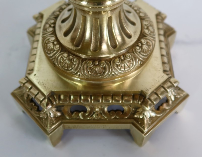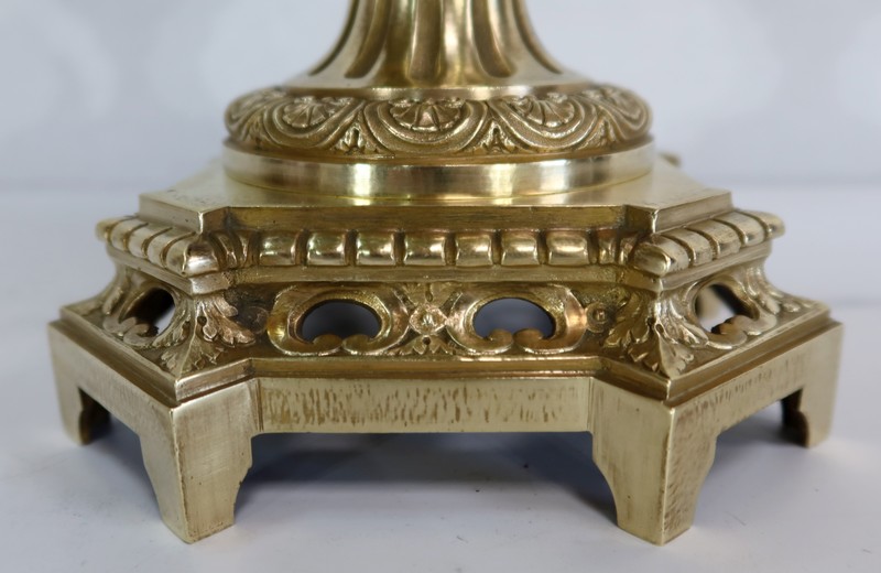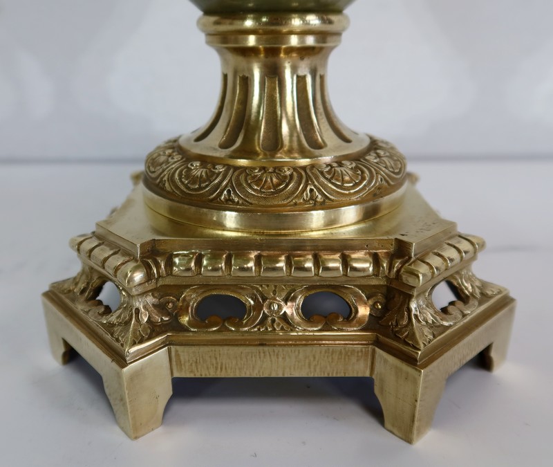 L’ensemble prend appui sur un socle de section carré à petits pans coupés, en bronze joliment ouvragé et ajouré.