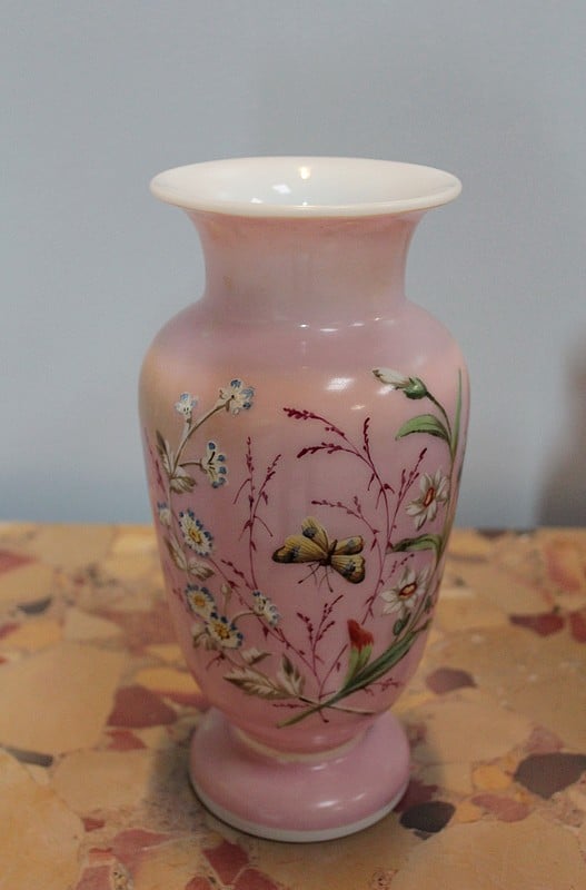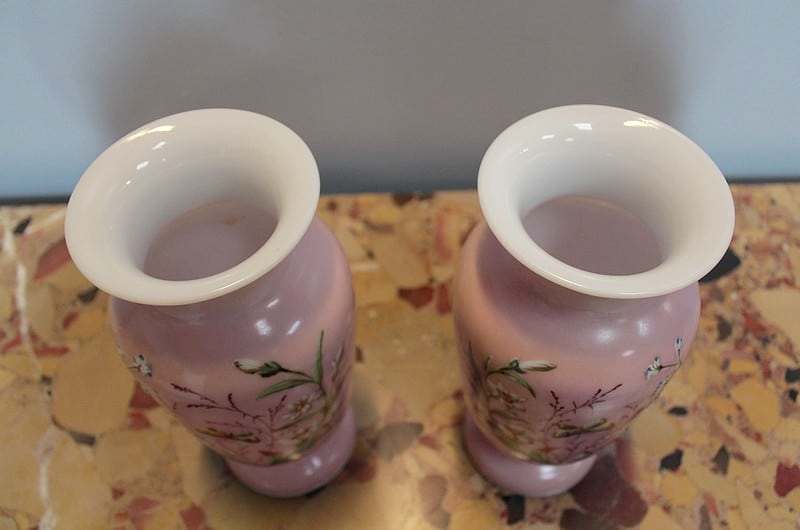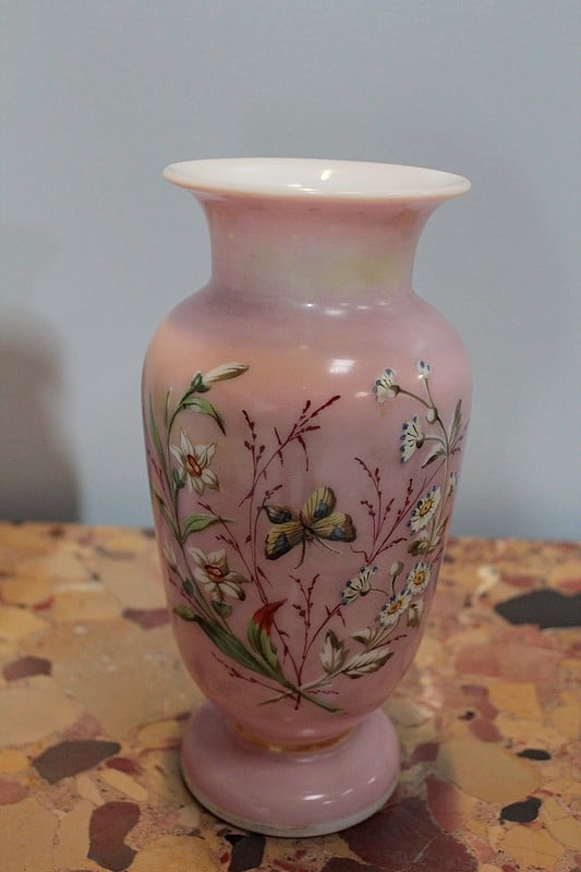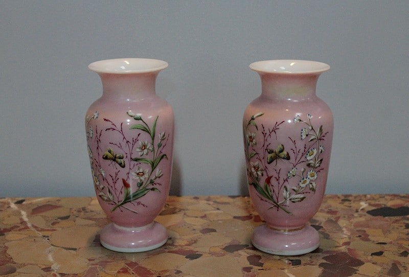 Paire de Vases en Opaline rose à décor de branches fleuries et de papillons. Époque 1920