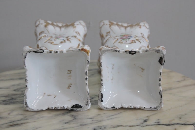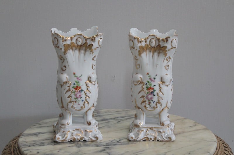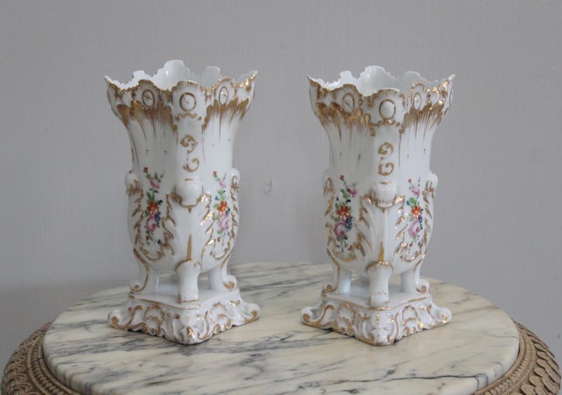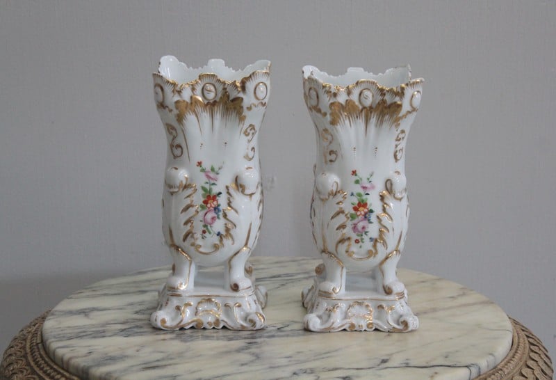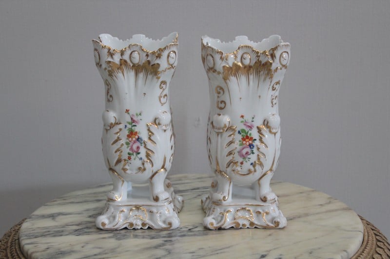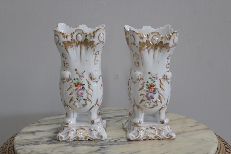 Paire de vases en porcelaine blanche de Paris, rehaussés de rinceaux d’or et décorés de bouquets de fleurs polychromes sur les quatre faces.