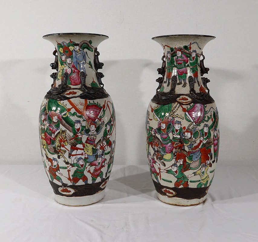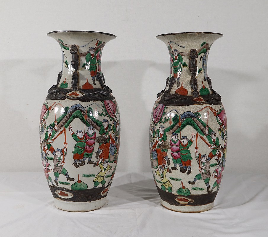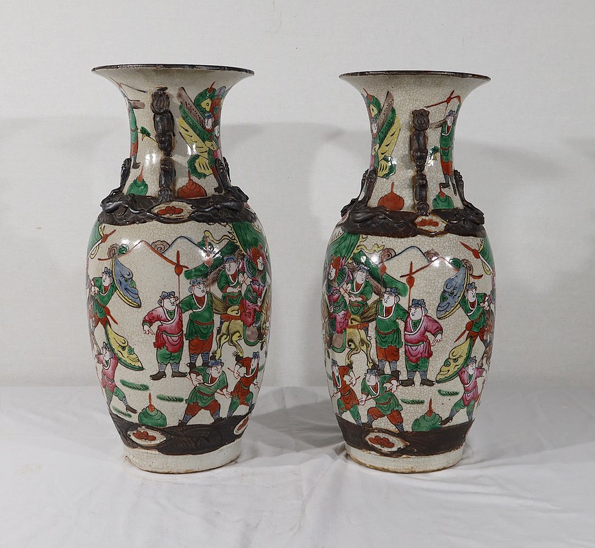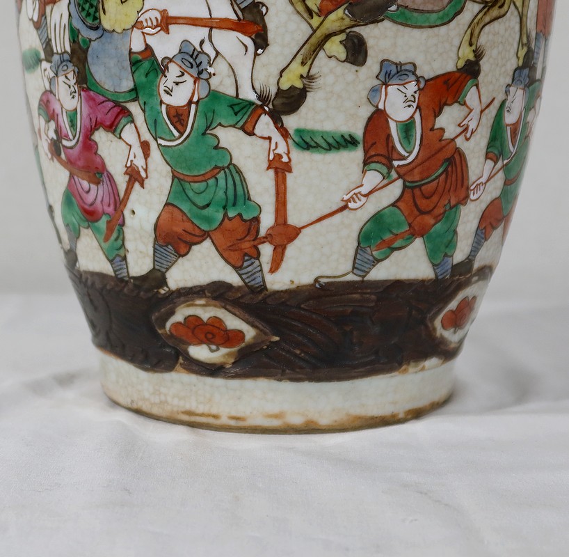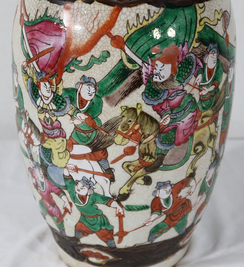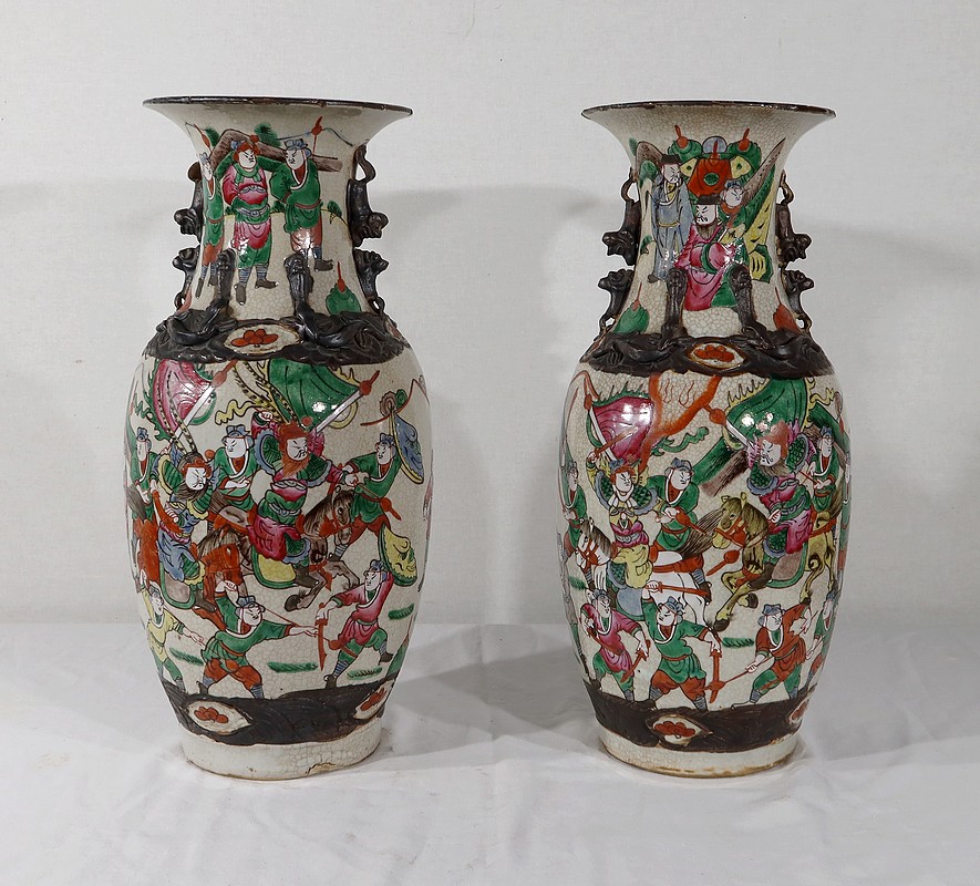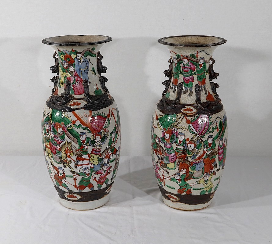 Paire de vases en porcelaine chinoise de Nankin, à fond craquelé beige à décor émaillé polychrome. Chaque vase présente un décor tournant d’une scène de bataille. De nombreux guerriers asiatiques aux tenues colorées sont peints, entourés d’un paysage stylisé.