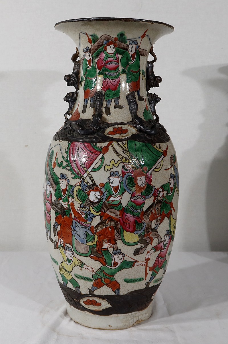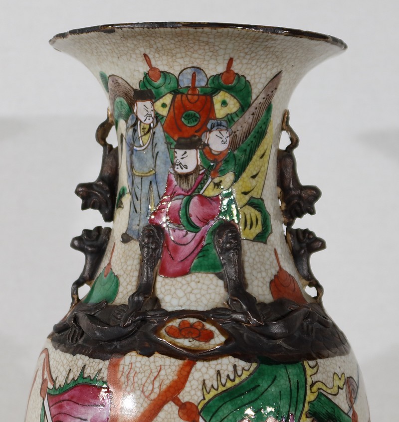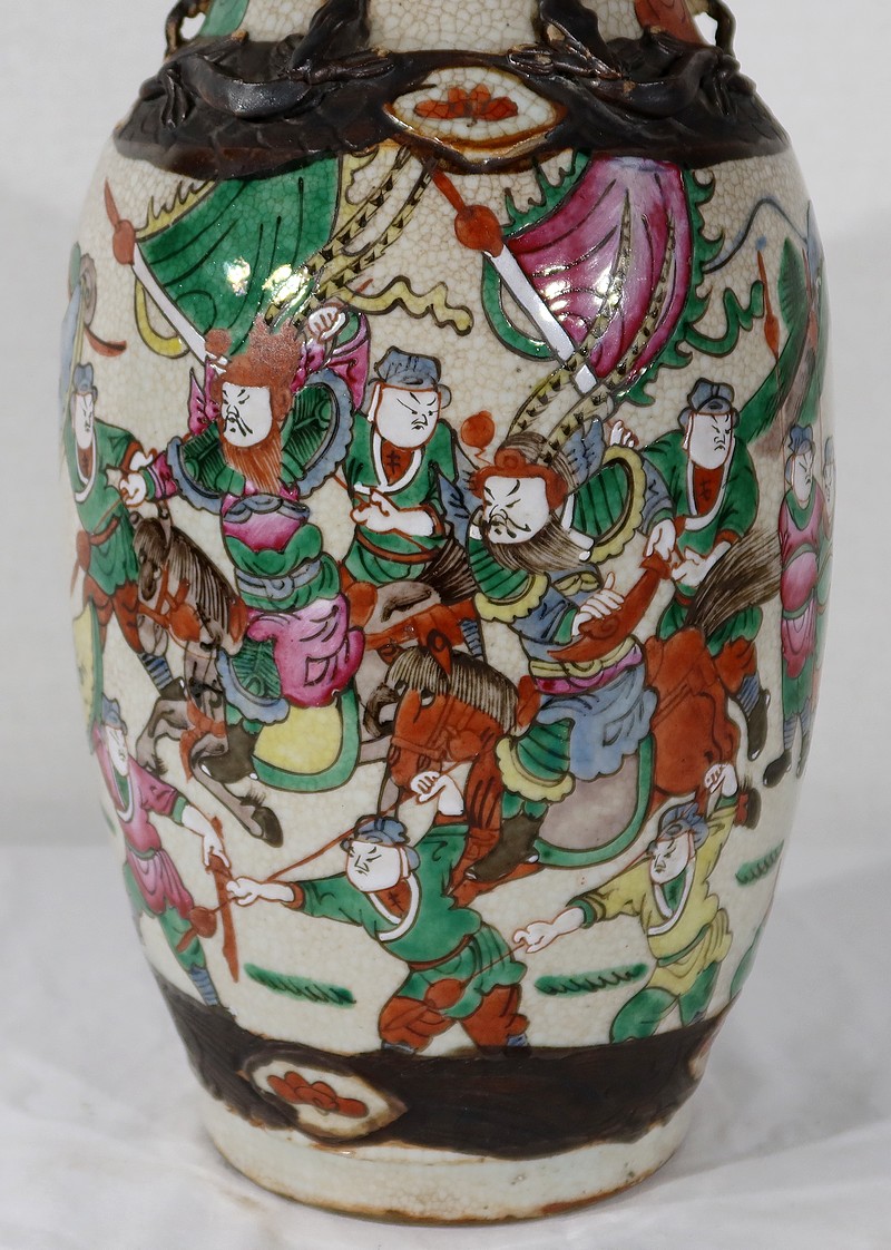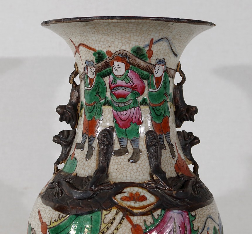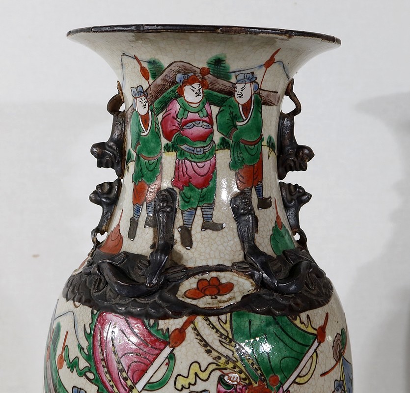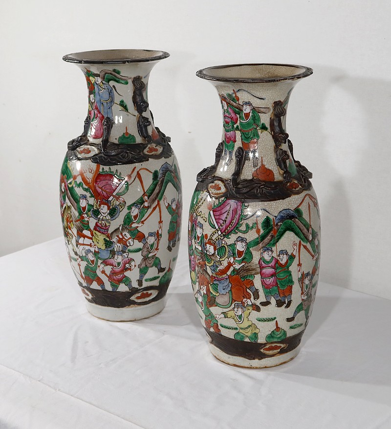 Paire de vases en porcelaine chinoise de Nankin, à fond craquelé beige à décor émaillé polychrome. Chaque vase présente un décor tournant d’une scène de bataille. De nombreux guerriers asiatiques aux tenues colorées sont peints, entourés d’un paysage stylisé.