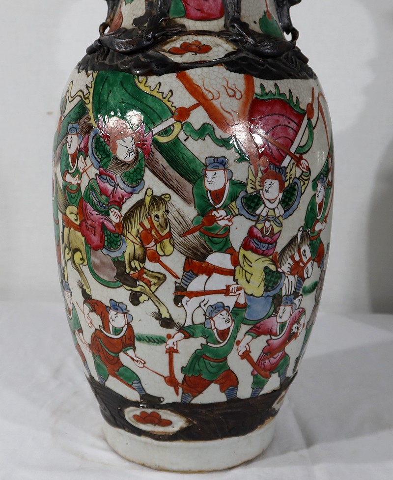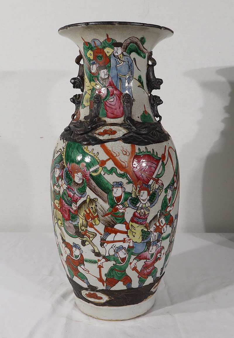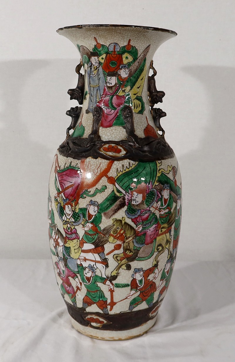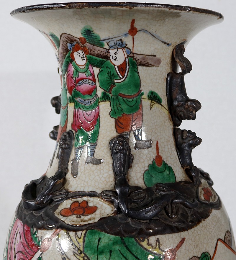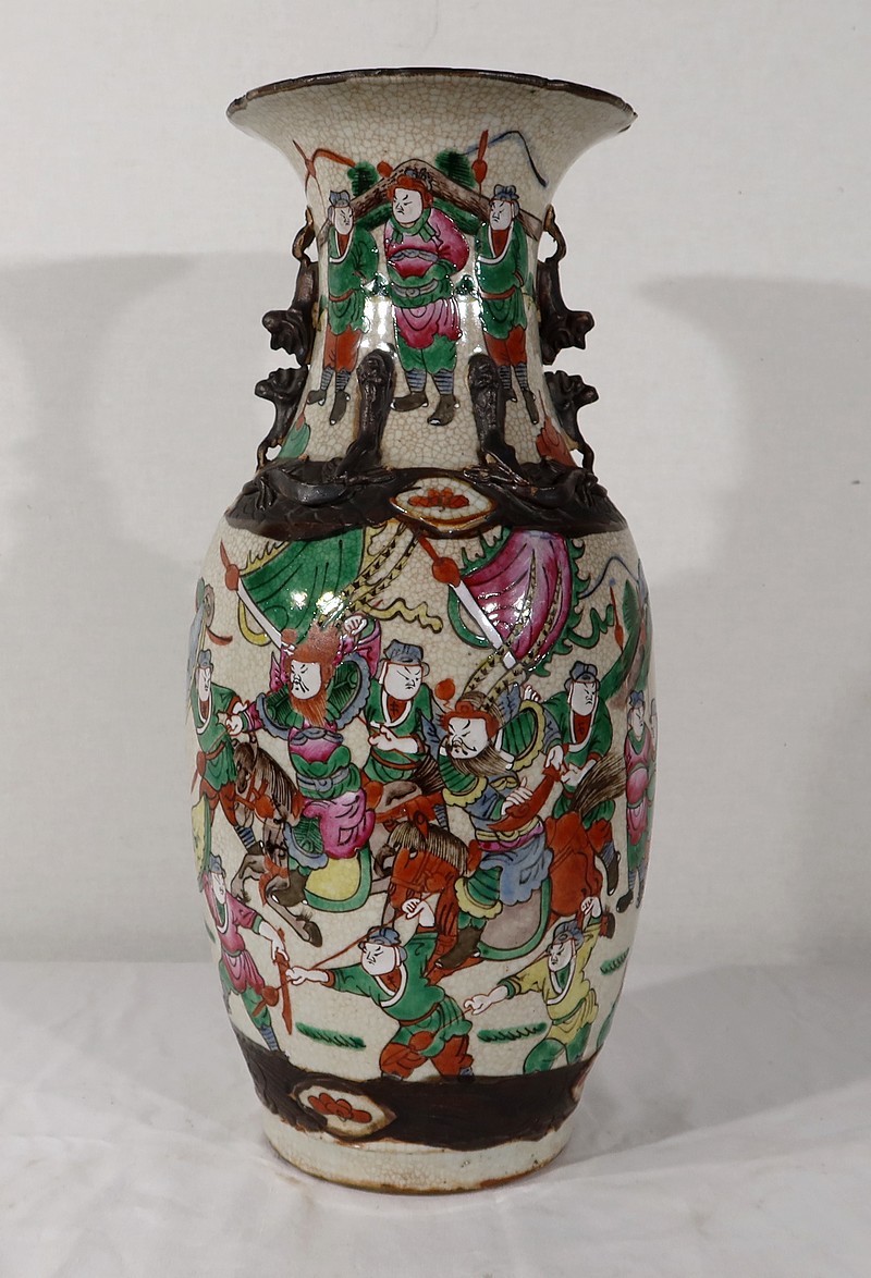 Paire de vases en porcelaine chinoise de Nankin, à fond craquelé beige à décor émaillé polychrome. Chaque vase présente un décor tournant d’une scène de bataille. De nombreux guerriers asiatiques aux tenues colorées sont peints, entourés d’un paysage stylisé.