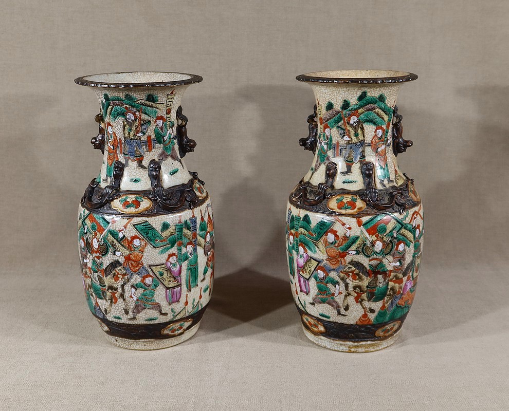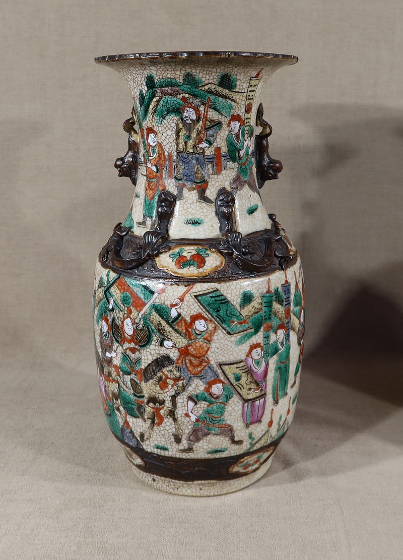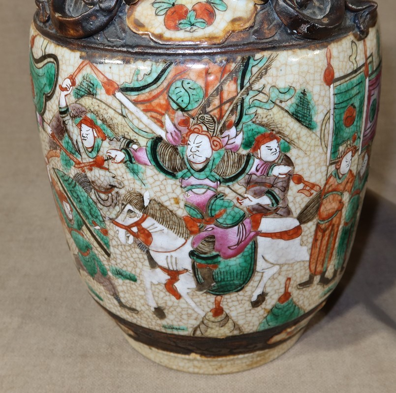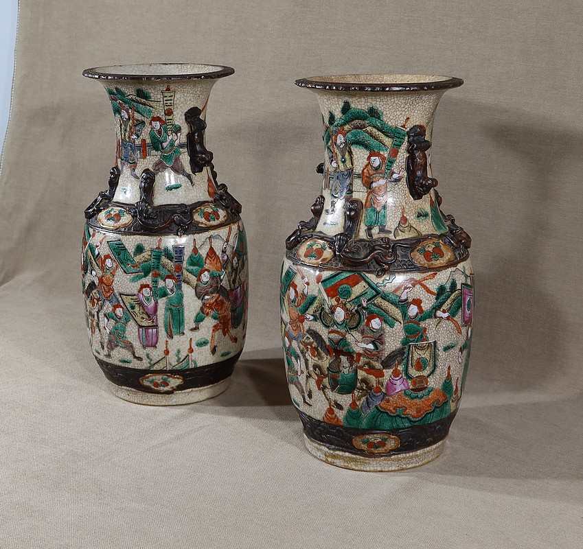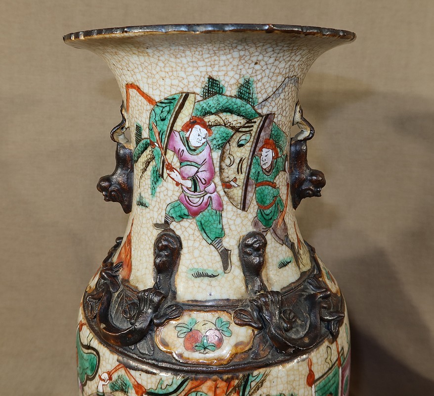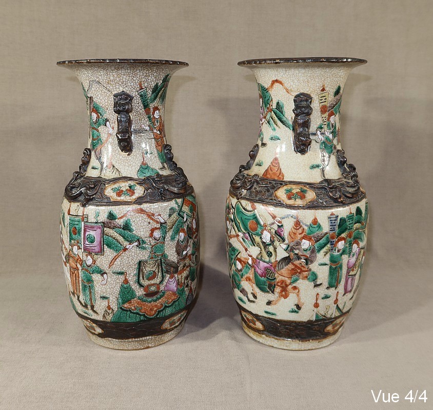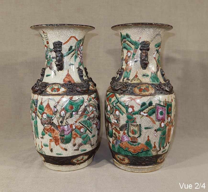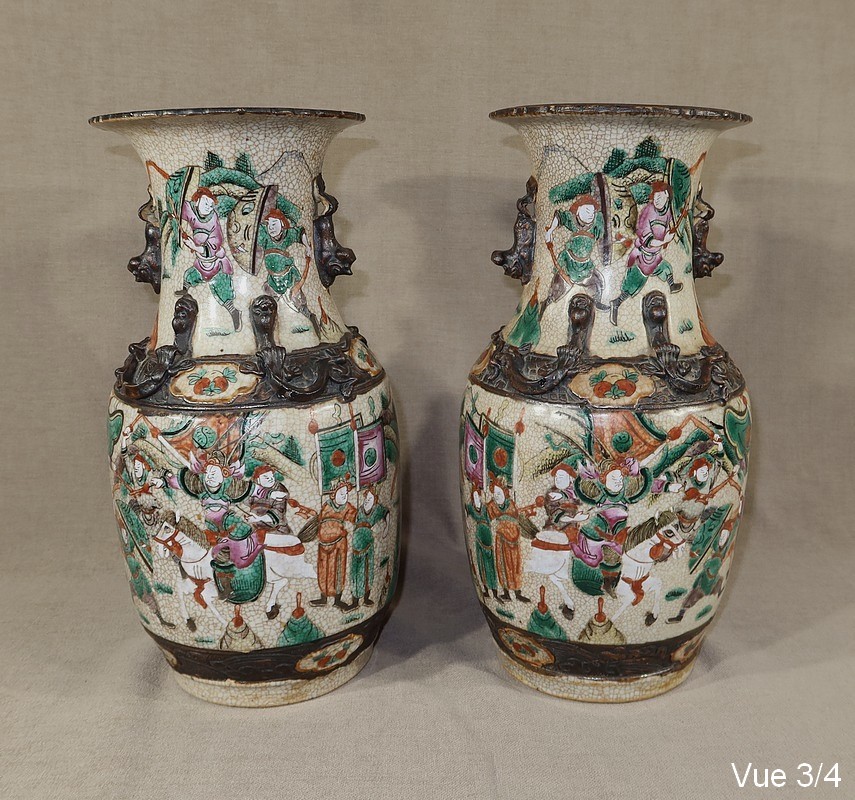 Paire de vases pansus en porcelaine chinoise de Nankin à décor polychrome tournant d’une scène de bataille. De nombreux guerriers asiatiques aux tenues colorées sont peints sur fond de paysage stylisé. Les bords sont habillés d’une collerette ornée de dragons orientaux. Le col présente des chiens de Fô en guise d’anses.