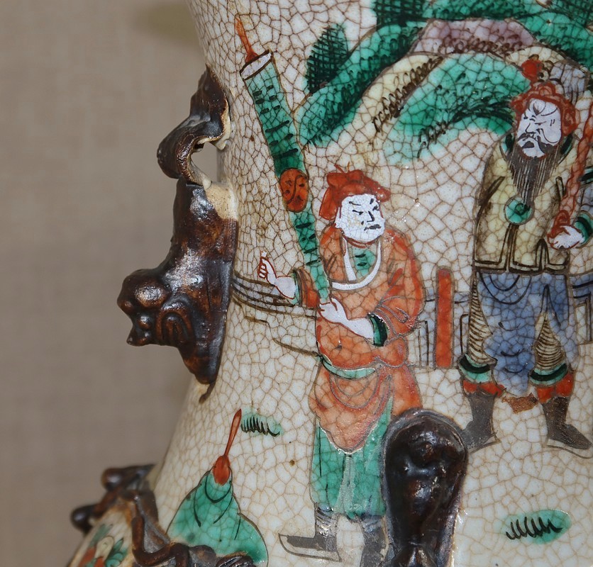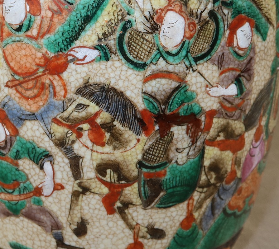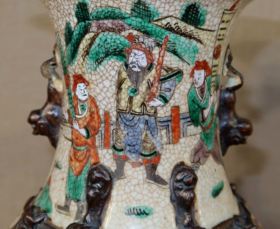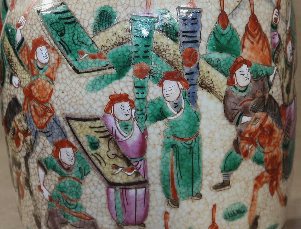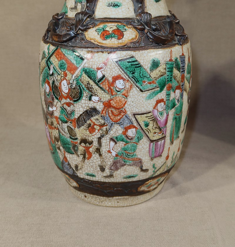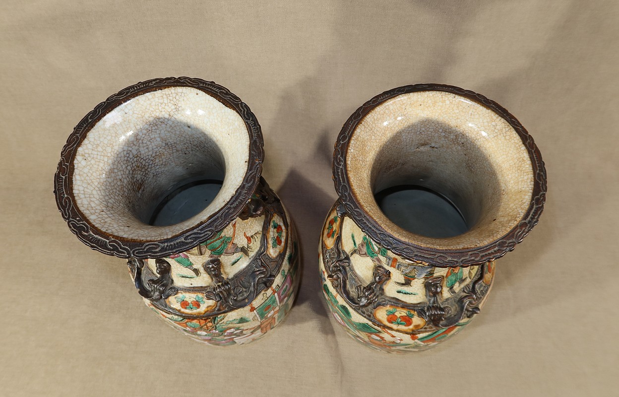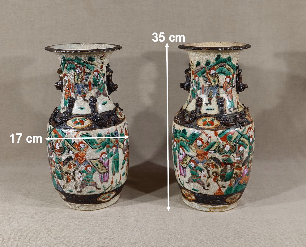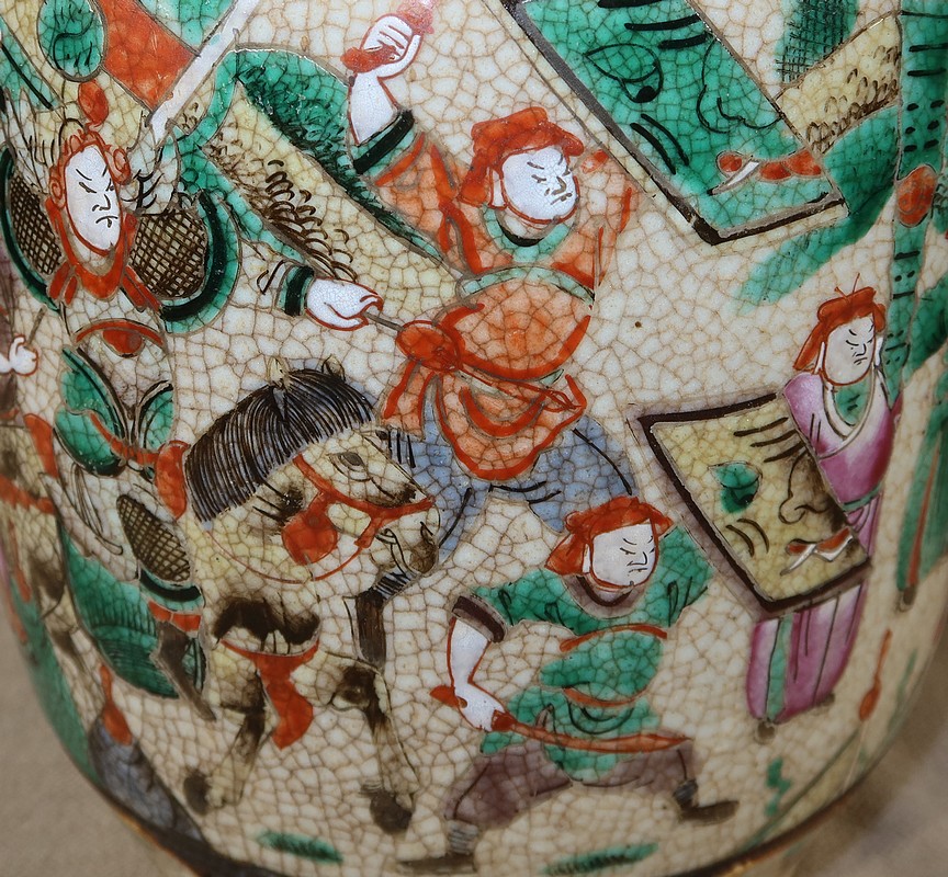Paire de vases pansus en porcelaine chinoise de Nankin à décor polychrome tournant d’une scène de bataille. De nombreux guerriers asiatiques aux tenues colorées sont peints sur fond de paysage stylisé. Les bords sont habillés d’une collerette ornée de dragons orientaux. Le col présente des chiens de Fô en guise d’anses.
