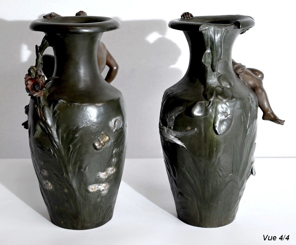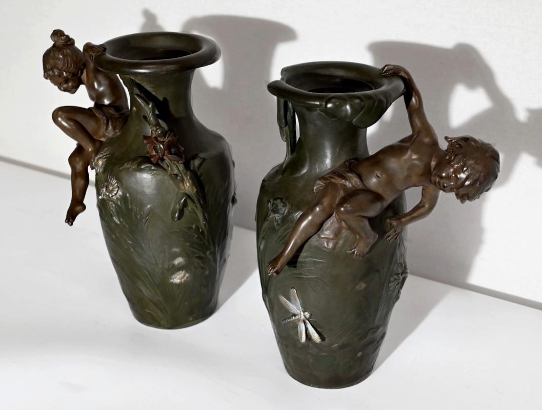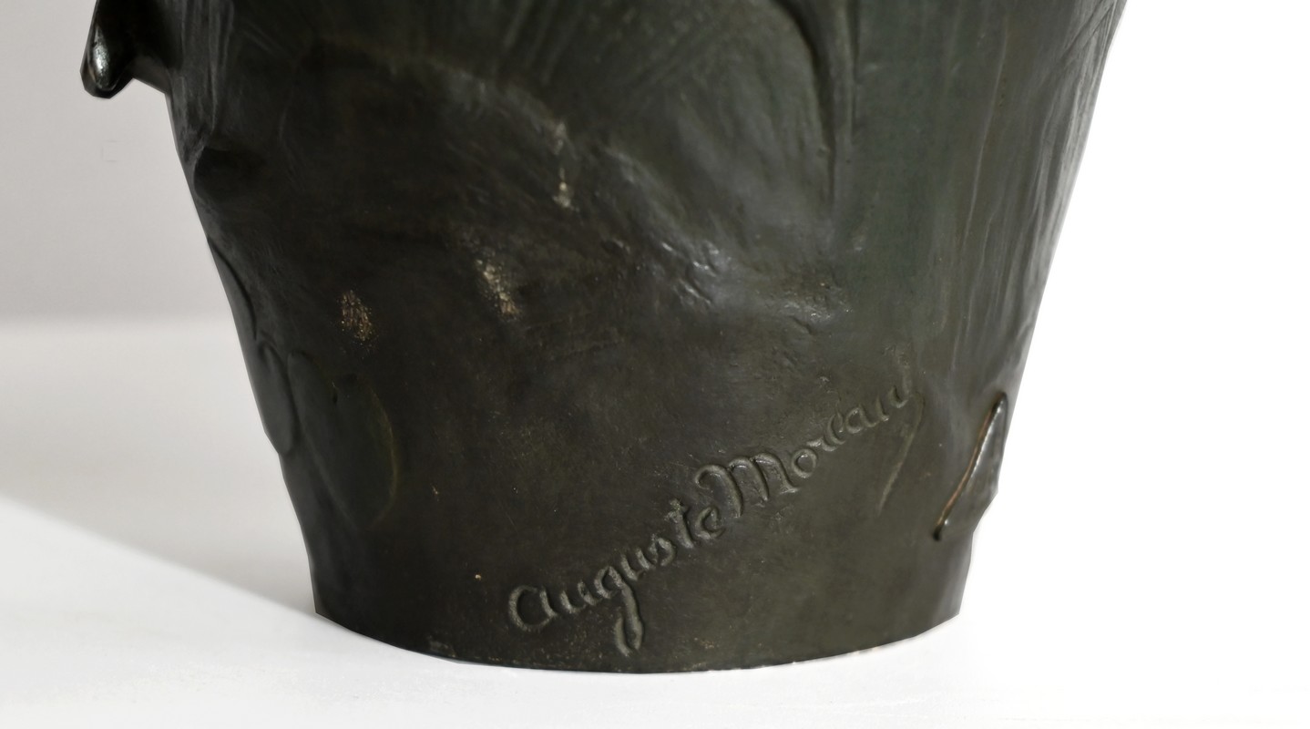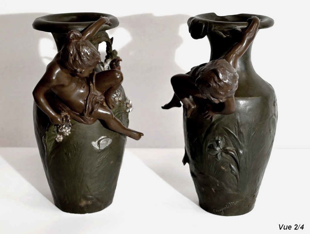 Paire de vases en régule à double patines, signés Auguste Moreau (1834 –1917). Fils du sculpteur Jean-Baptiste-Louis-Joseph Moreau et frère cadet des sculpteurs Hippolyte et Mathurin Moreau, il est reconnu pour produire essentiellement des bronzes d’art d’exception. N’ayant jamais reçu de récompense officielle, cette notoriété n’interviendra que post-mortem.