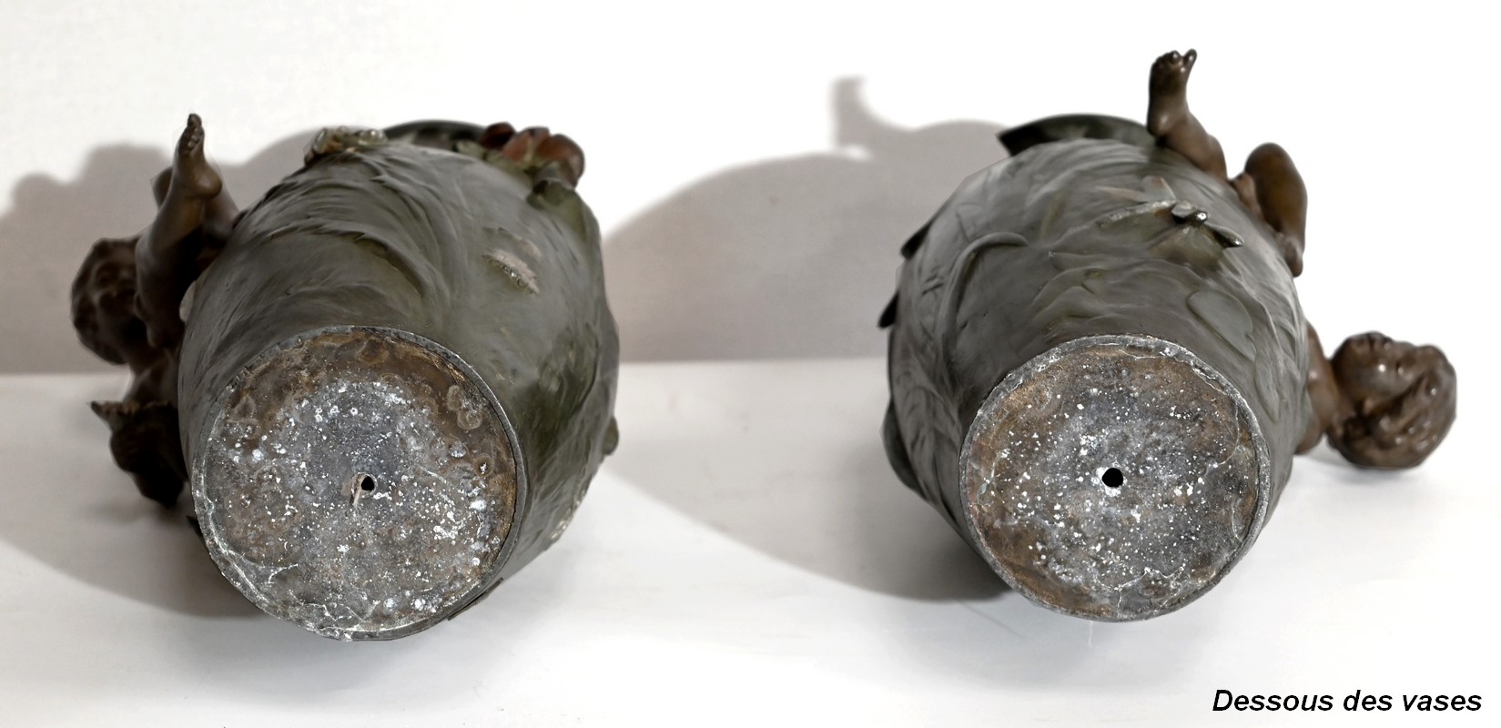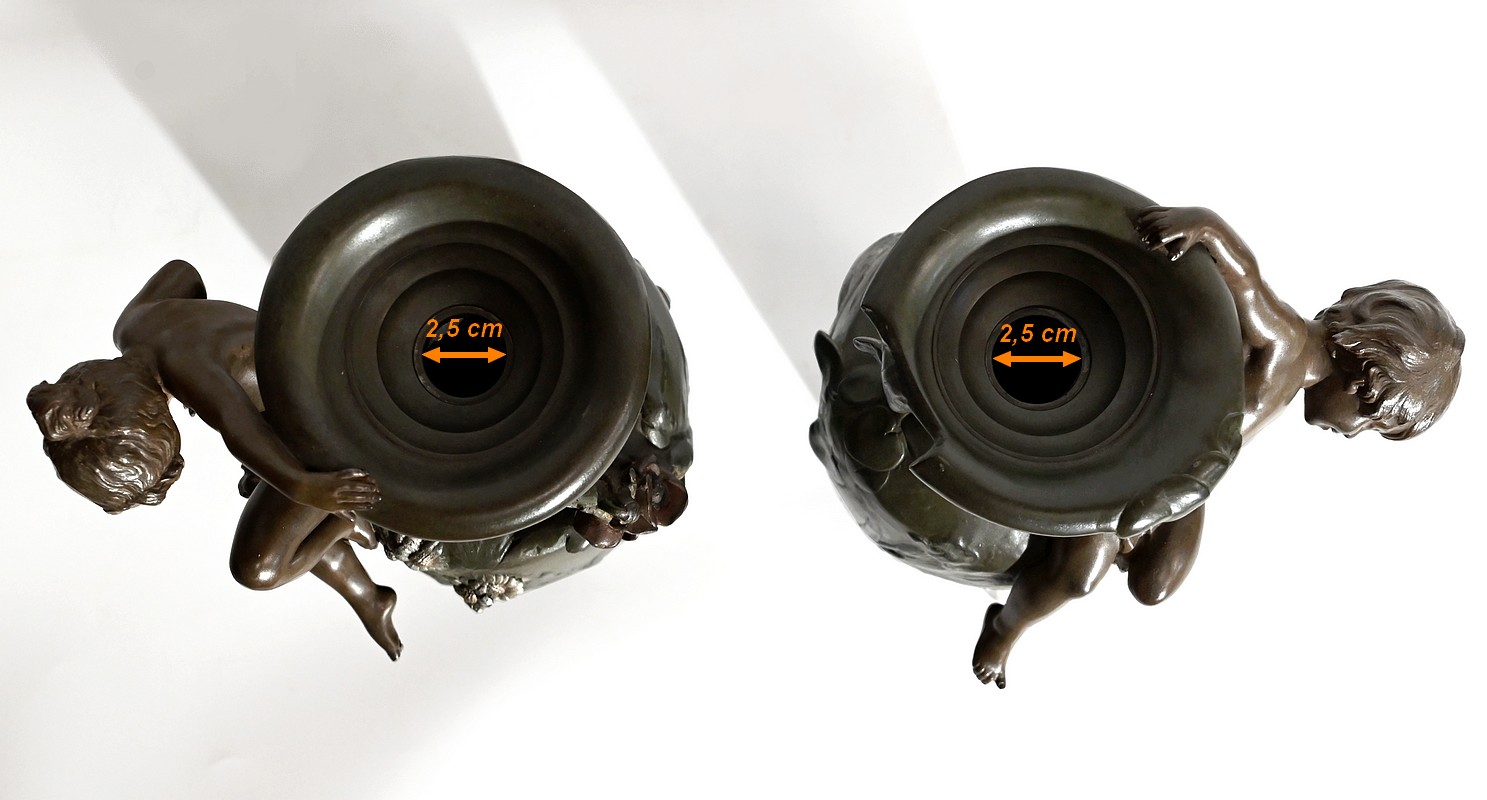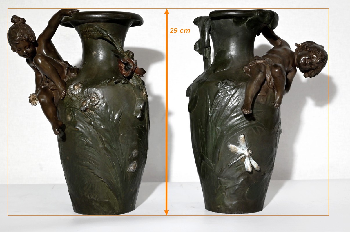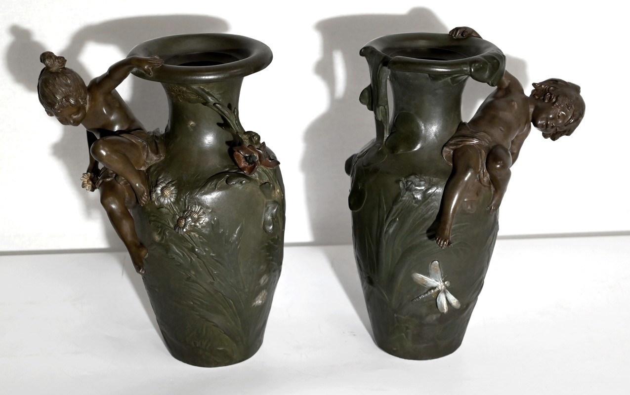 Paire de vases en régule à double patines, signés Auguste Moreau (1834 –1917). Fils du sculpteur Jean-Baptiste-Louis-Joseph Moreau et frère cadet des sculpteurs Hippolyte et Mathurin Moreau, il est reconnu pour produire essentiellement des bronzes d’art d’exception. N’ayant jamais reçu de récompense officielle, cette notoriété n’interviendra que post-mortem.