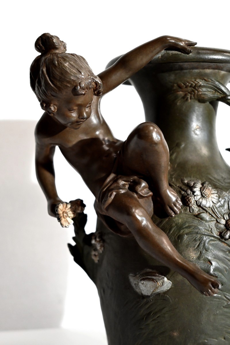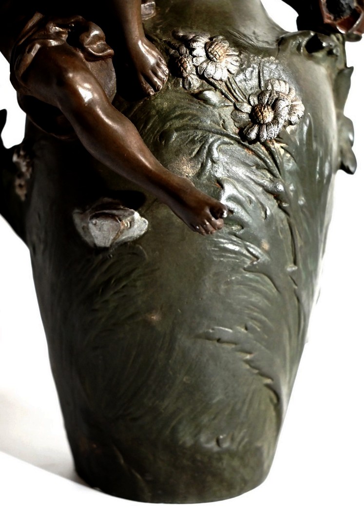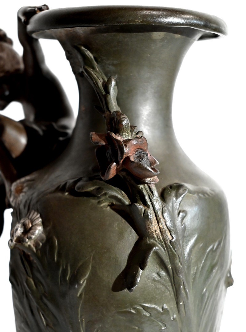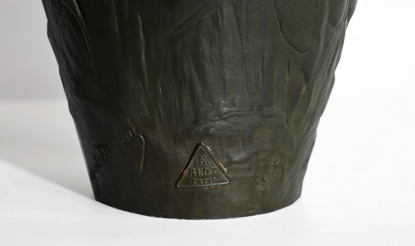 Cette production artistique, signée A. Moreau, présente le cachet du fondeur, Eugène Blot Paris, au pied du vase.