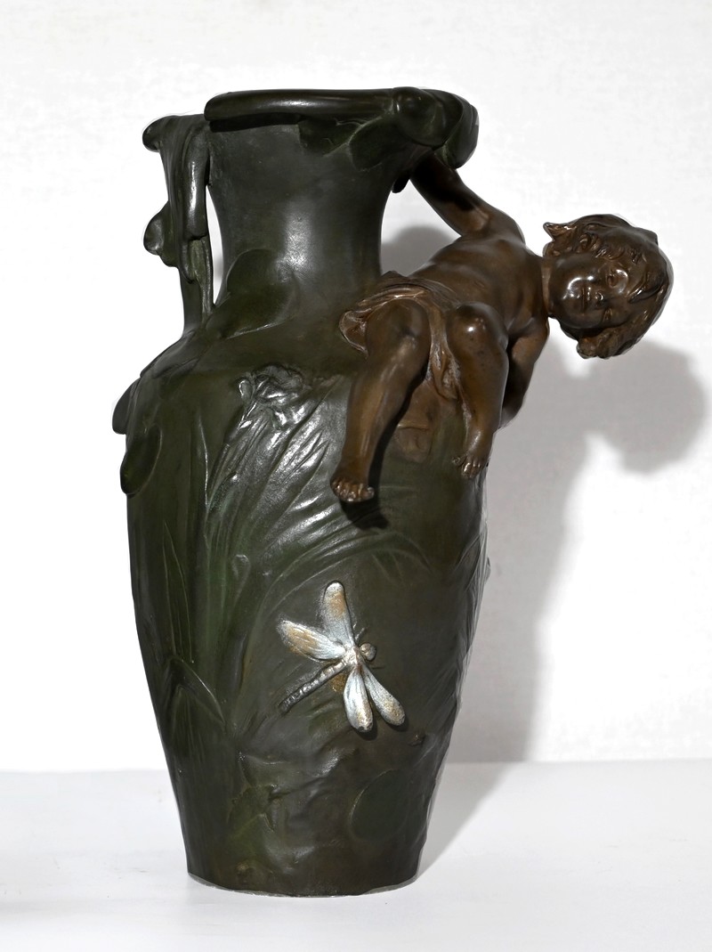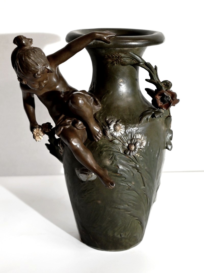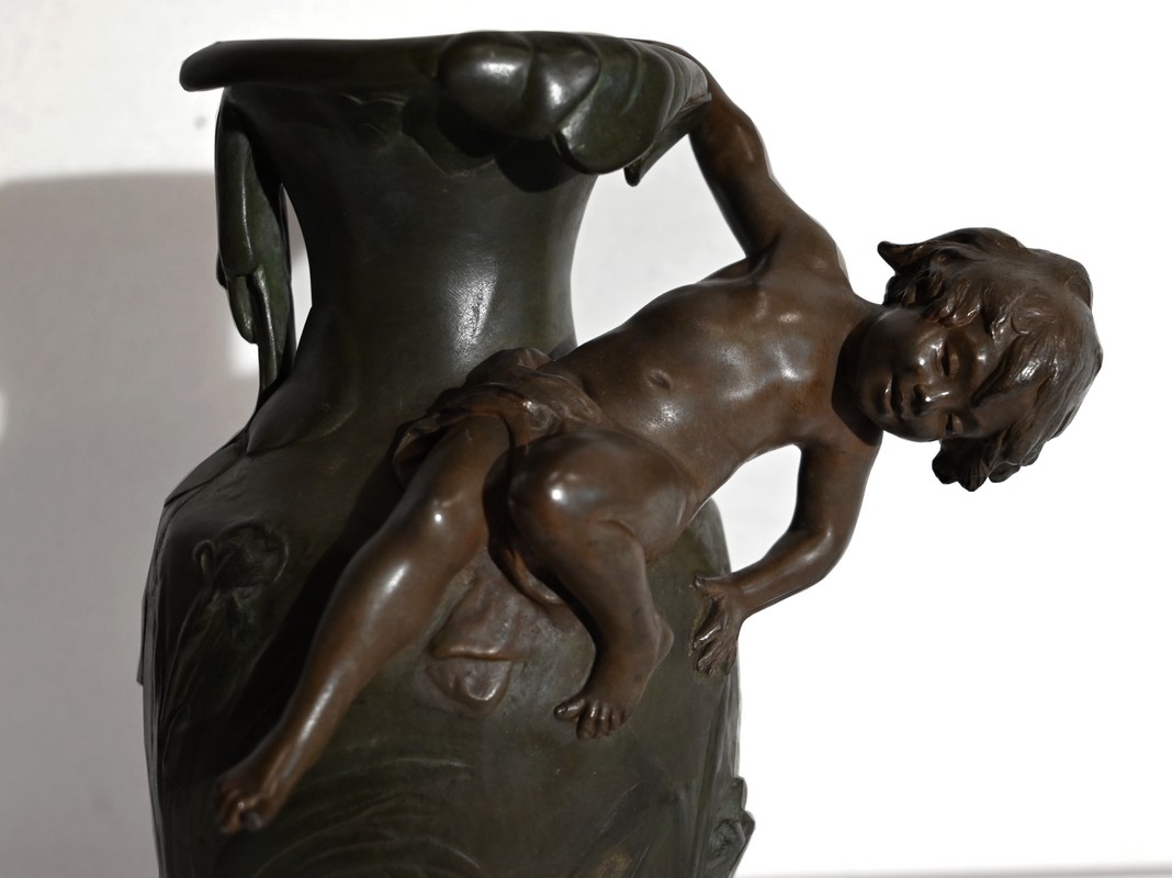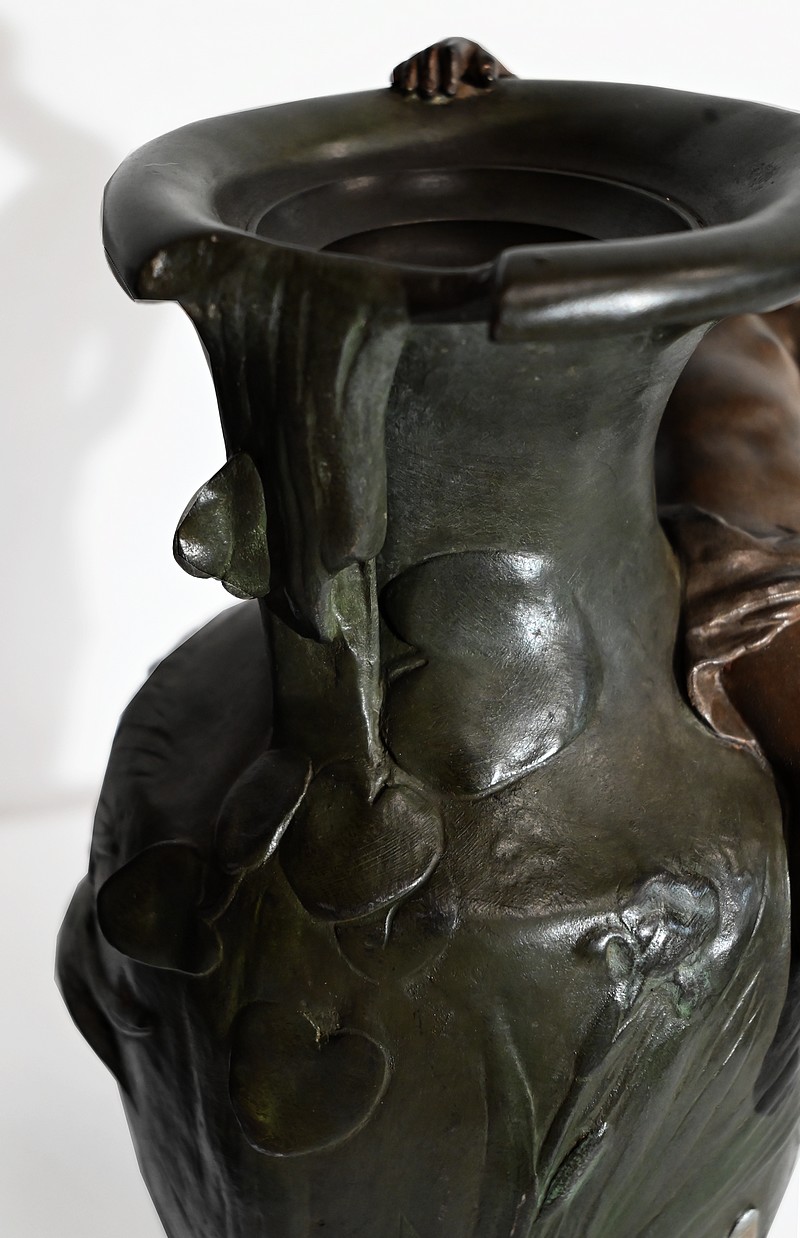 Cette production artistique, signée A. Moreau, présente le cachet du fondeur, Eugène Blot Paris, au pied du vase.