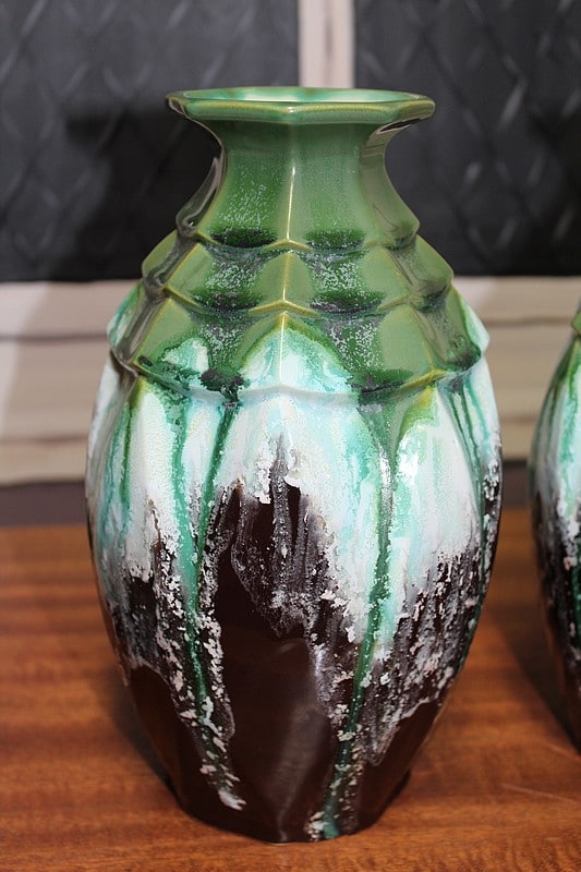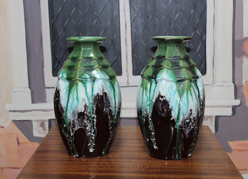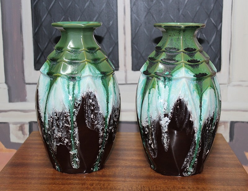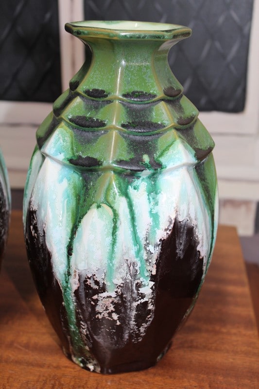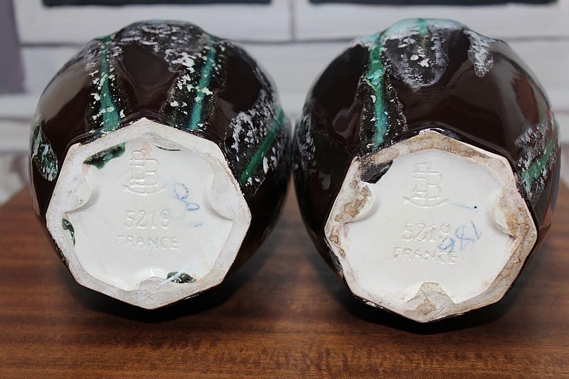 Paire de vases balustre en faïence verte et brune signée en creux et gravée ‘ 5219 FRANCE’.