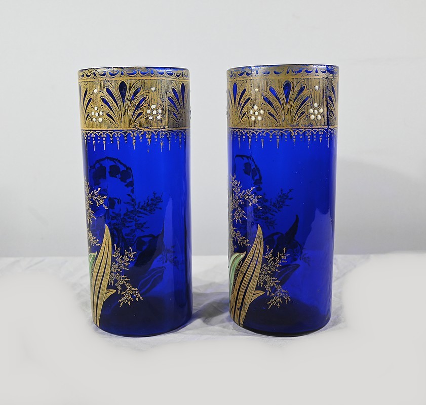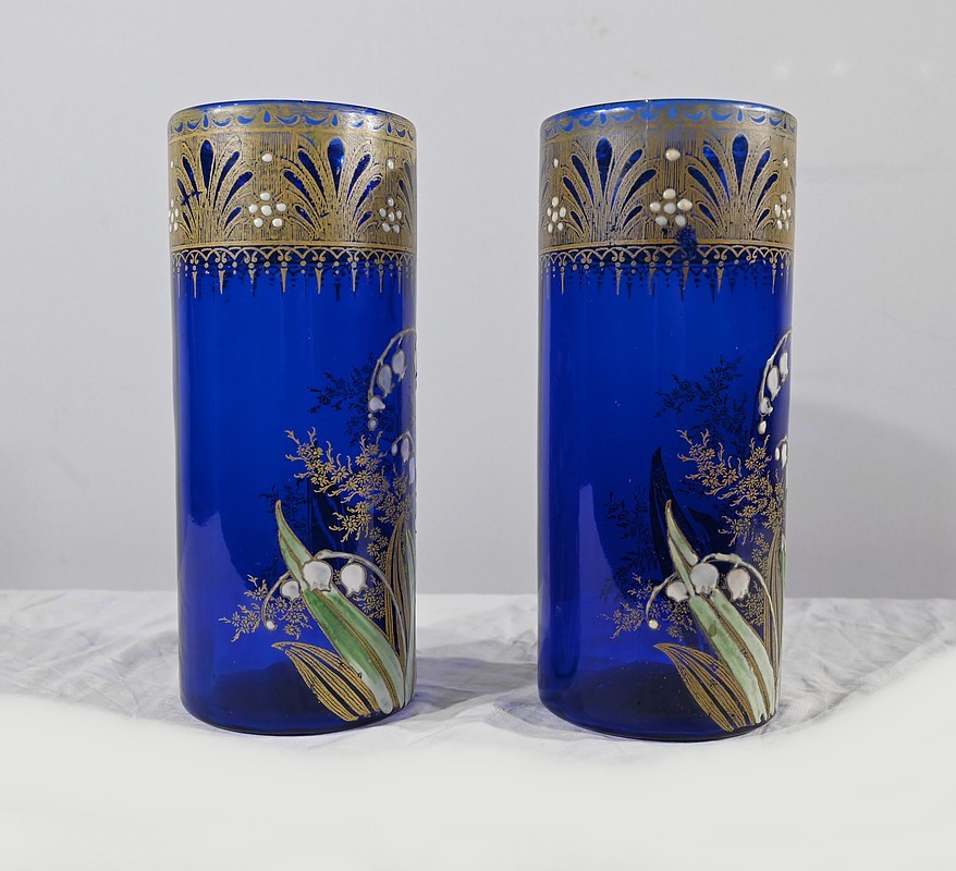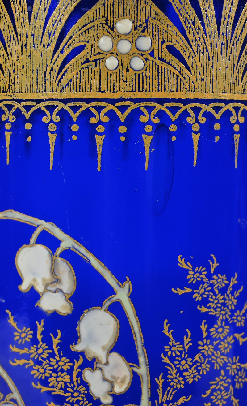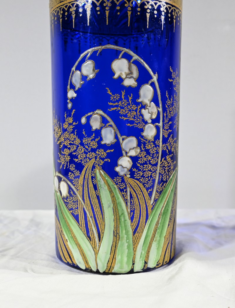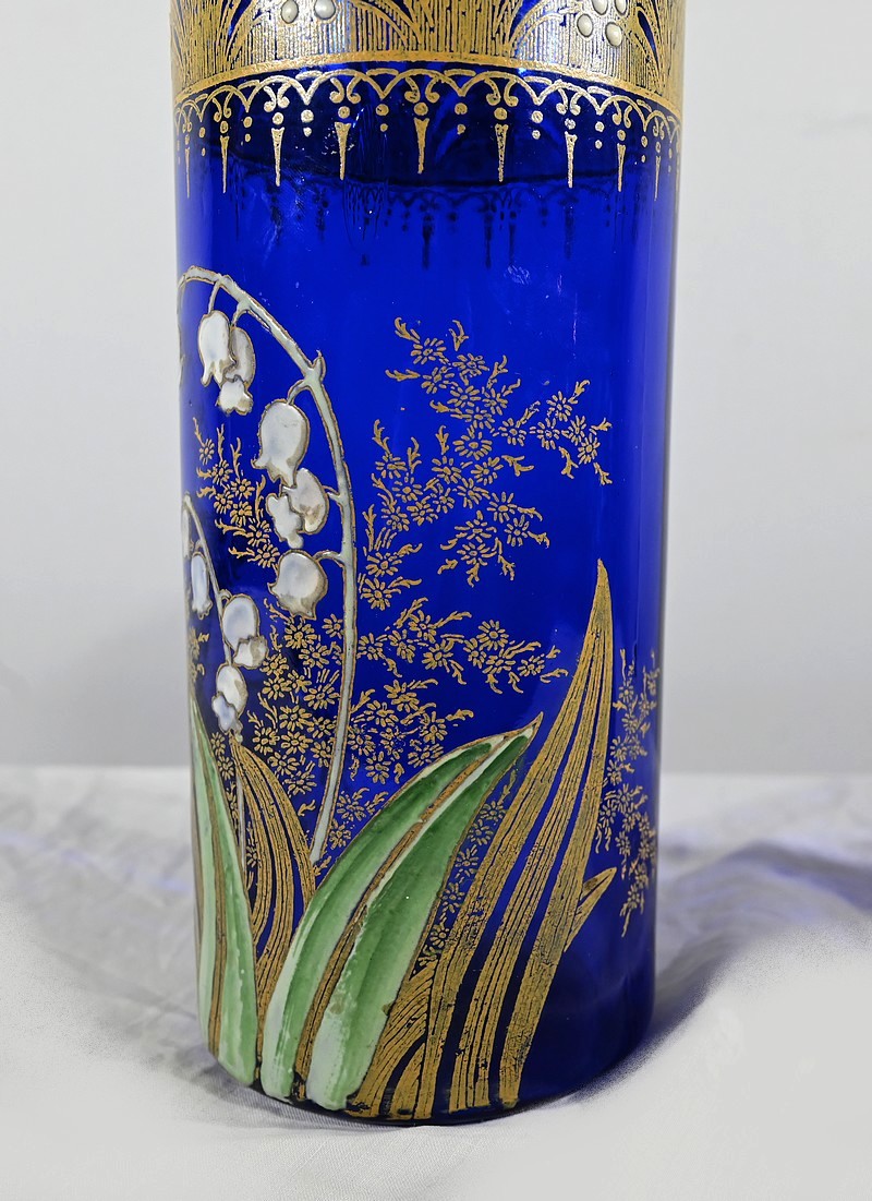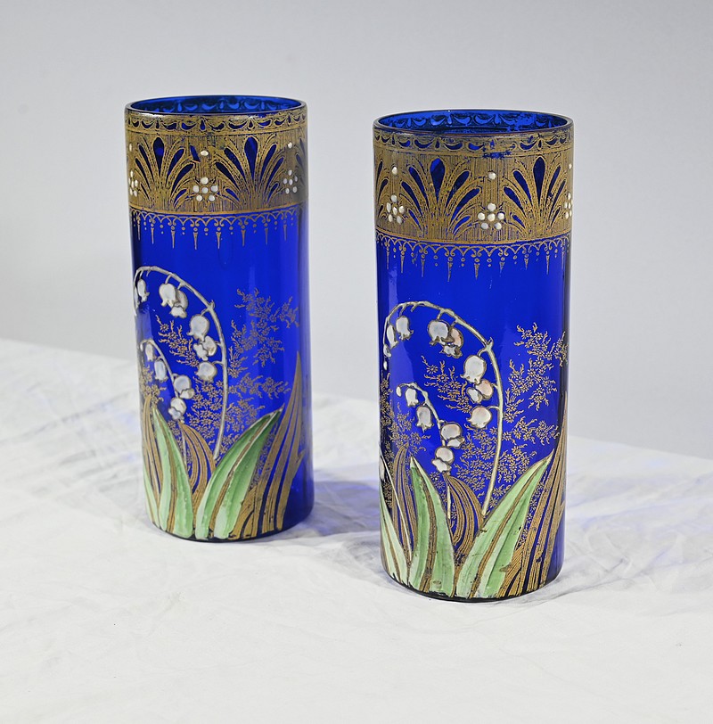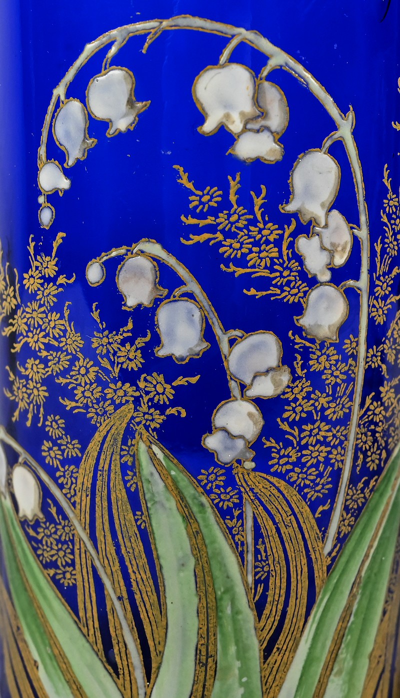 D’un beau verre bleu nuit à décor floral émaillé, ces vases se caractérisent par leur col agrémenté d’une sérigraphie dorée aux fleurs stylisées ; et de brins de muguets accompagnés de fleurettes et de feuillages peints à la main.