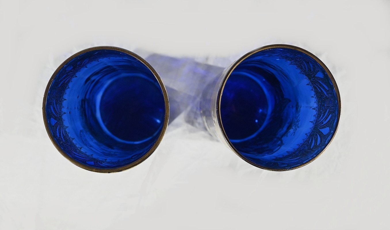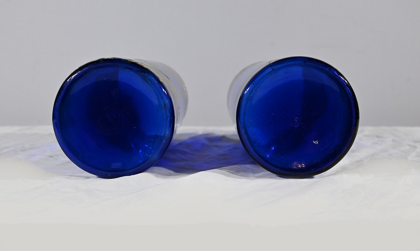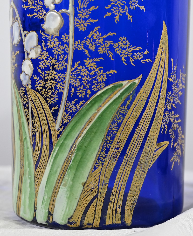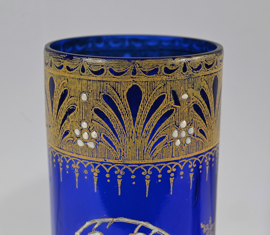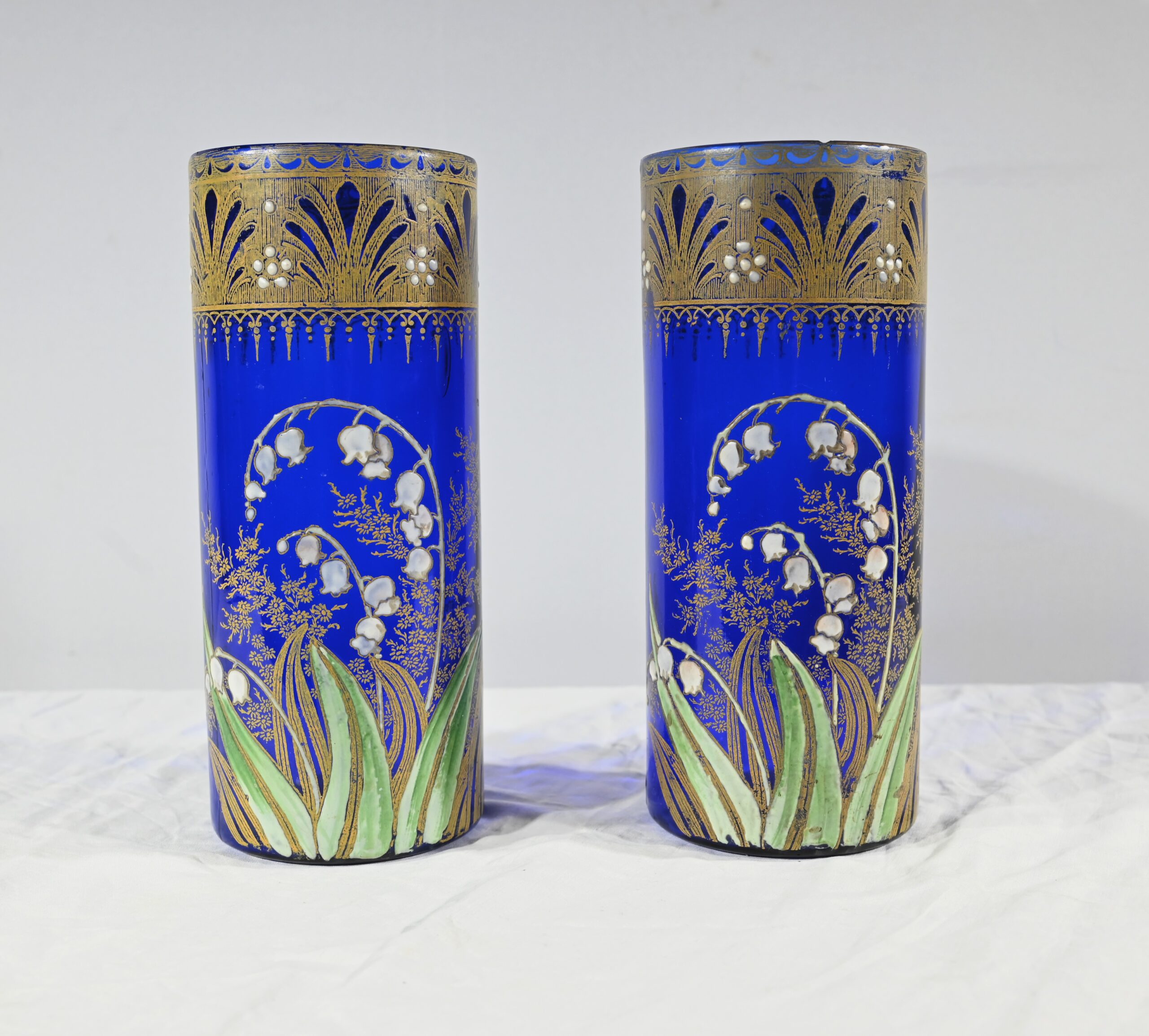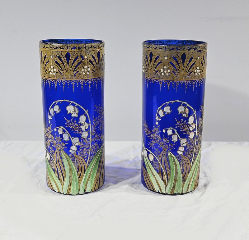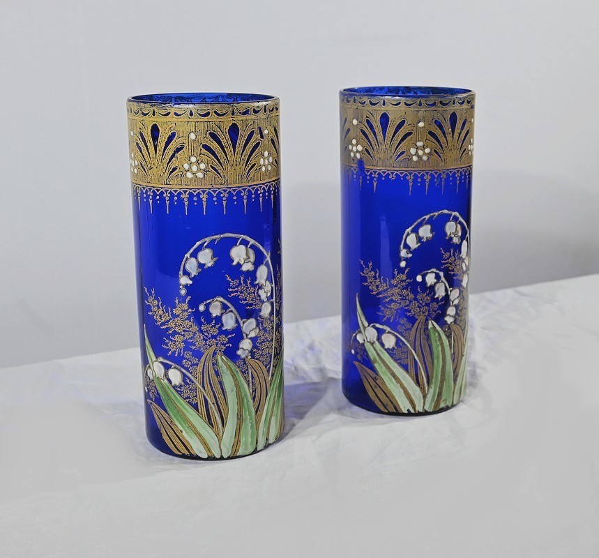 D’un beau verre bleu nuit à décor floral émaillé, ces vases se caractérisent par leur col agrémenté d’une sérigraphie dorée aux fleurs stylisées ; et de brins de muguets accompagnés de fleurettes et de feuillages peints à la main.