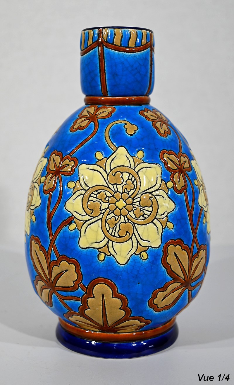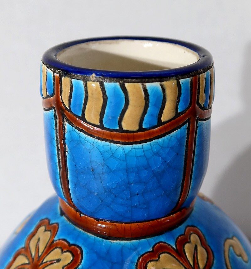 Petit vase polychrome portant le n°61 et la marque de la faïencerie de Longwy. Cette petite ville de Meurthe-et-Moselle vit naître en 1798 la manufacture historique du même nom, dont le savoir-faire traditionnel perdure encore aujourd’hui.