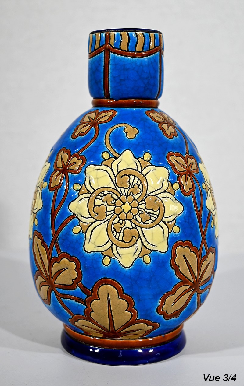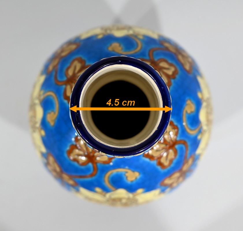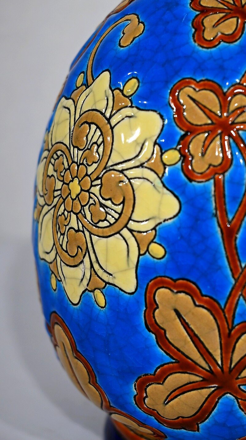 Le corps ovoïde de ce vase est enjolivé de fleurs dans un camaïeu de jaune, accompagnées de feuillages marronnés sur fond bleu azur.