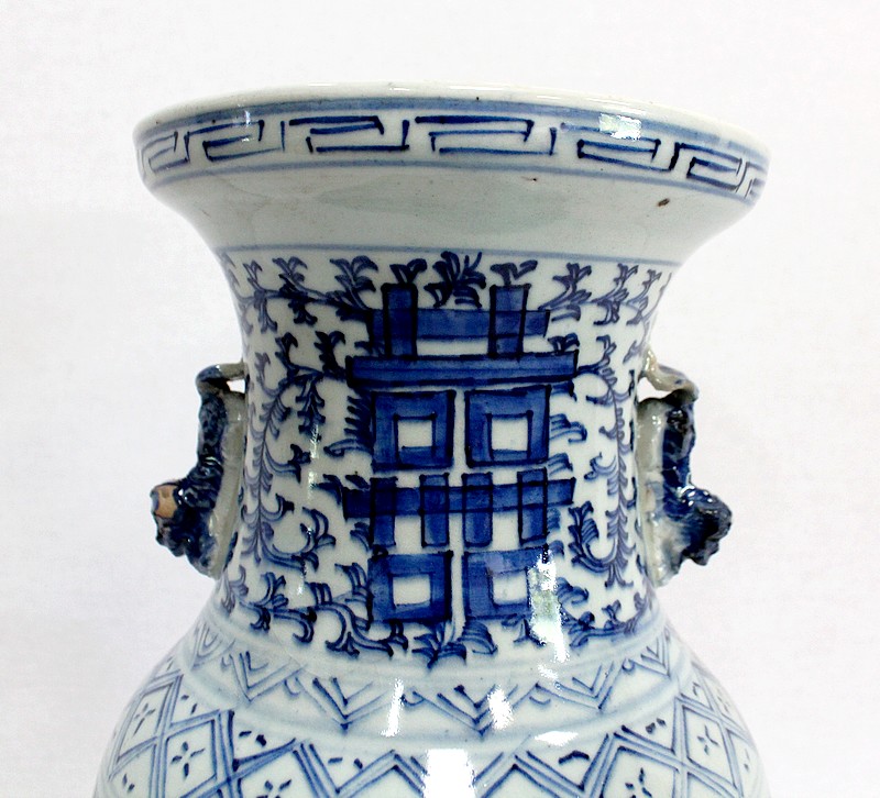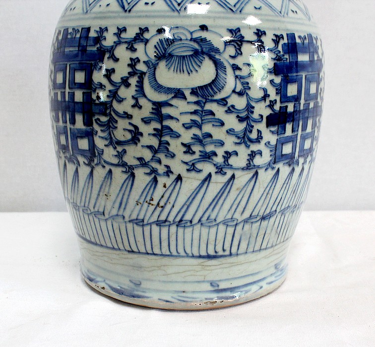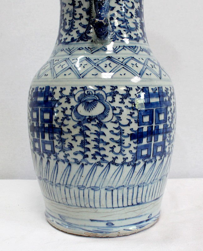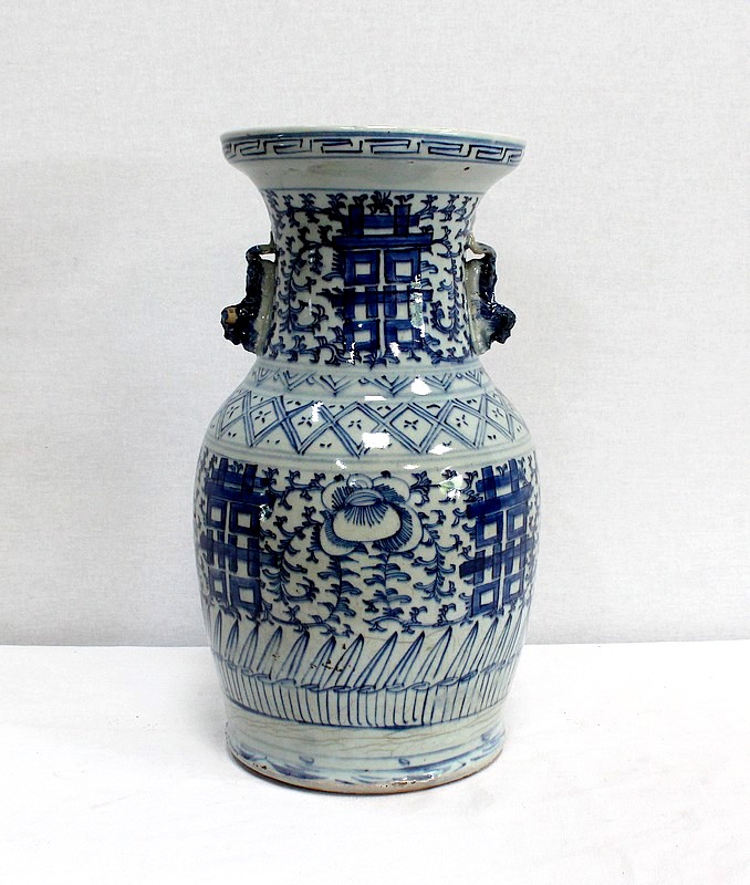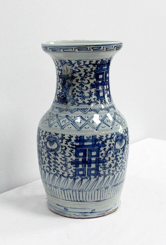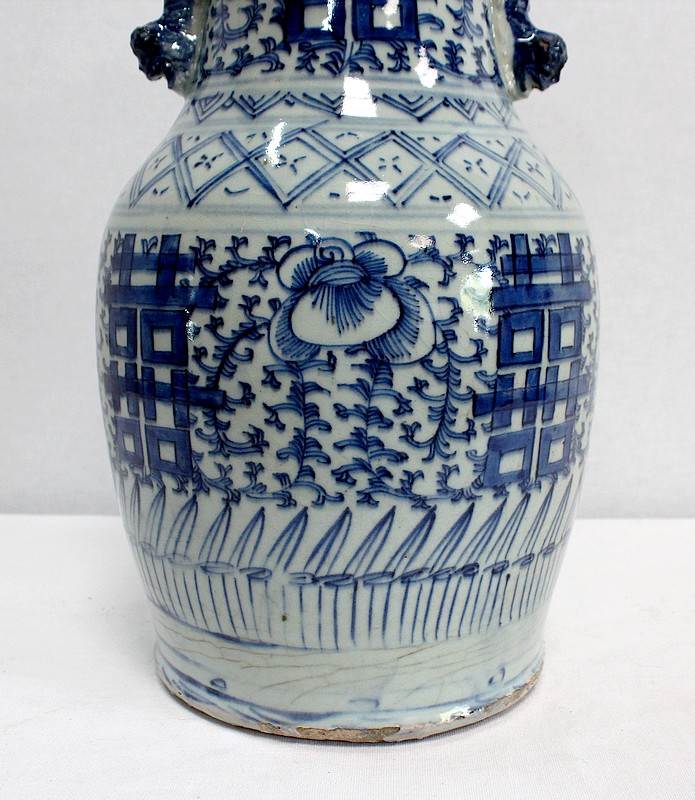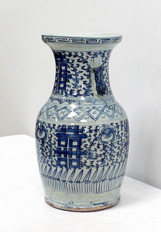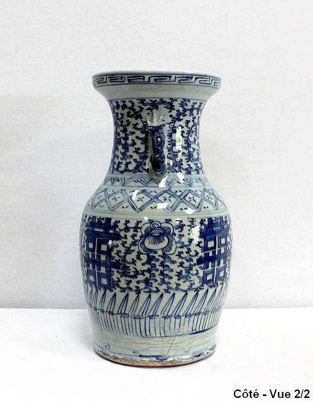 Vase en Porcelaine de Chine, de forme balustre à décor gris clair et bleu, mettant en scène des croisillons accompagnés de feuillages.