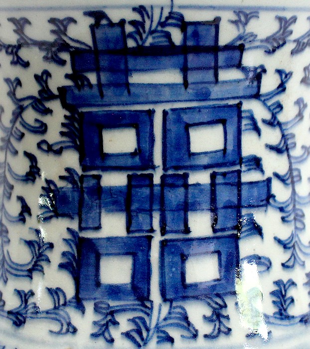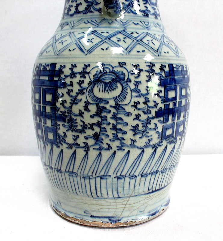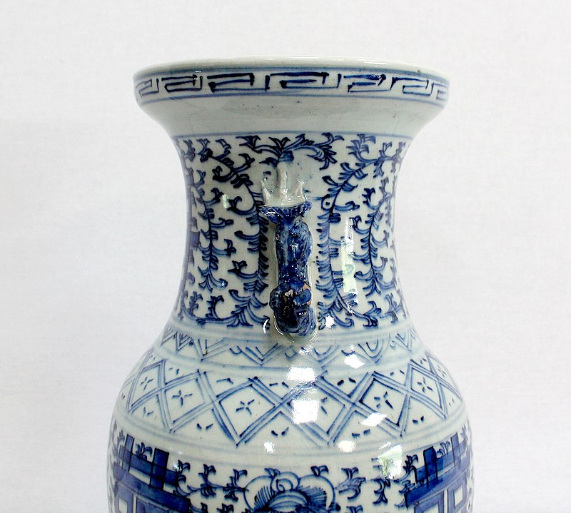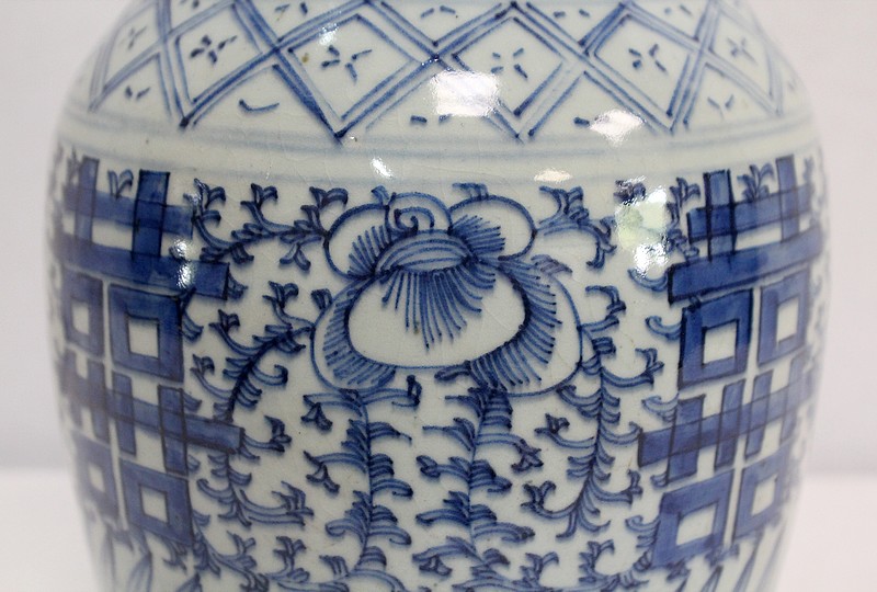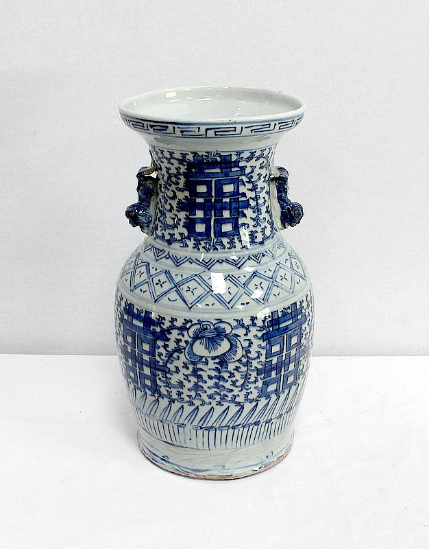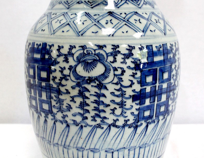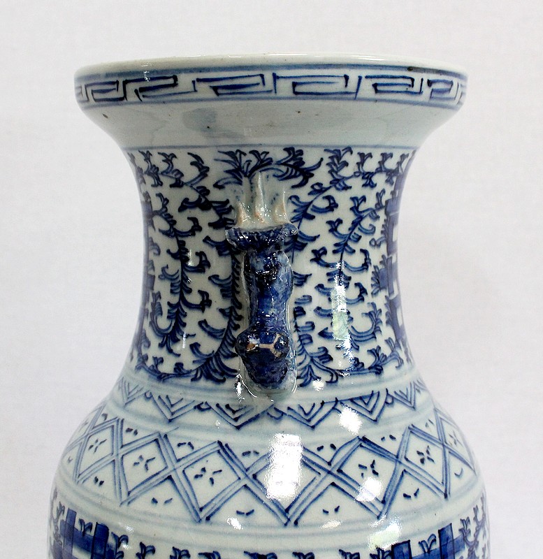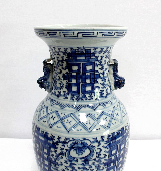 Vase en Porcelaine de Chine, de forme balustre à décor gris clair et bleu, mettant en scène des croisillons accompagnés de feuillages.