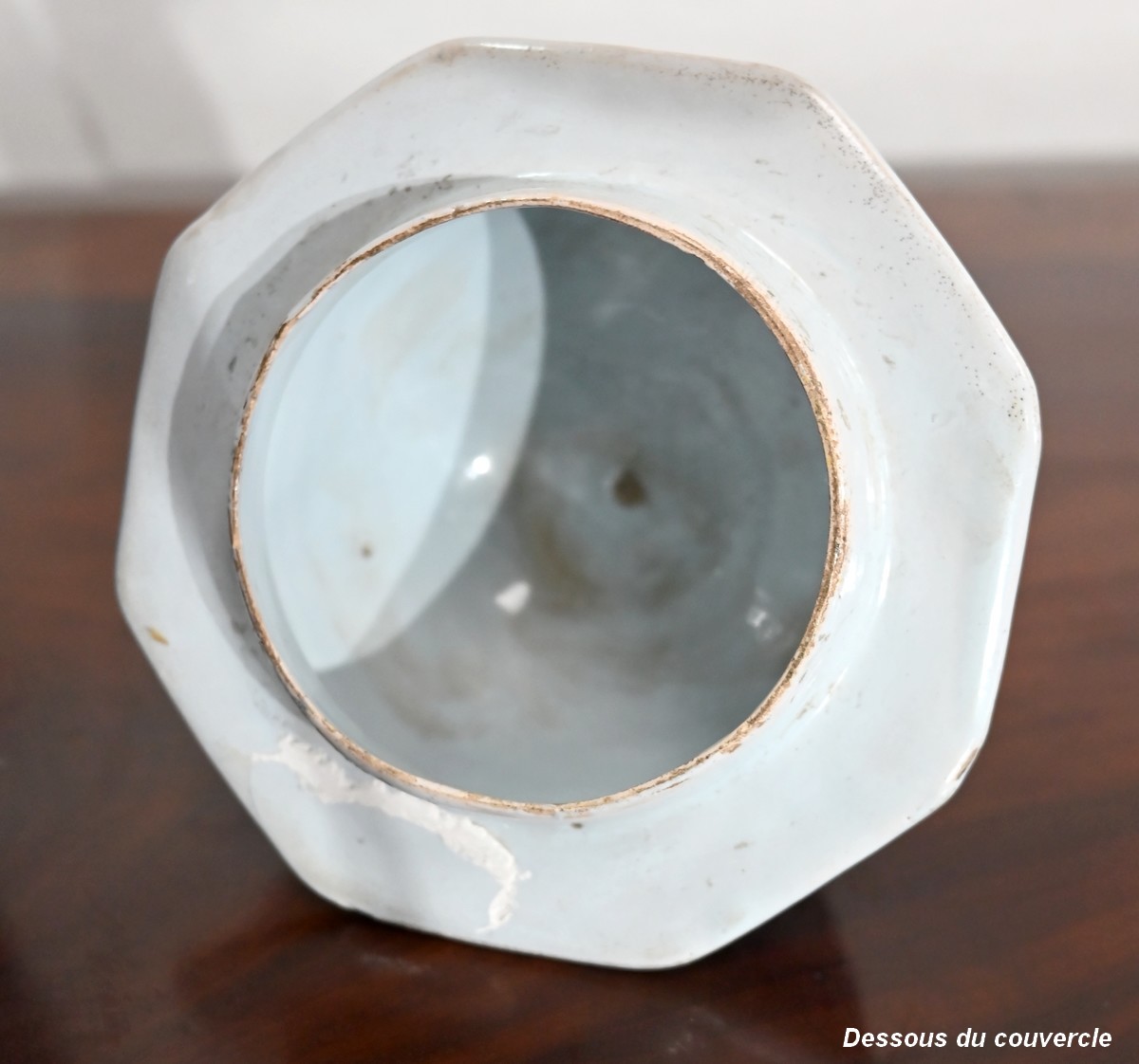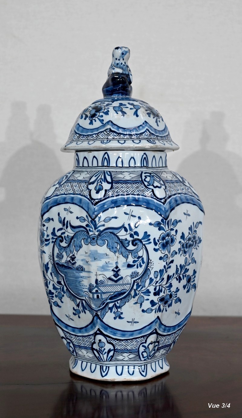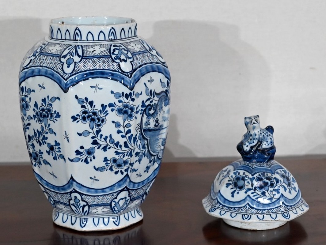 Ce vase en faïence de Delft, à fond blanc lisse et brillant, aux motifs bleus de différentes tonalités allant du clair au foncé, se caractérise par sa panse charnue à côtes. Il est surmonté d’un couvercle à chien de Fao, recouvert de fleurs, entourées de frises ondulées. Le haut de la panse, quadrillé et aux motifs naturels, amène à une abondante décoration végétale, constituée de fleurs, fruits et libellules, qui encadre deux scènes dans lesquelles nous apercevons des pagodes, un cour d’eau et des oiseaux à l’horizon.