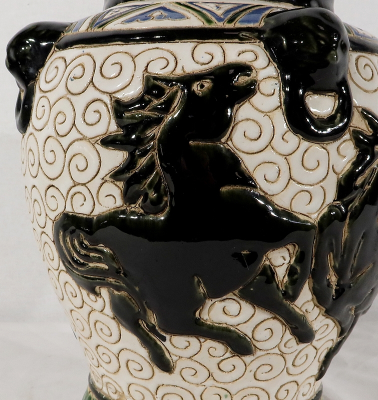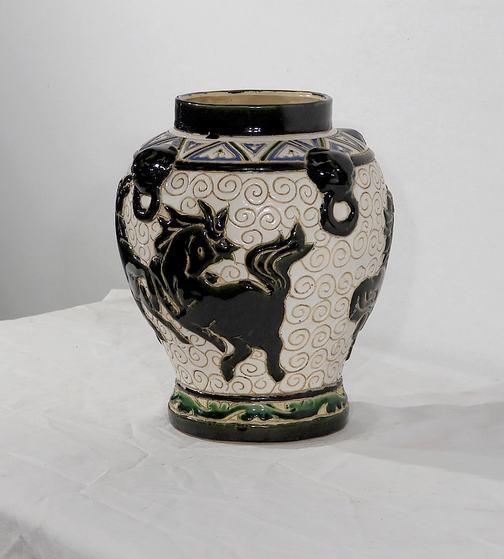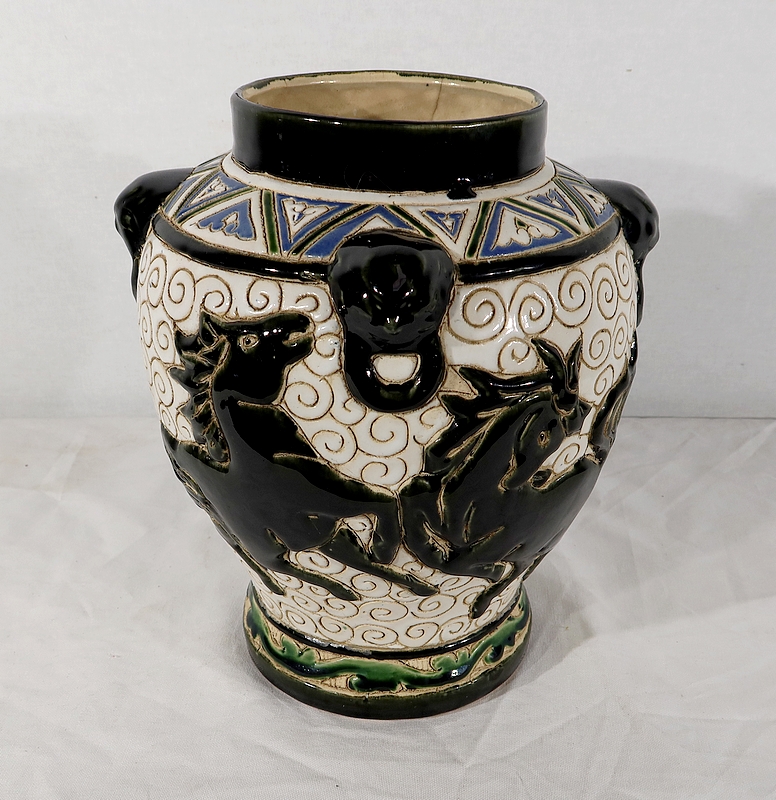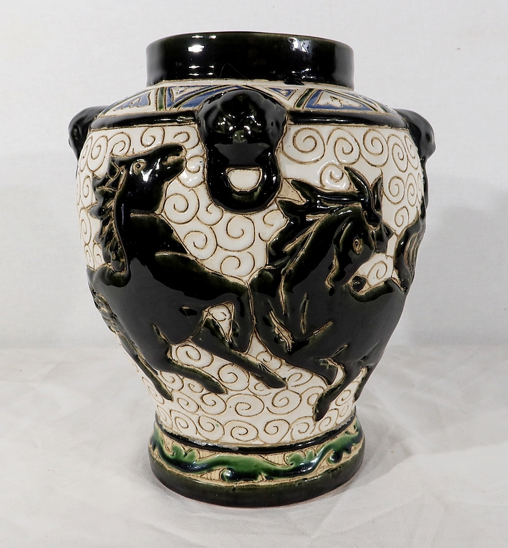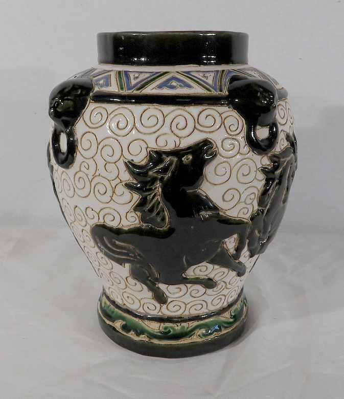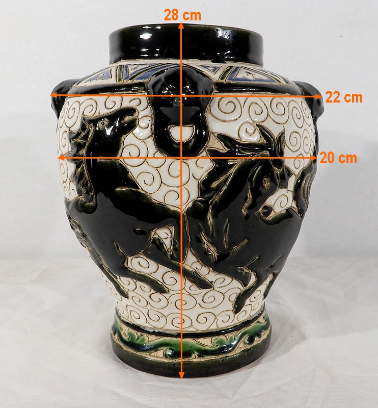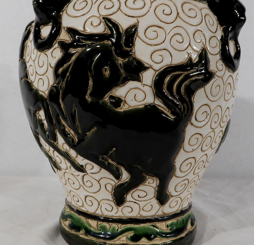 Joli vase pansu en céramique chinoise, orné d’arabesques et décoré de chevaux cabrés de couleur noire aux reflets verts.