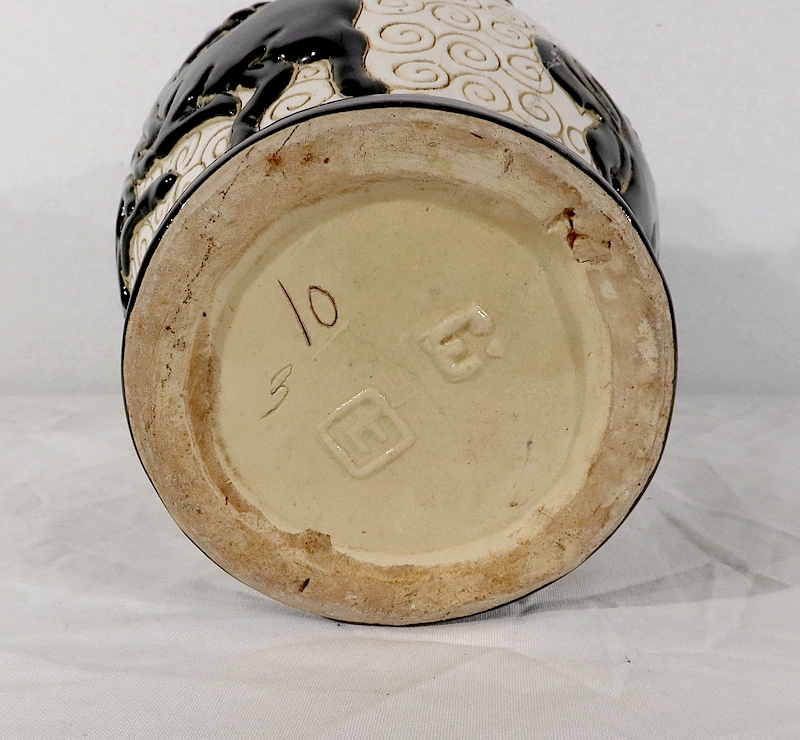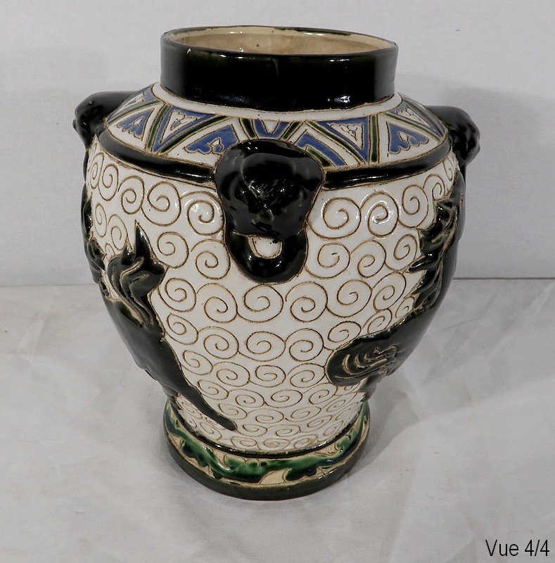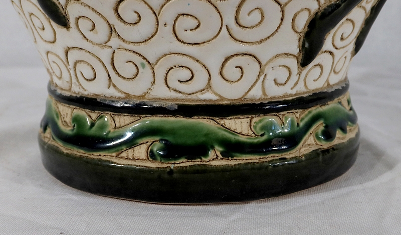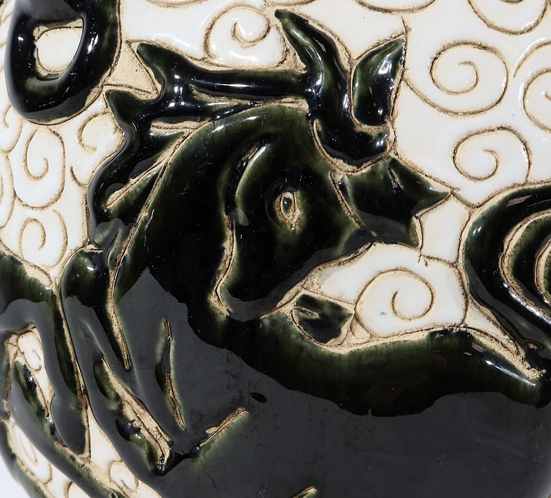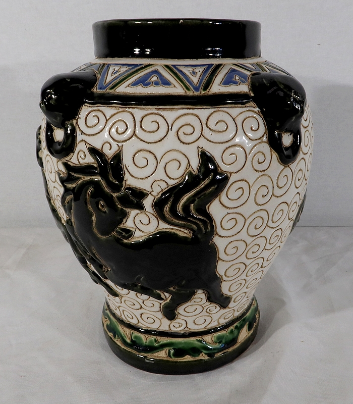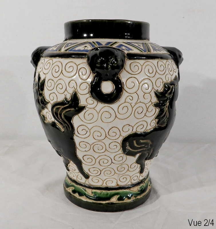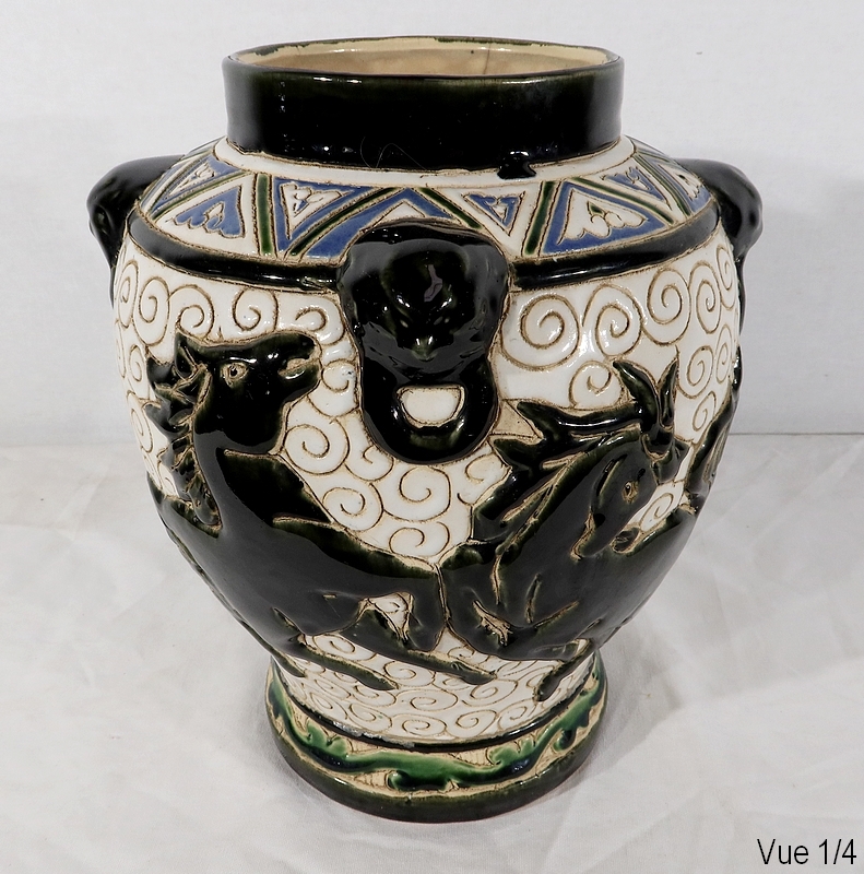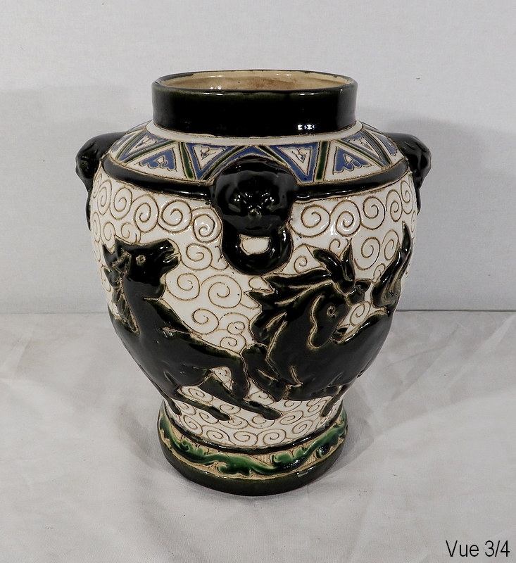 Joli vase pansu en céramique chinoise, orné d’arabesques et décoré de chevaux cabrés de couleur noire aux reflets verts.