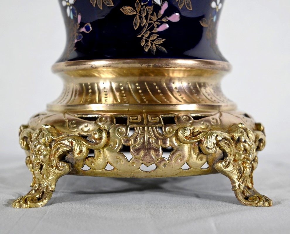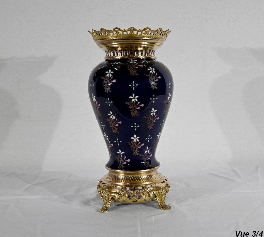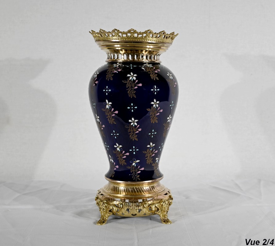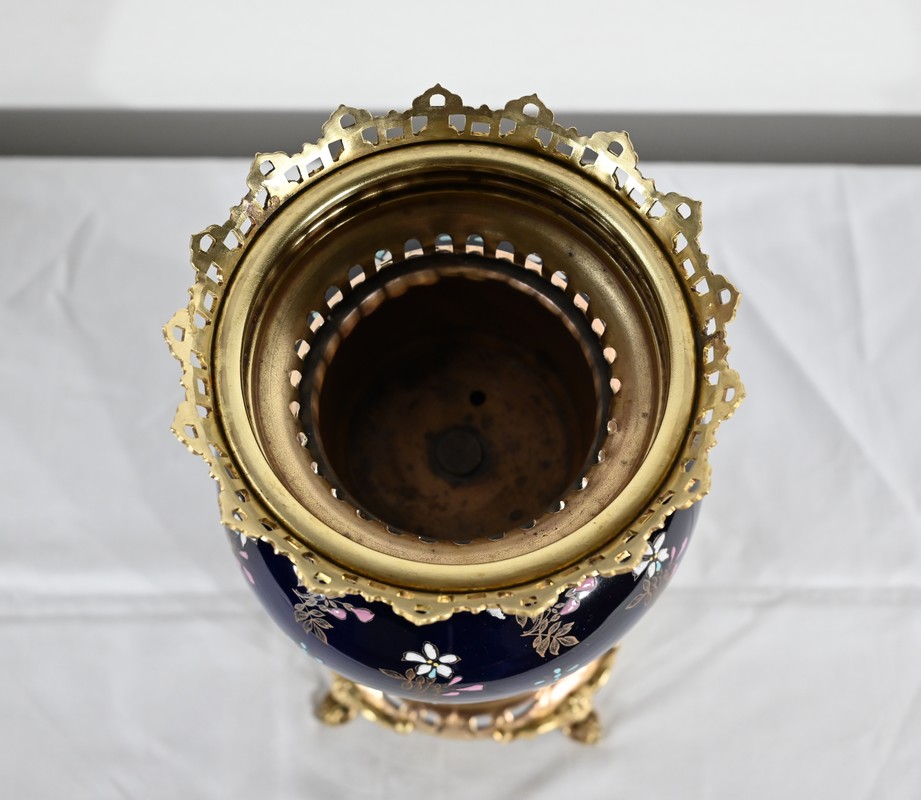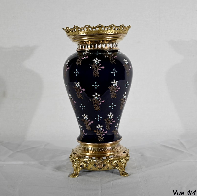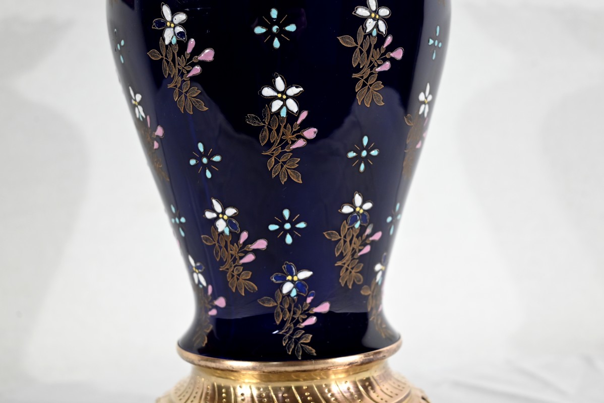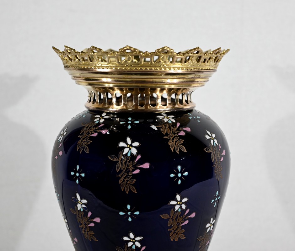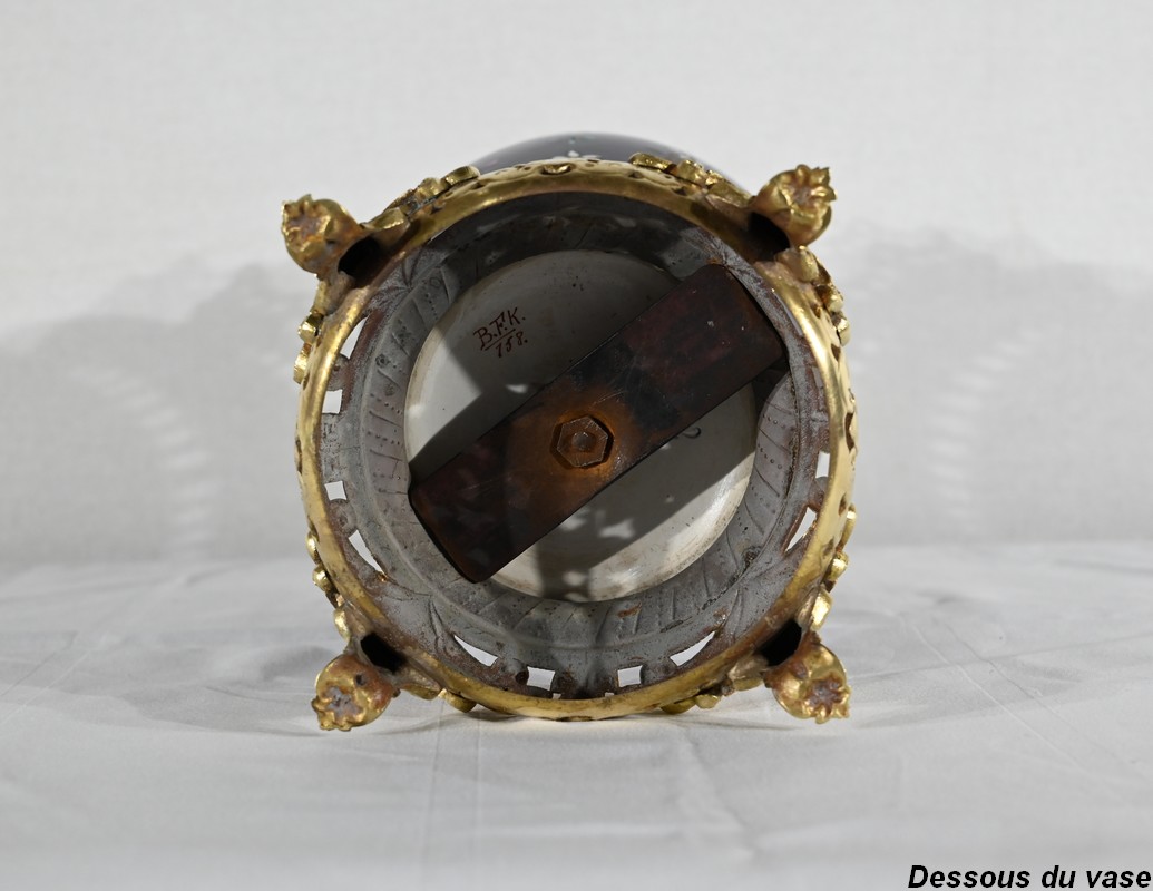 Le col et l’embouchure sont habillés d’un cerclage en bronze doré, ajouré et ciselé, à motifs de fleurs de lys.