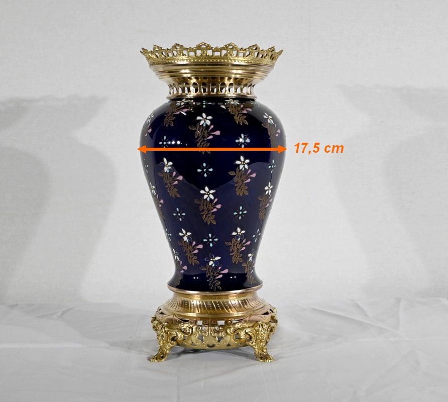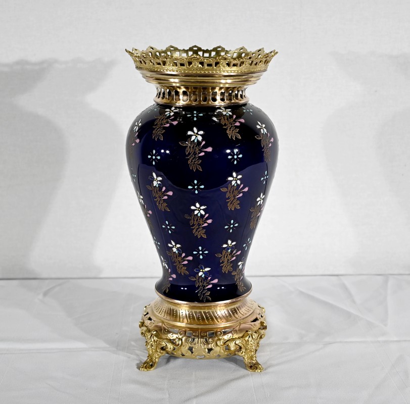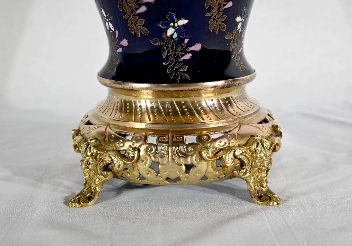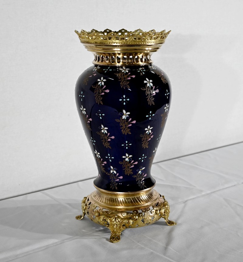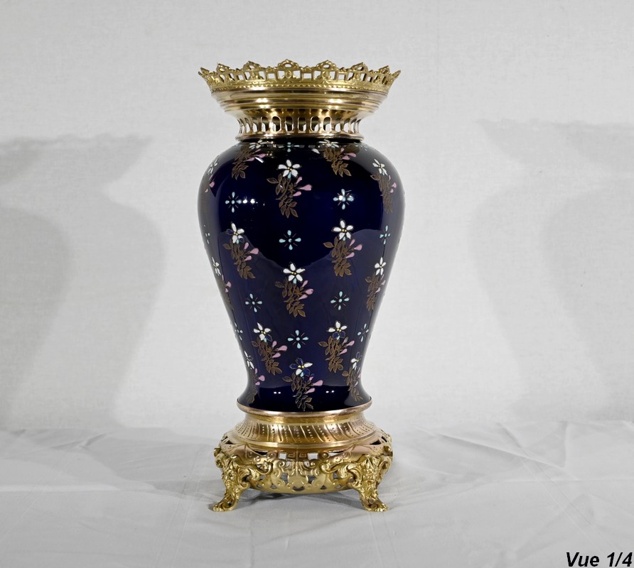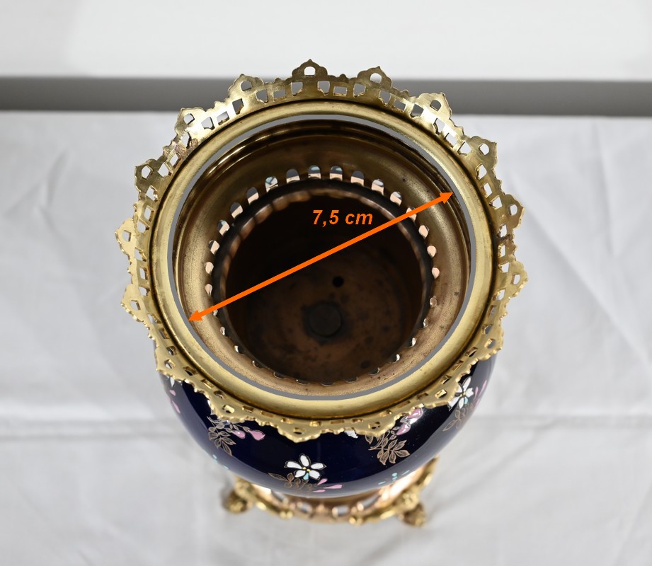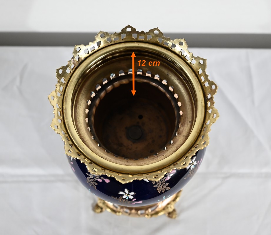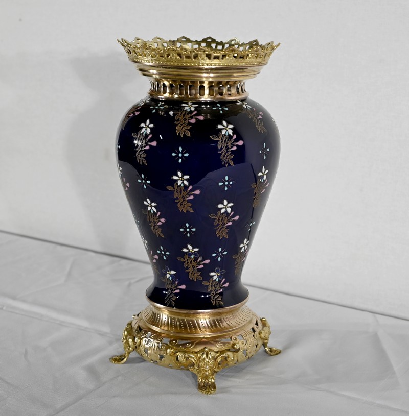 Le col et l’embouchure sont habillés d’un cerclage en bronze doré, ajouré et ciselé, à motifs de fleurs de lys.