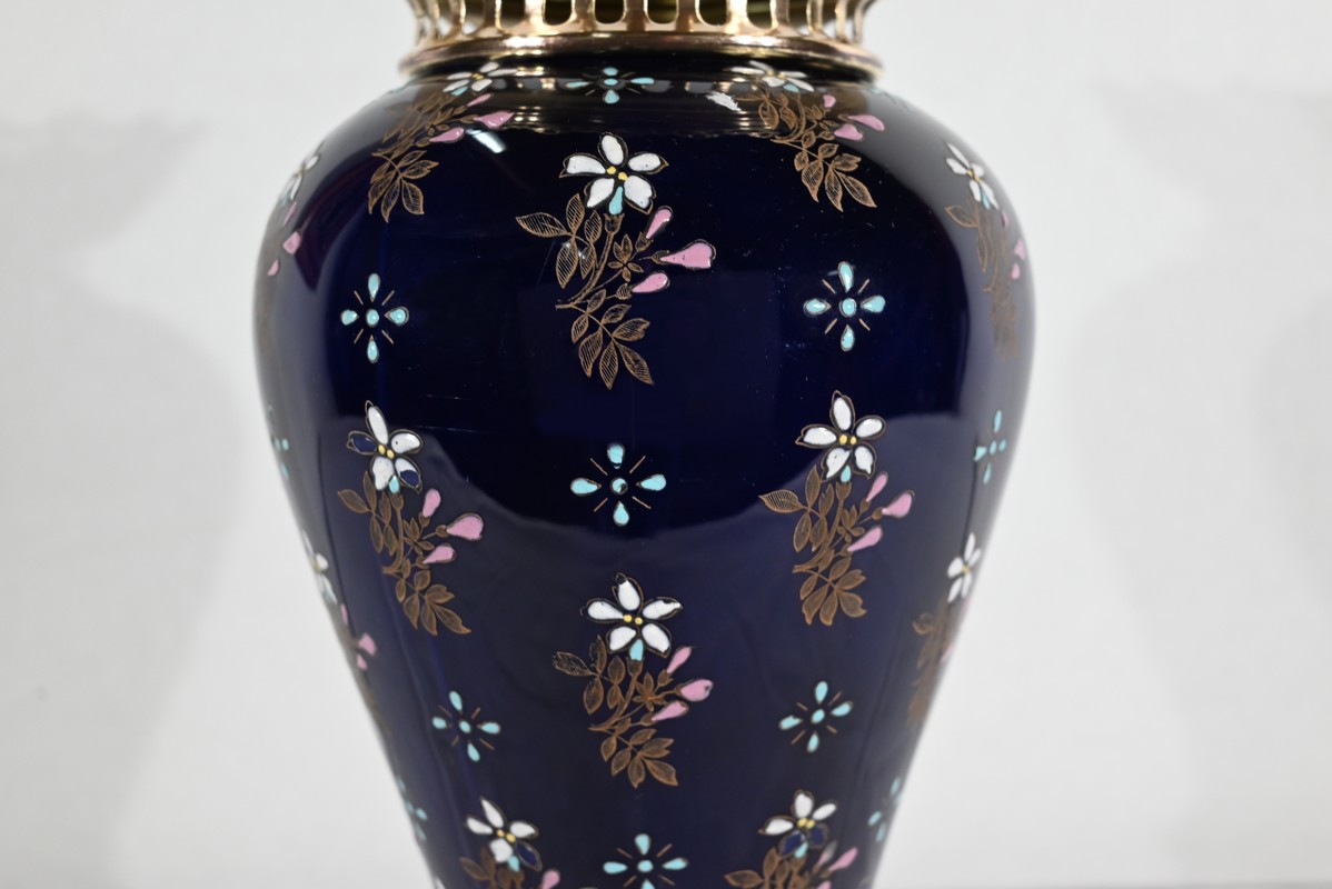 Ce vase à panse ovoïde, à rétrécissement et légèrement concave vers le bas, présente des décors en relief de fleurs et de feuillage, en émaux polychromes sur fond bleu de Sèvres.