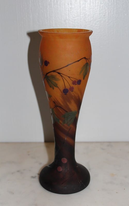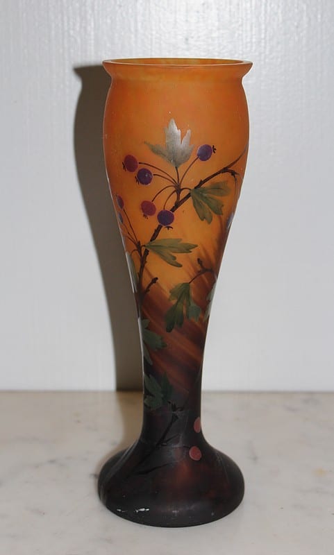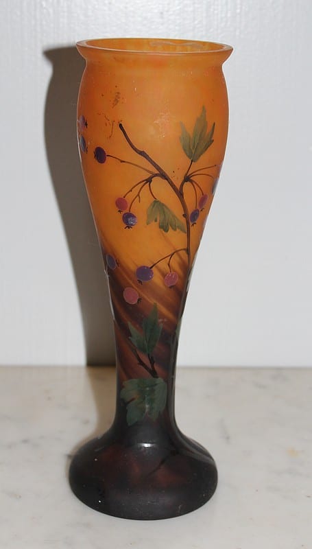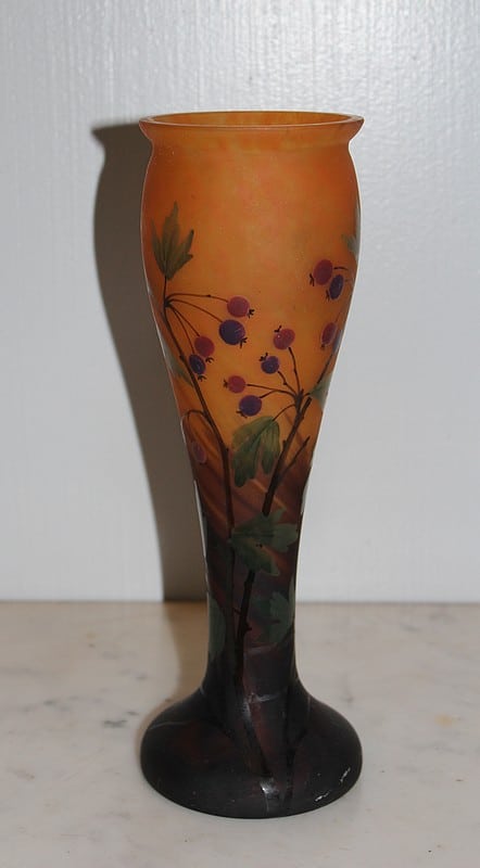 Vase balustre en pâte de verre orangée, brune et verte à décor de branches, de feuilles et de fruits.