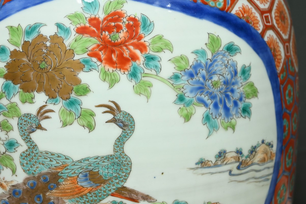 Les paysages traditionnels et les paons, peints dans des réserves, sont mis en valeur par un fond vermiculé et fleuri.