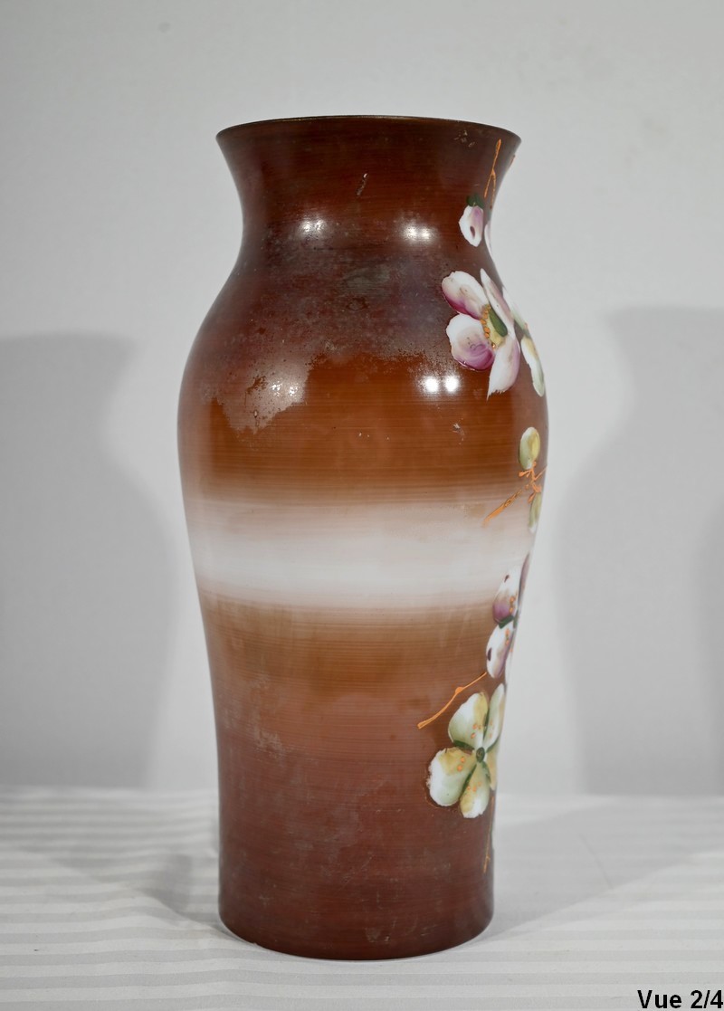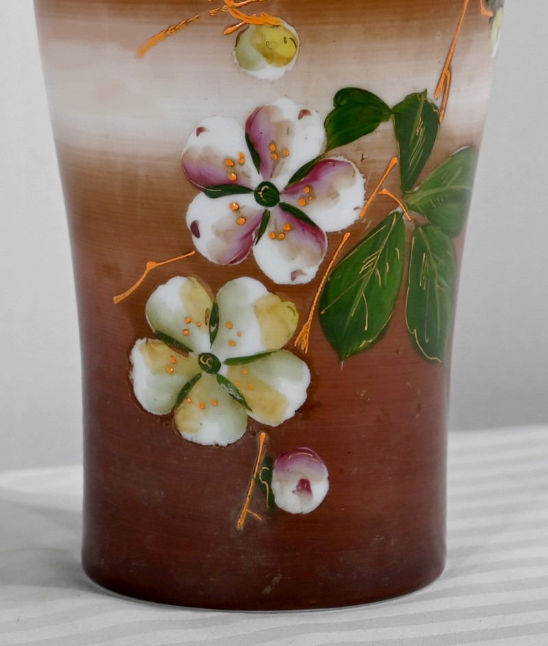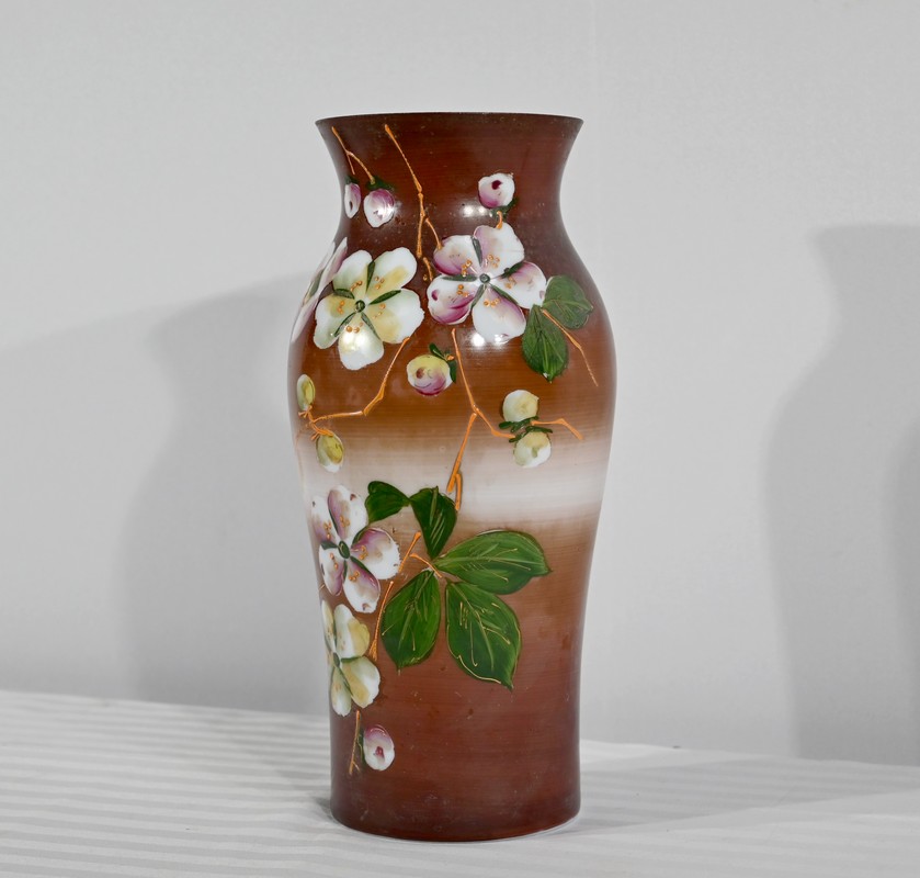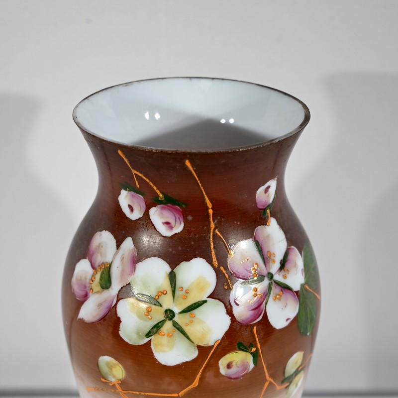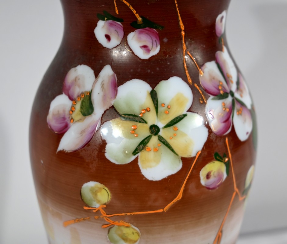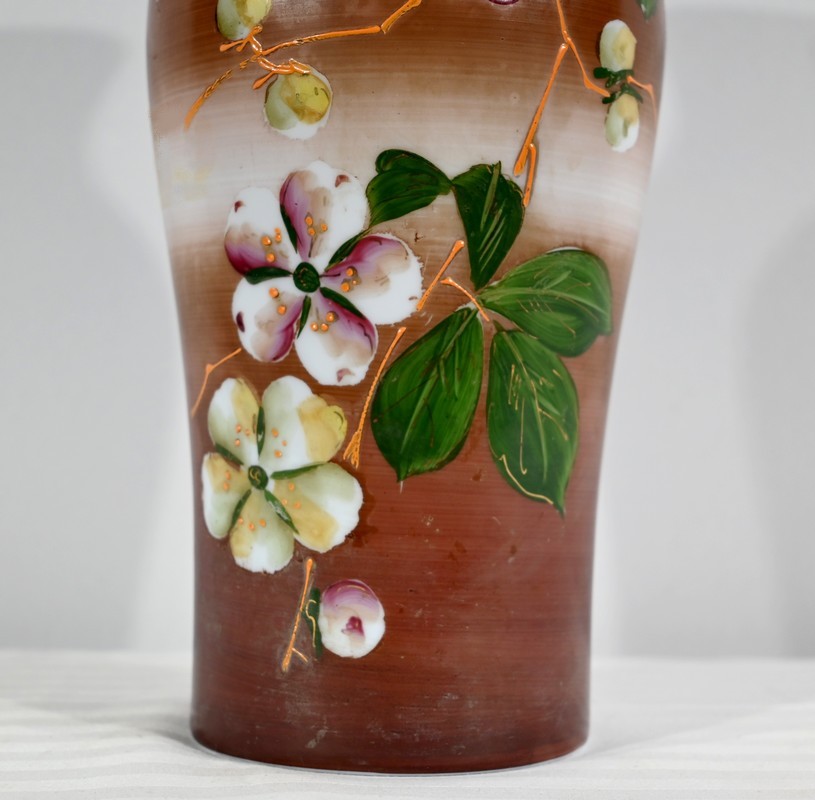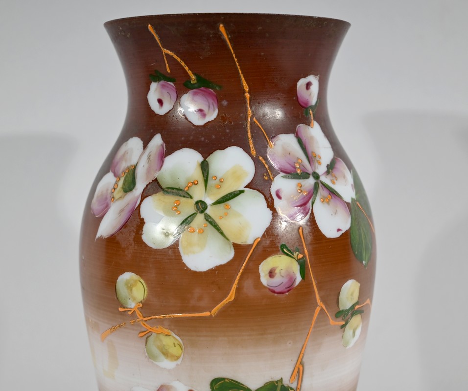 La panse légèrement bombée présente des décors de branches de fleurs et de bourgeons dans des tons violet, mauve et vert sur un fond marron dégradé.