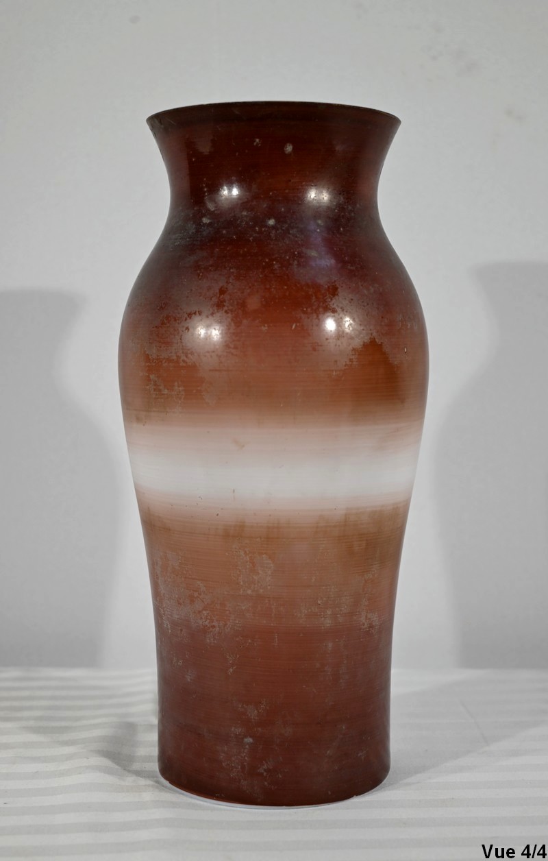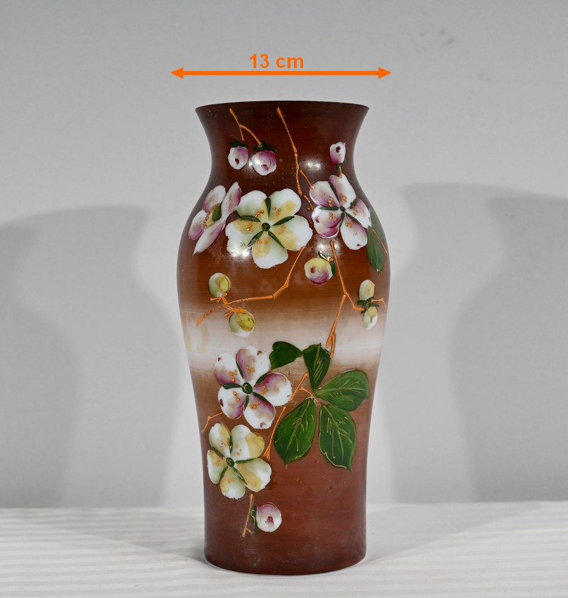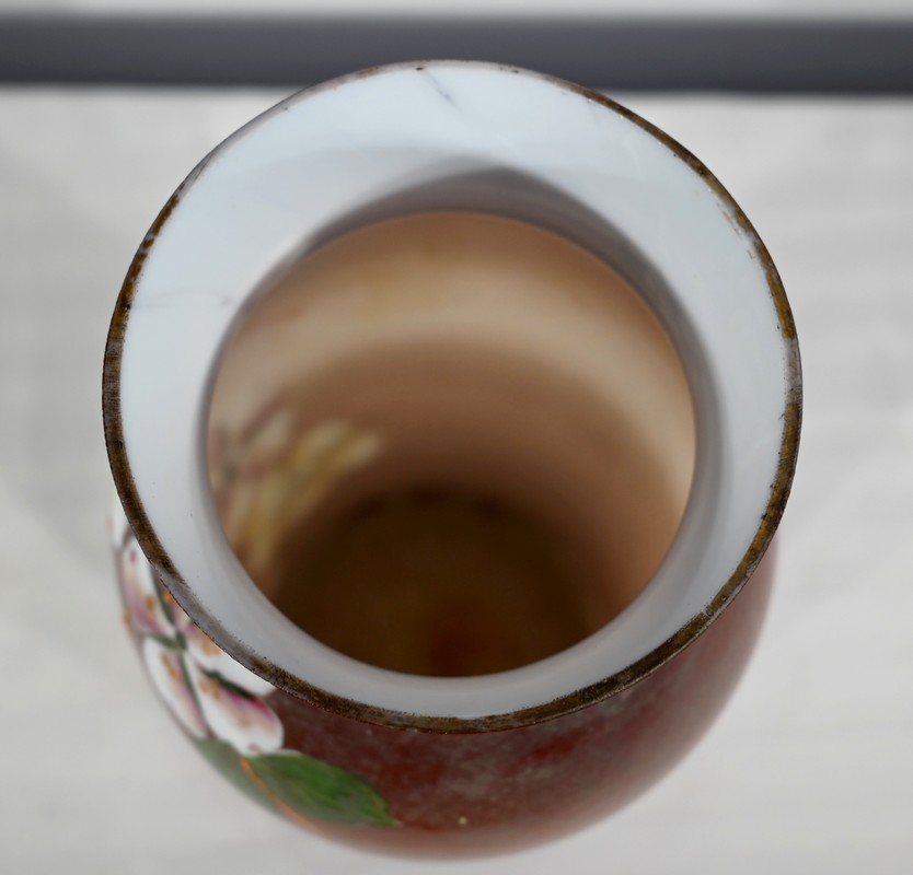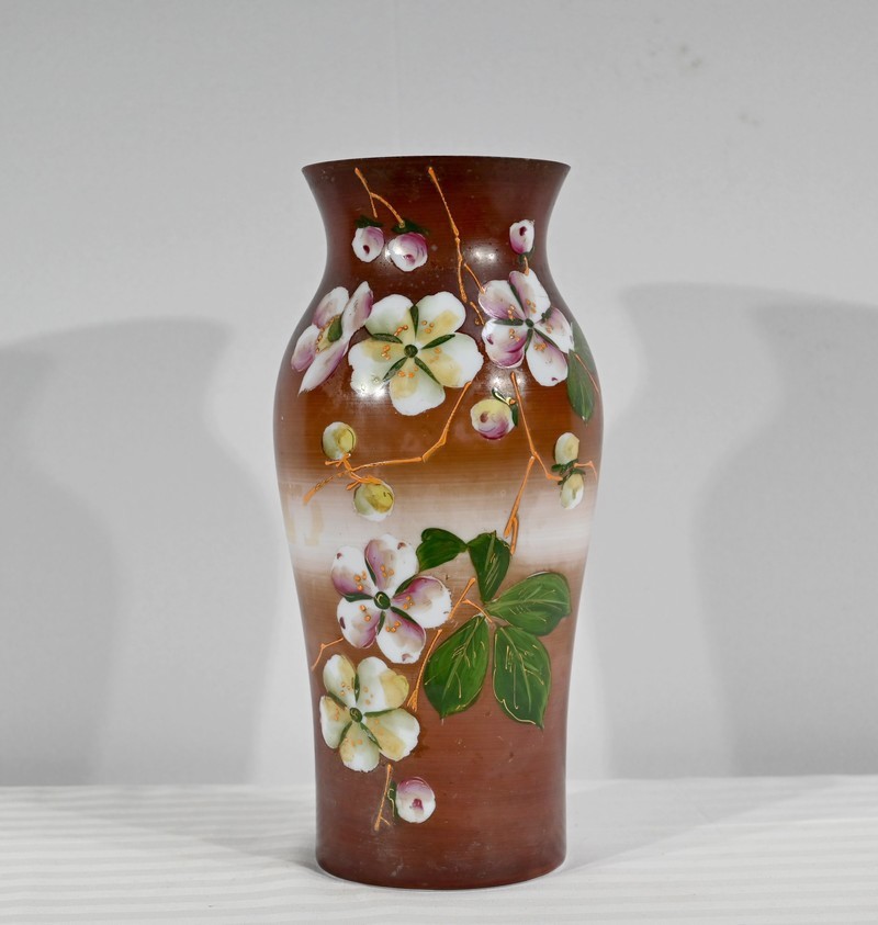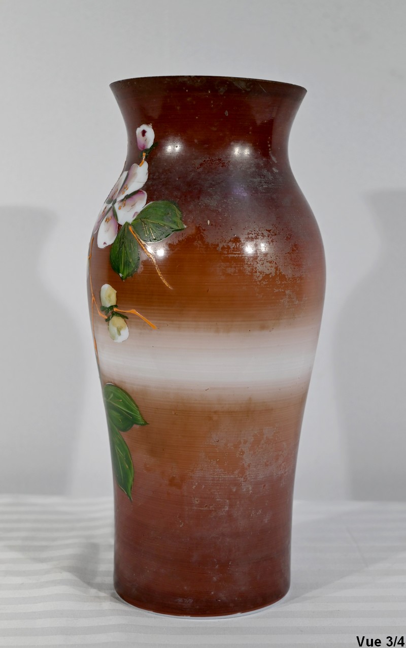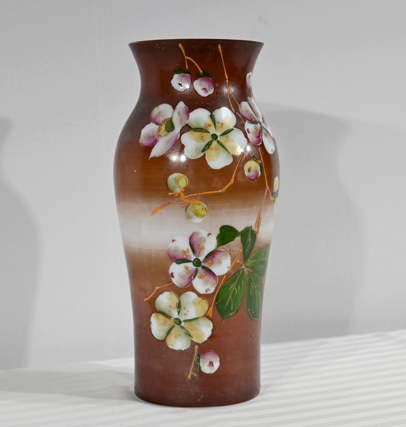 La panse légèrement bombée présente des décors de branches de fleurs et de bourgeons dans des tons violet, mauve et vert sur un fond marron dégradé.