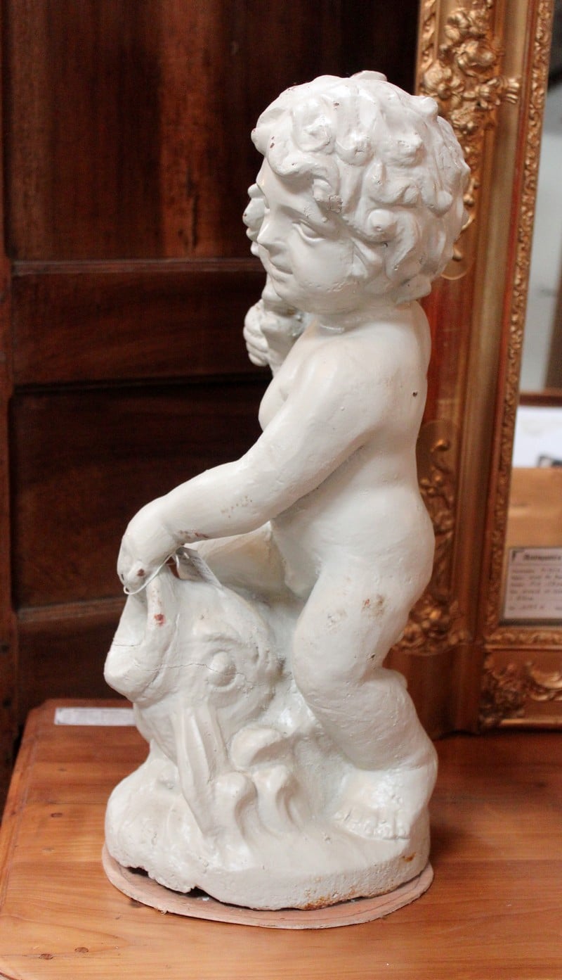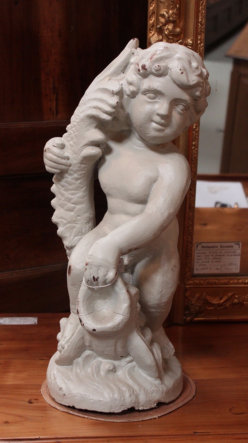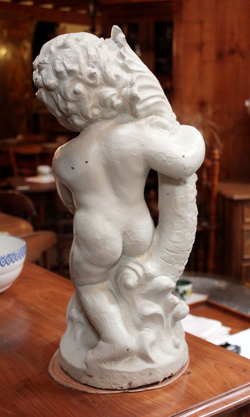 Petite statue en fonte peinte en blanc représentant un enfant tenant un poisson.
