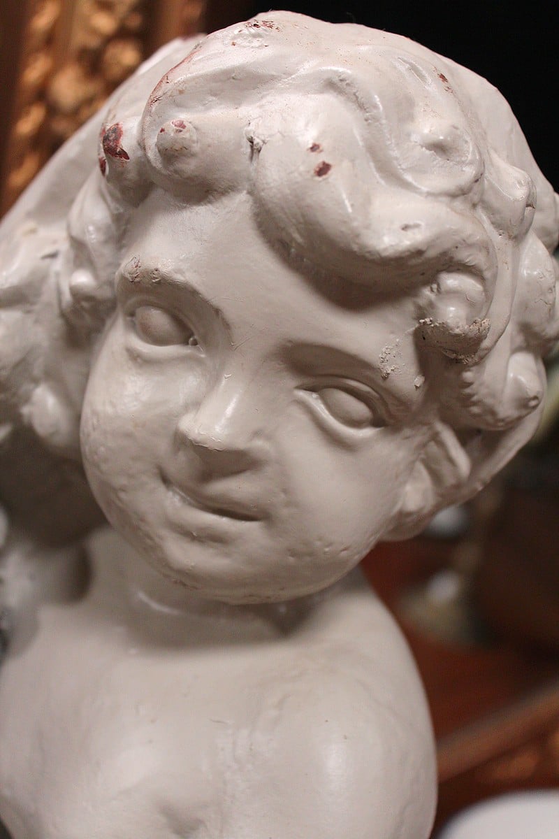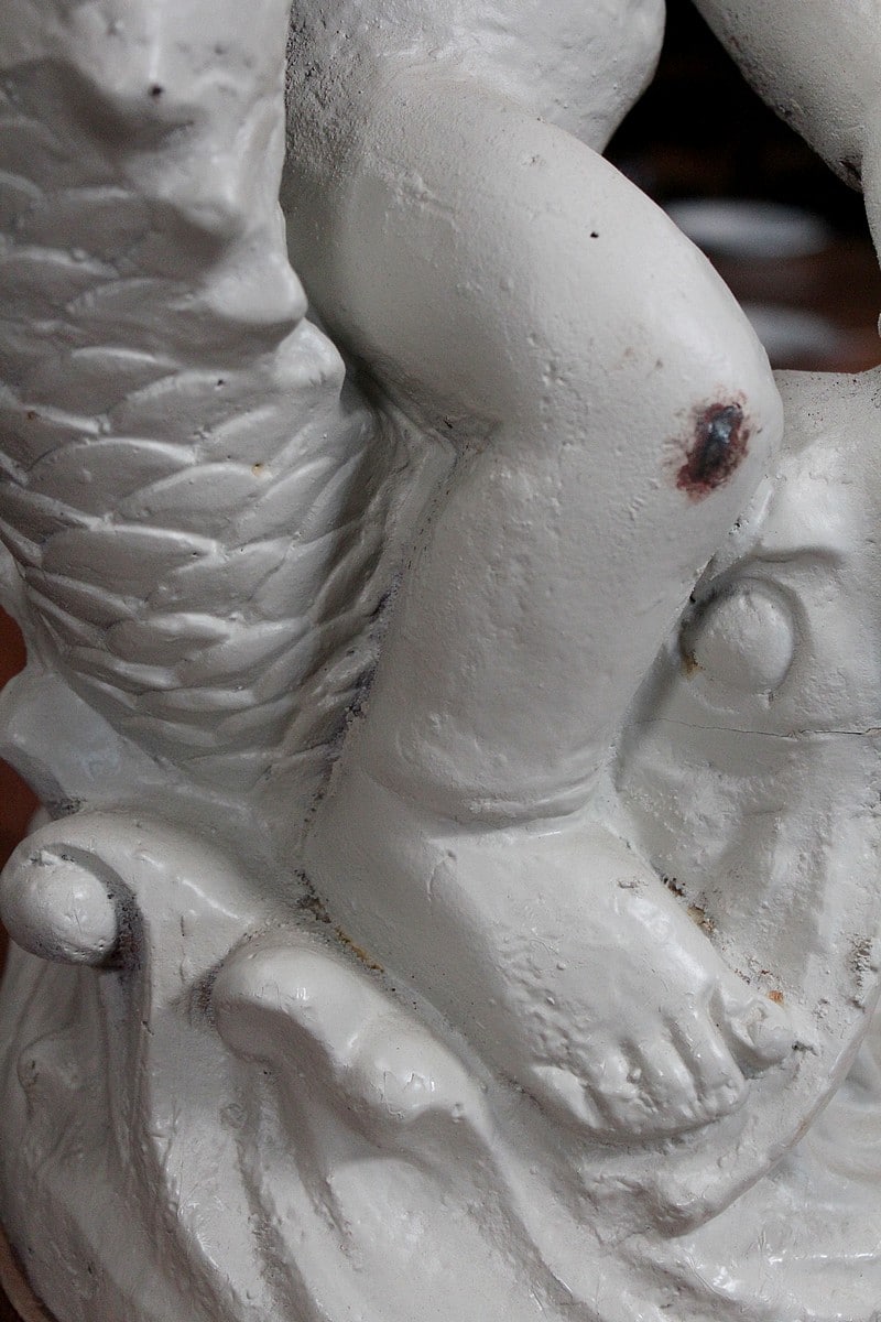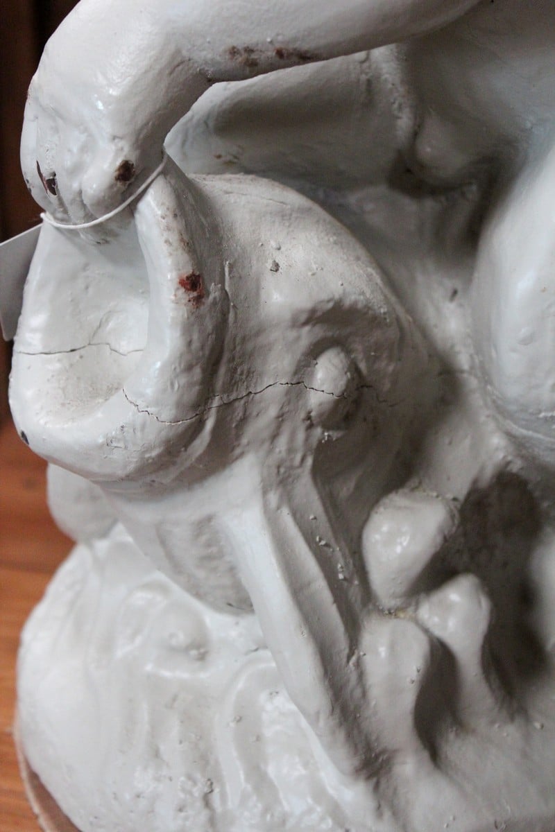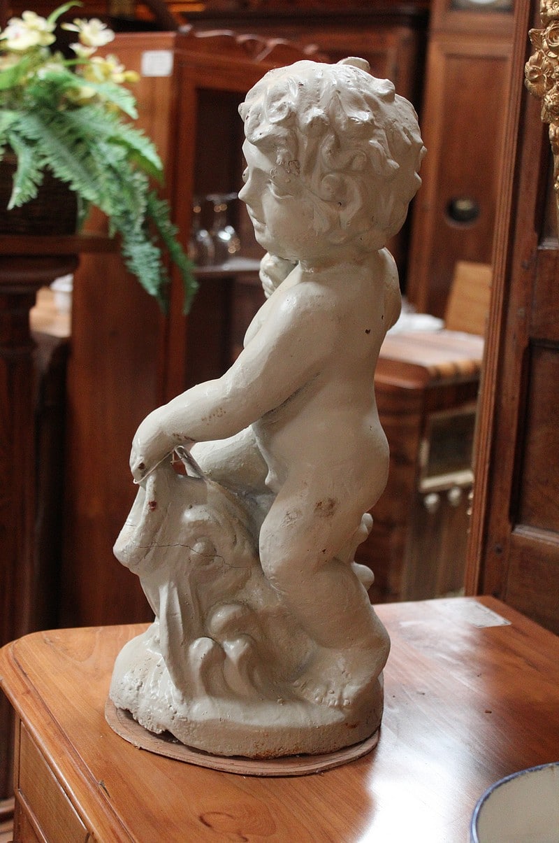 Petite statue en fonte peinte en blanc représentant un enfant tenant un poisson.