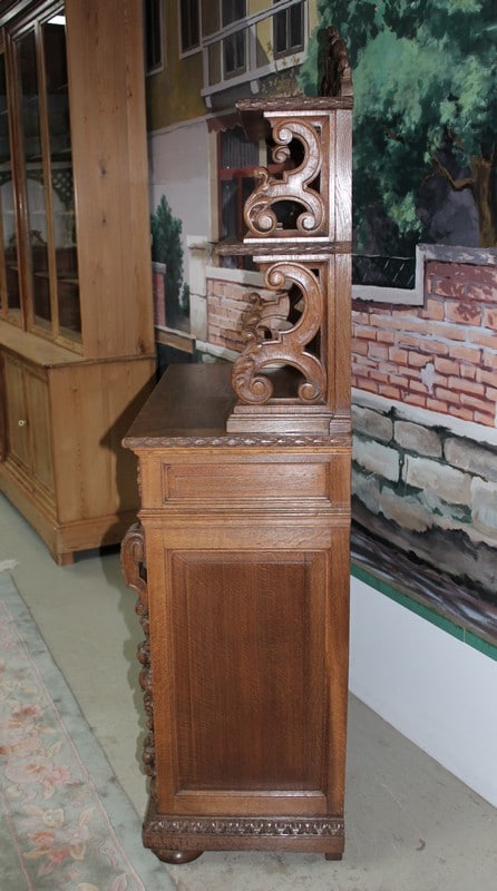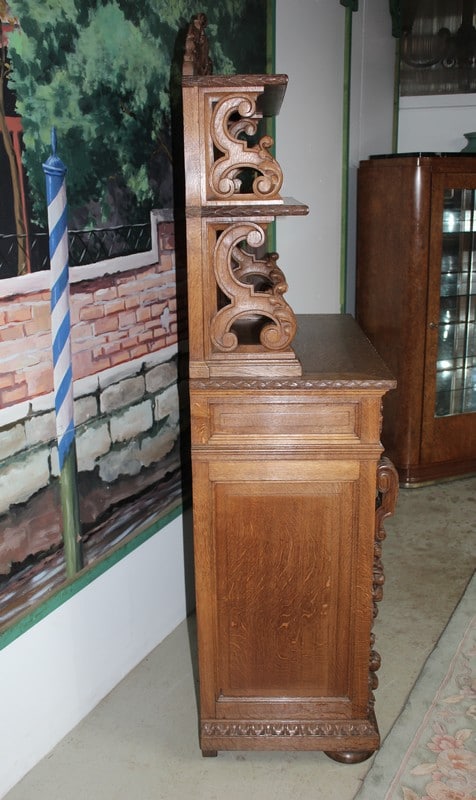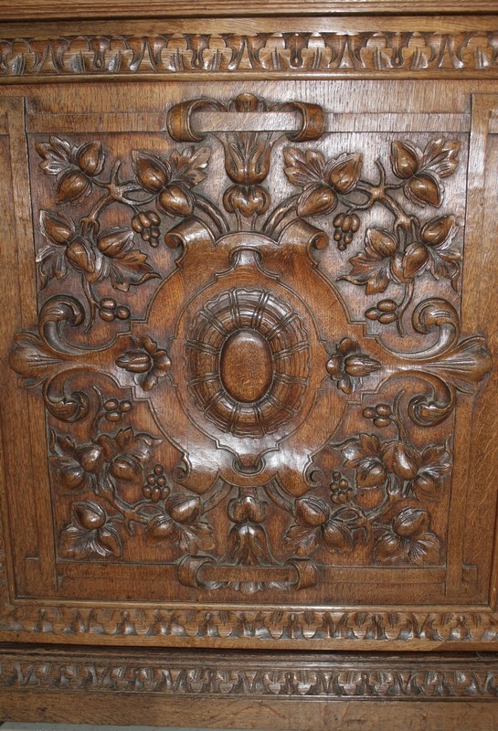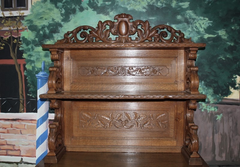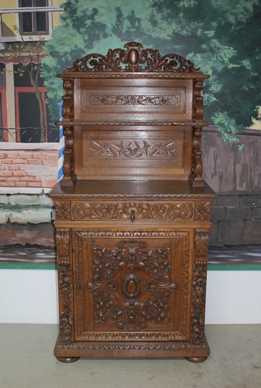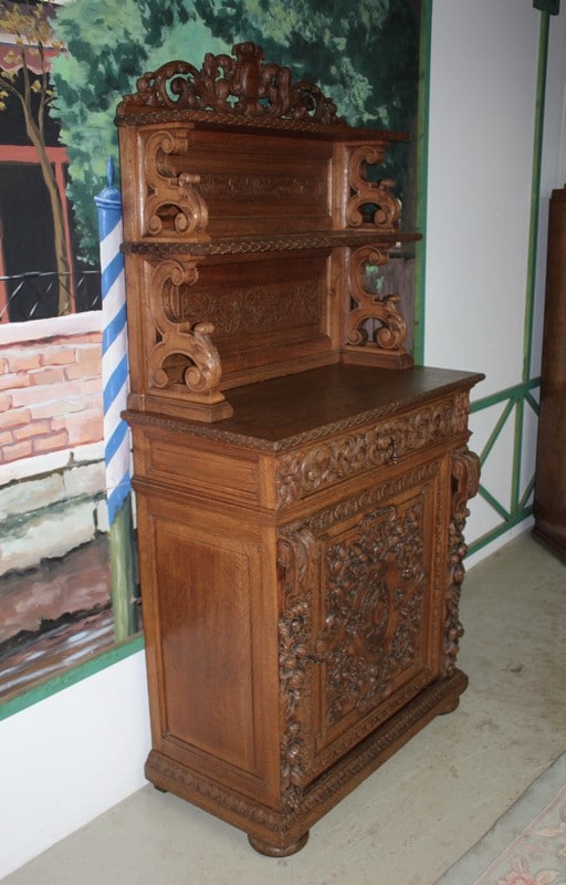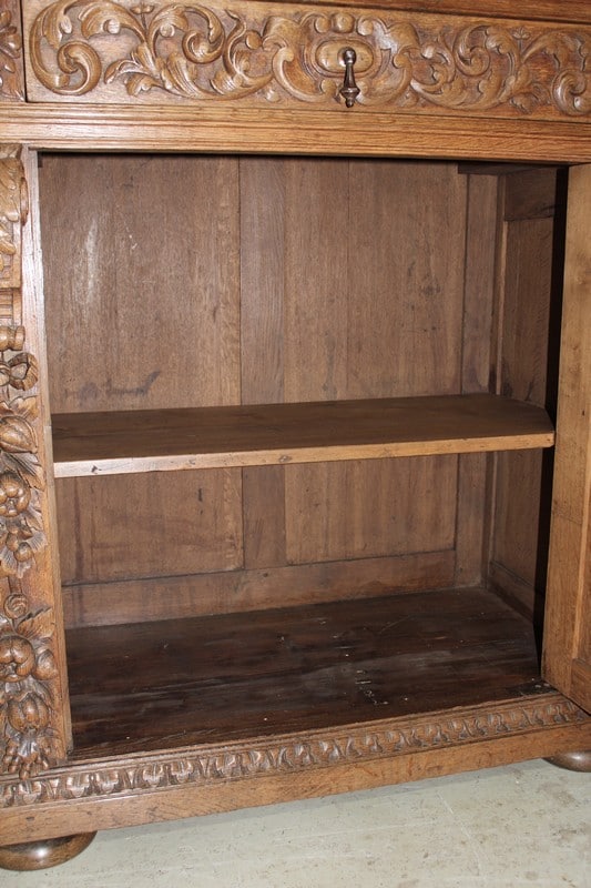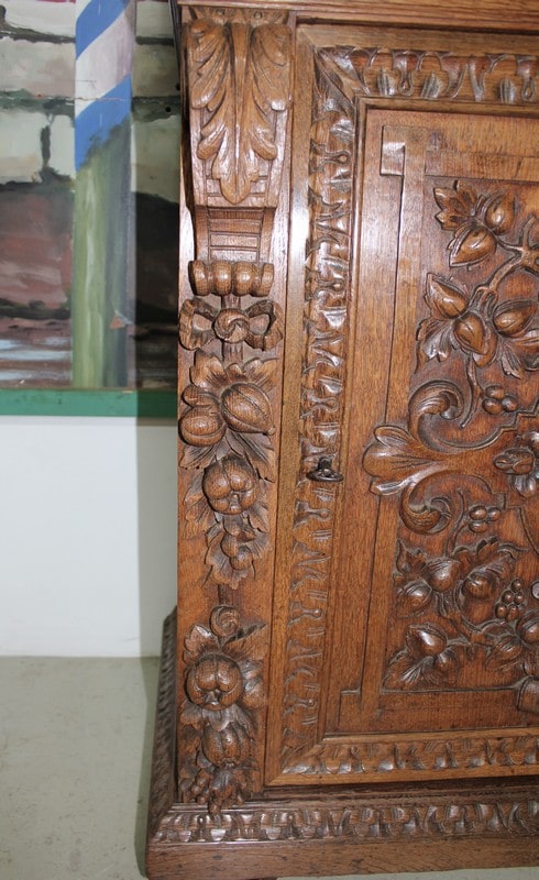 Petit buffet-dressoir en chêne clair dans le goût Renaissance ouvrant à une porte ornée de sculptures de fruits et de feuilles et un tiroir sculpté de rinceaux. Les montant sont également garnis de chutes de grappes de fruits. Il repose sur des pieds ‘miche’.