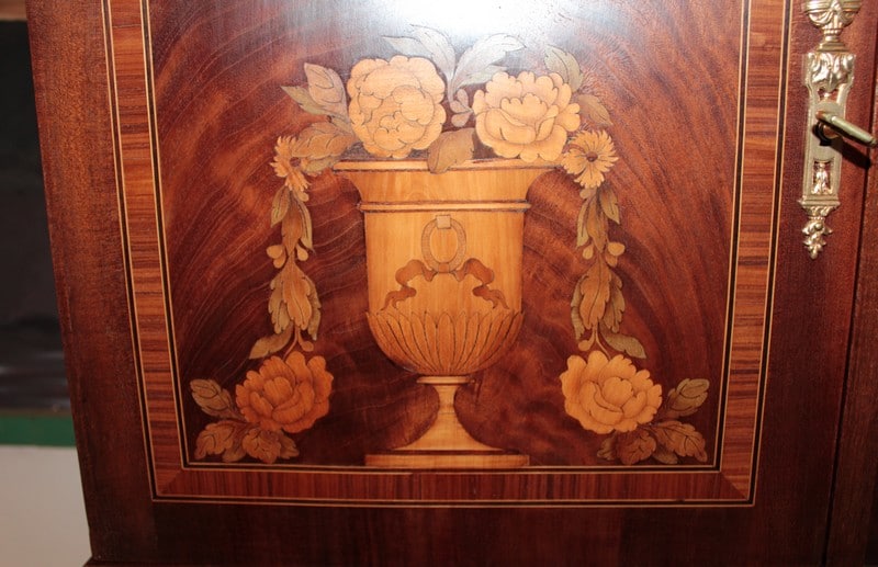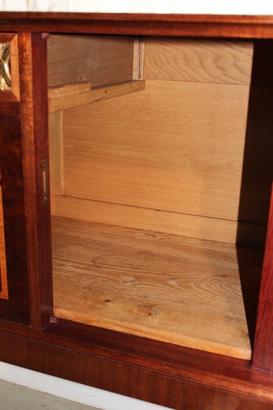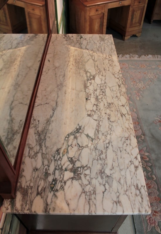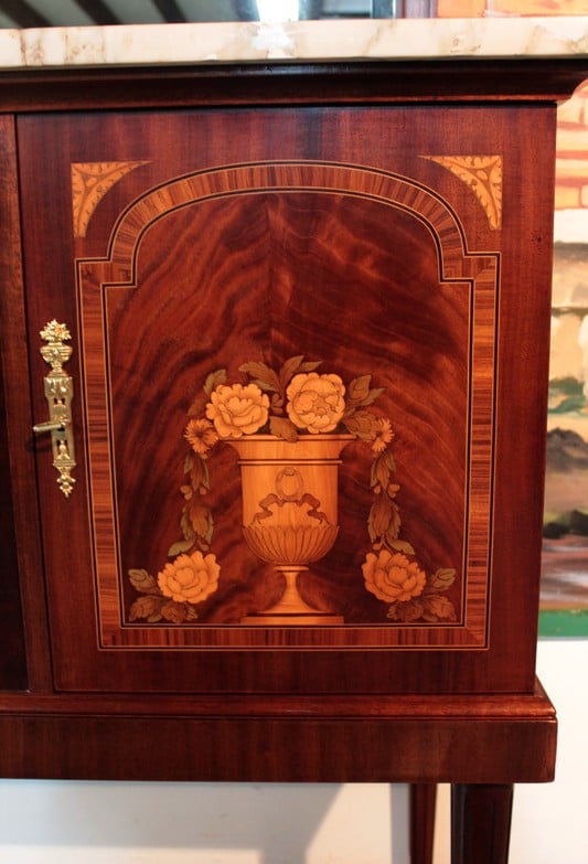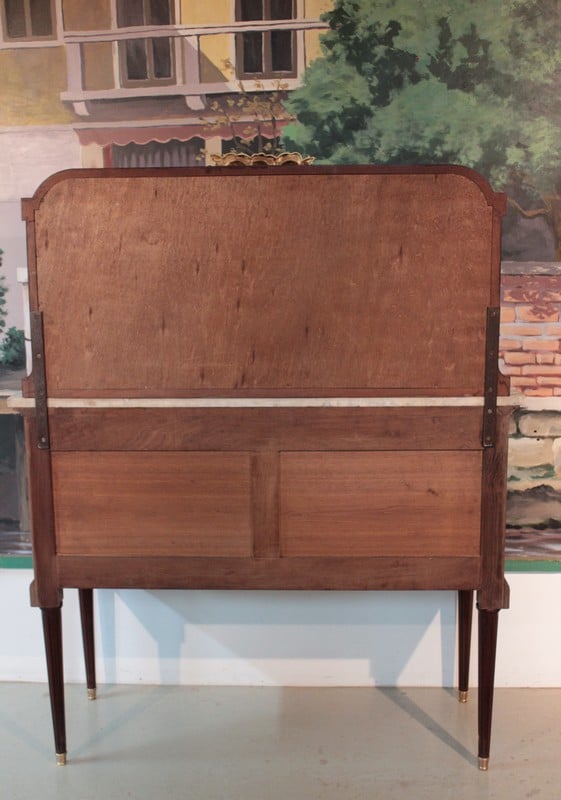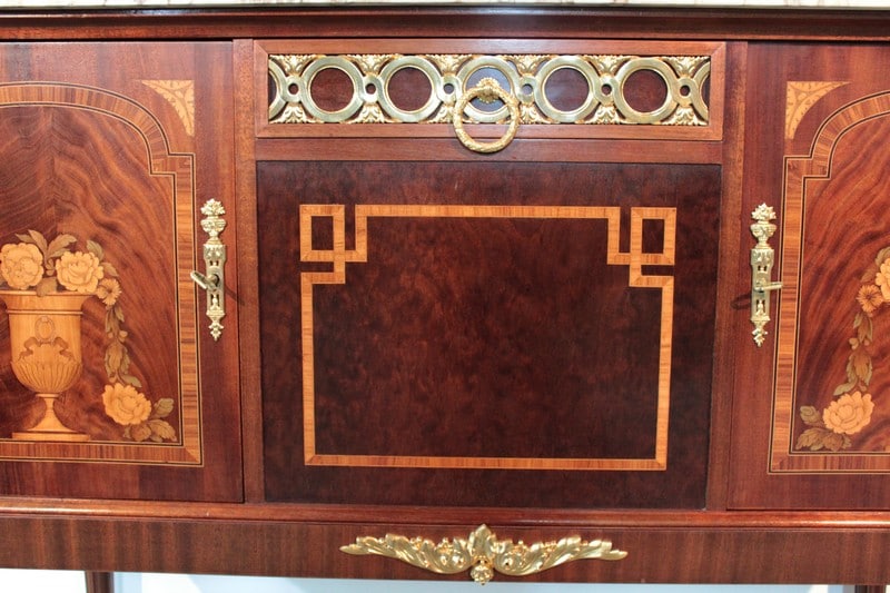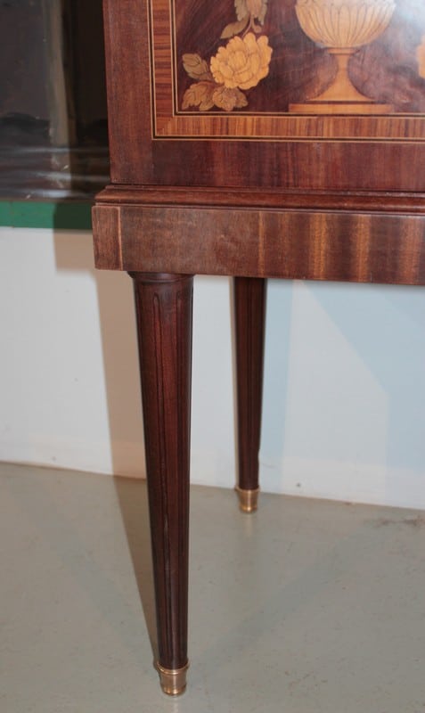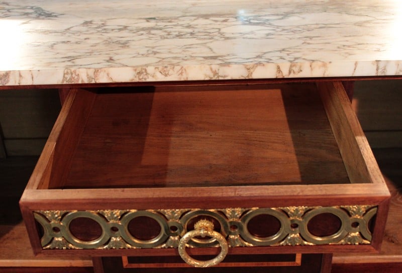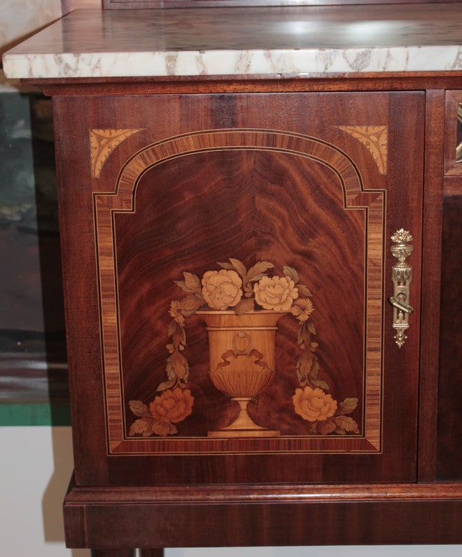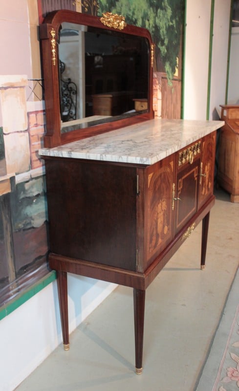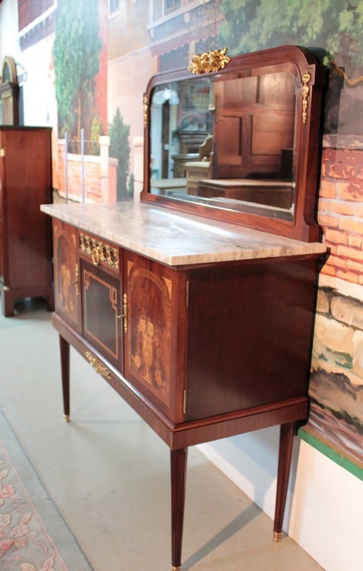 Desserte d’apparat en placage d’ acajou dans le goût Louis XVI avec dessus de marbre veiné blanc/beige surmonté d’un miroir biseauté et reposant sur 4 pieds fuselés à cannelures terminés par des sabots laiton. Elle ouvre par un tiroir dont la façade est habillée de bronze et par 2 portes en ronce d’acajou avec entourage en bois de rose, citronnier et palissandre , elles sont décorées d’une marqueterie en citronnier et bois teintés représentant des fleurs dans un vase. La partie centrale, sous le tiroir, est en acajou moucheté avec ruban en bois de rose et citronnier.