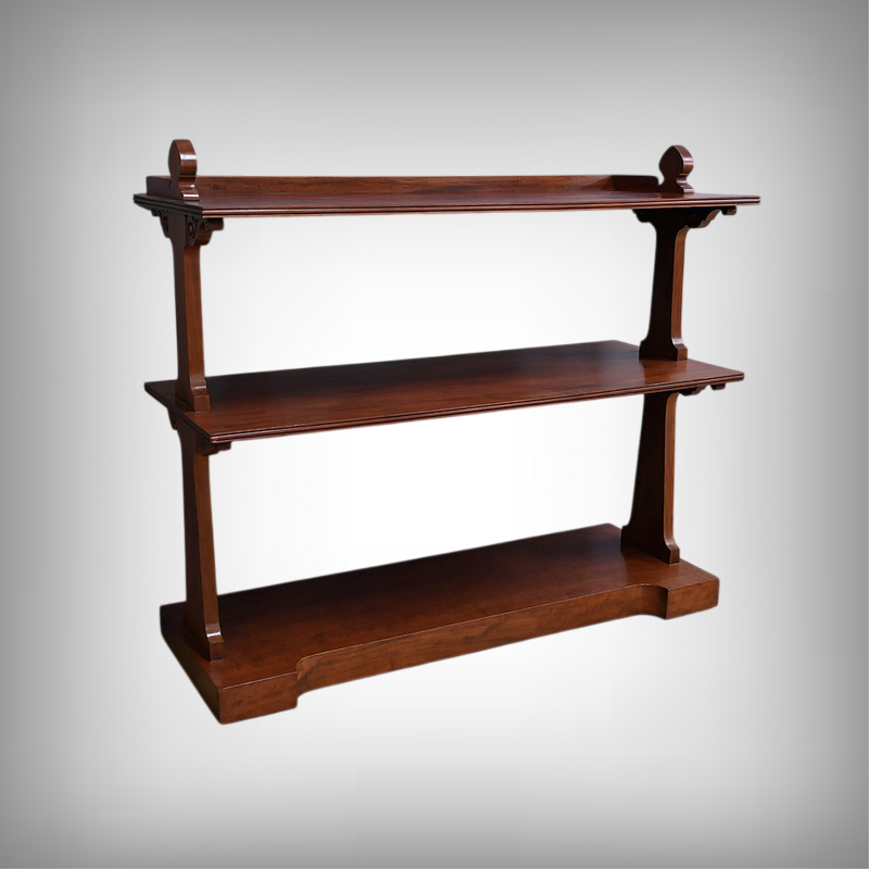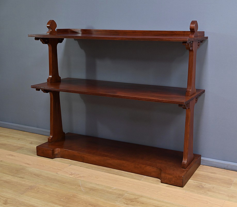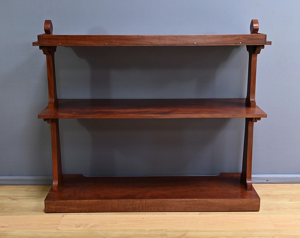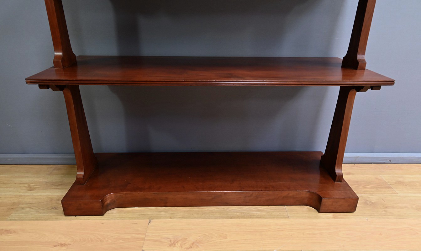 Élégante desserte en acajou et placage d’acajou possédant trois niveaux harmonieusement proportionnés. Chaque plateau offre un espace généreux, parfait pour accueillir objets décoratifs, vaisselle ou livres, tout en conservant une silhouette légère et aérienne. A noter, l’étagère supérieure est ceinte d’un rebord sur le fond et les côtés. Les montants, finement travaillés, sont soulignés d’un délicat décor d’enroulements, subtil hommage à l’esthétique néoclassique. Ils s’élèvent avec grâce pour se terminer en une forme de pique, apportant une touche de caractère à l’ensemble. Cette pièce rare reposant sur une base solide incarne l’élégance sobre du mobilier d’époque, et trouvera naturellement sa place dans un intérieur classique ou contemporain.