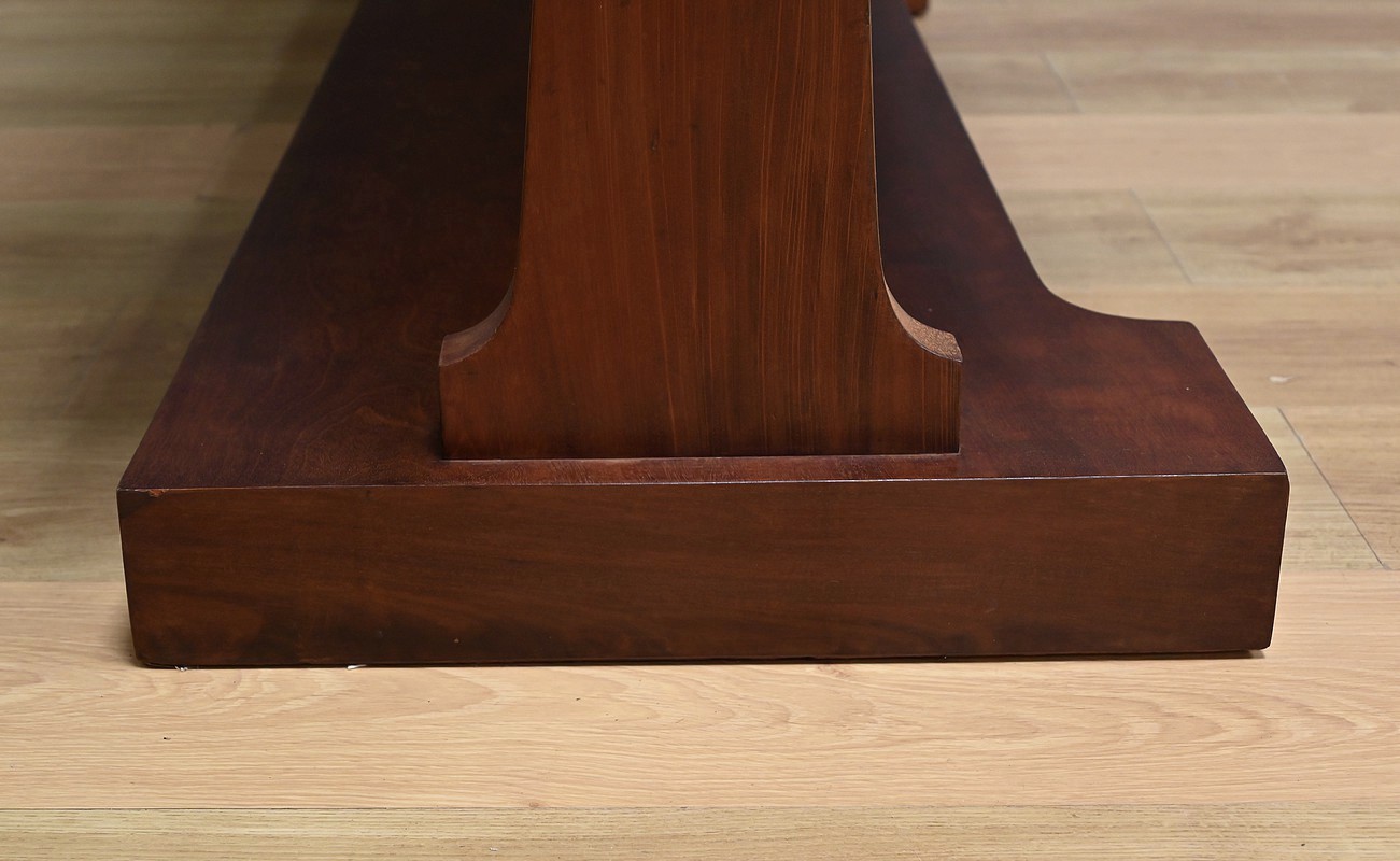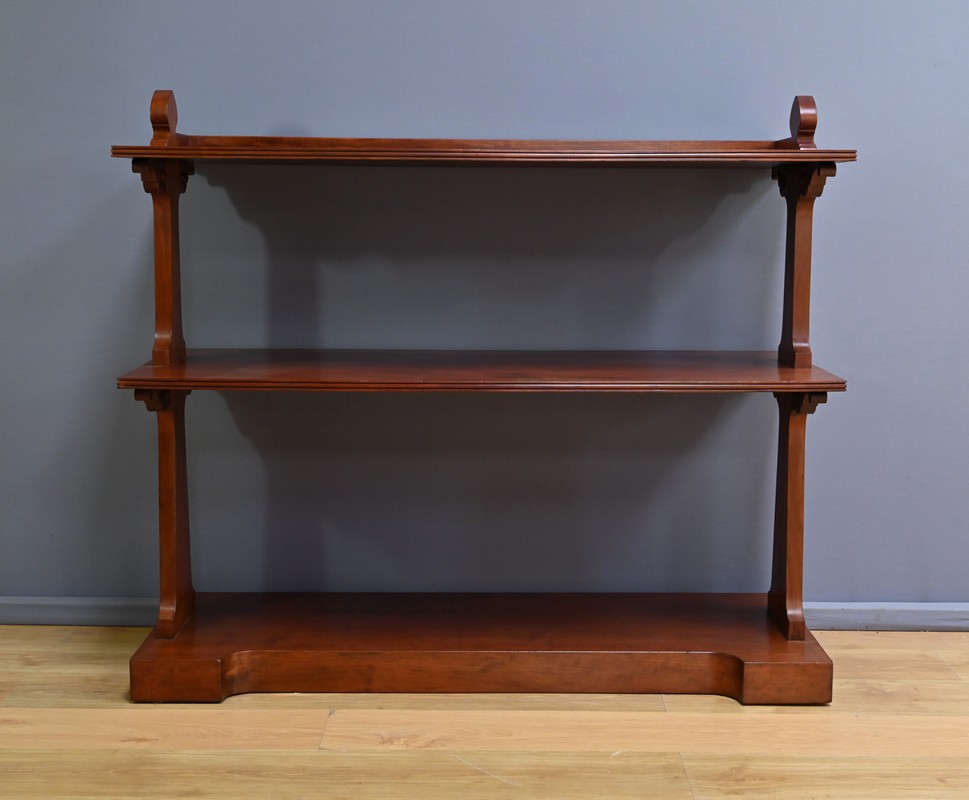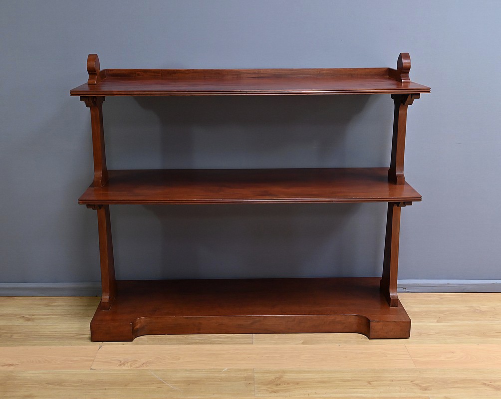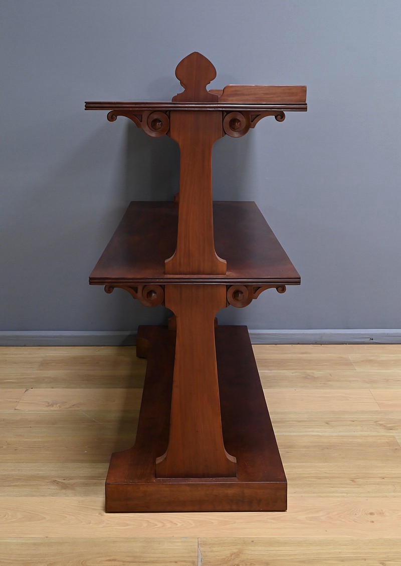 Élégante desserte en acajou et placage d’acajou possédant trois niveaux harmonieusement proportionnés. Chaque plateau offre un espace généreux, parfait pour accueillir objets décoratifs, vaisselle ou livres, tout en conservant une silhouette légère et aérienne. A noter, l’étagère supérieure est ceinte d’un rebord sur le fond et les côtés. Les montants, finement travaillés, sont soulignés d’un délicat décor d’enroulements, subtil hommage à l’esthétique néoclassique. Ils s’élèvent avec grâce pour se terminer en une forme de pique, apportant une touche de caractère à l’ensemble. Cette pièce rare reposant sur une base solide incarne l’élégance sobre du mobilier d’époque, et trouvera naturellement sa place dans un intérieur classique ou contemporain.