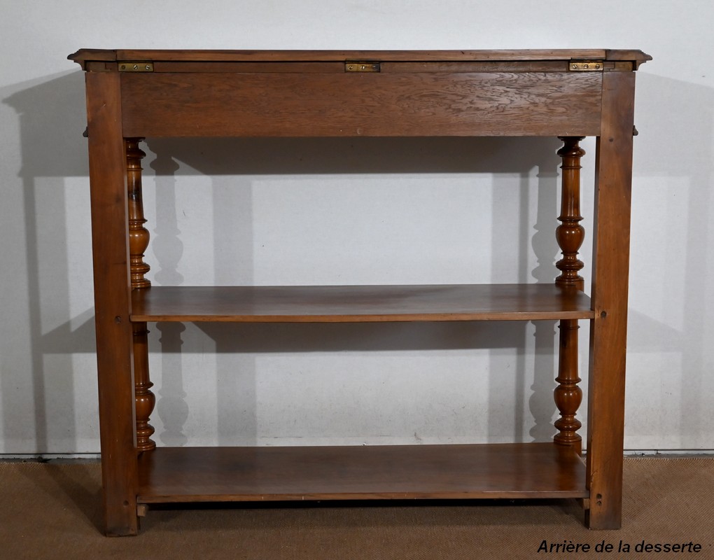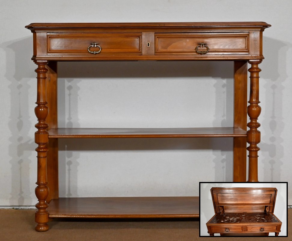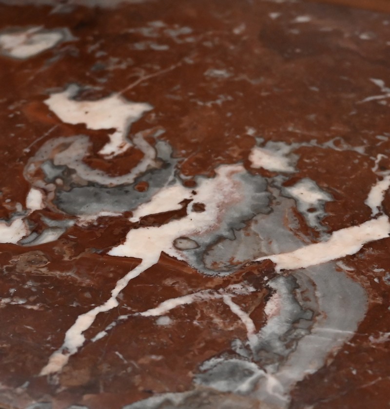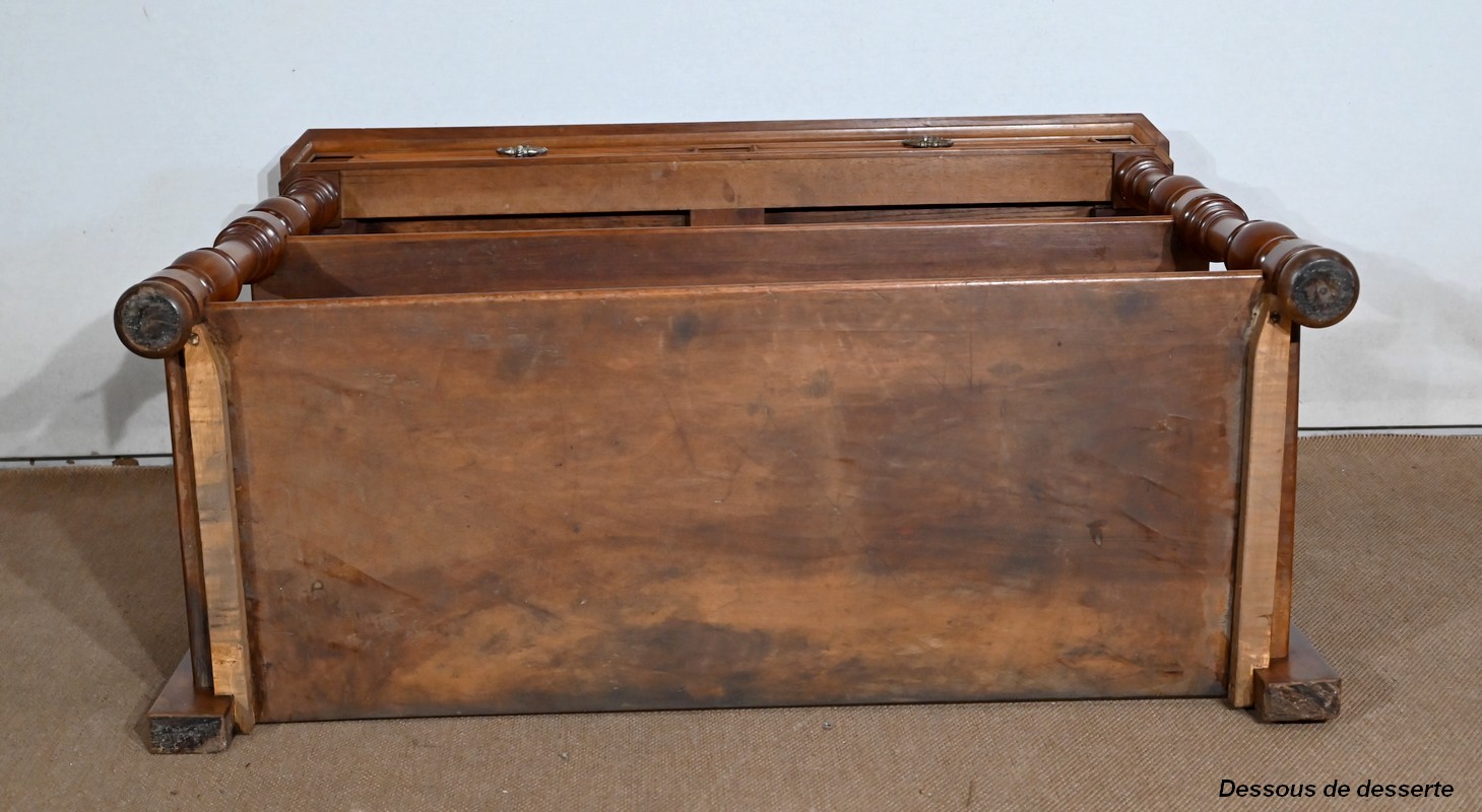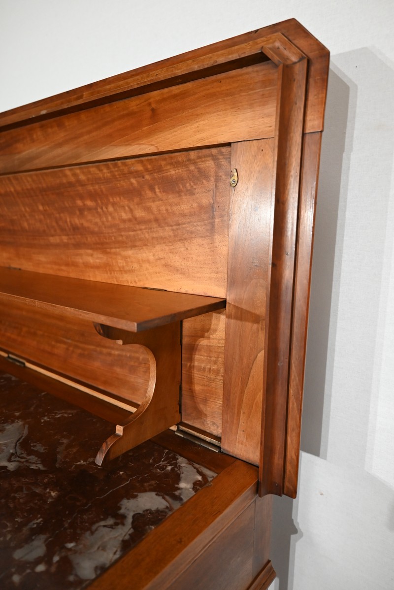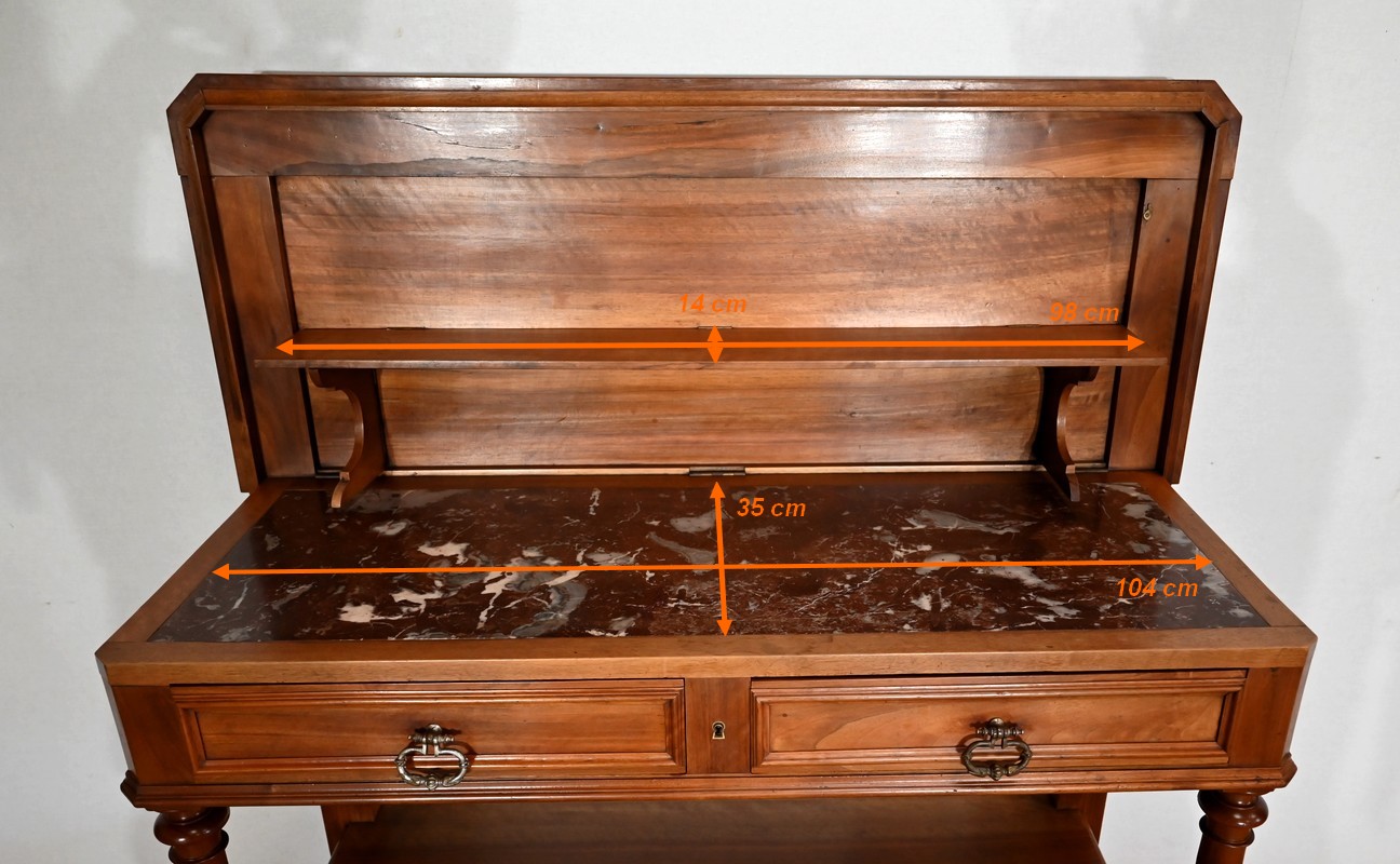 Son dessus à encadrement est mouluré en gorge et en bec de corbin. Le panneau qui le constitue est d’une seule partie sans joint. Il s’ouvre vers l’arrière à l’aide de charnières, laissant apparaitre un marbre rouge des Pyrénées, encastré dans un cadre en bois. Cet abattant propose deux supports se déployant pour recevoir une tablette de service.