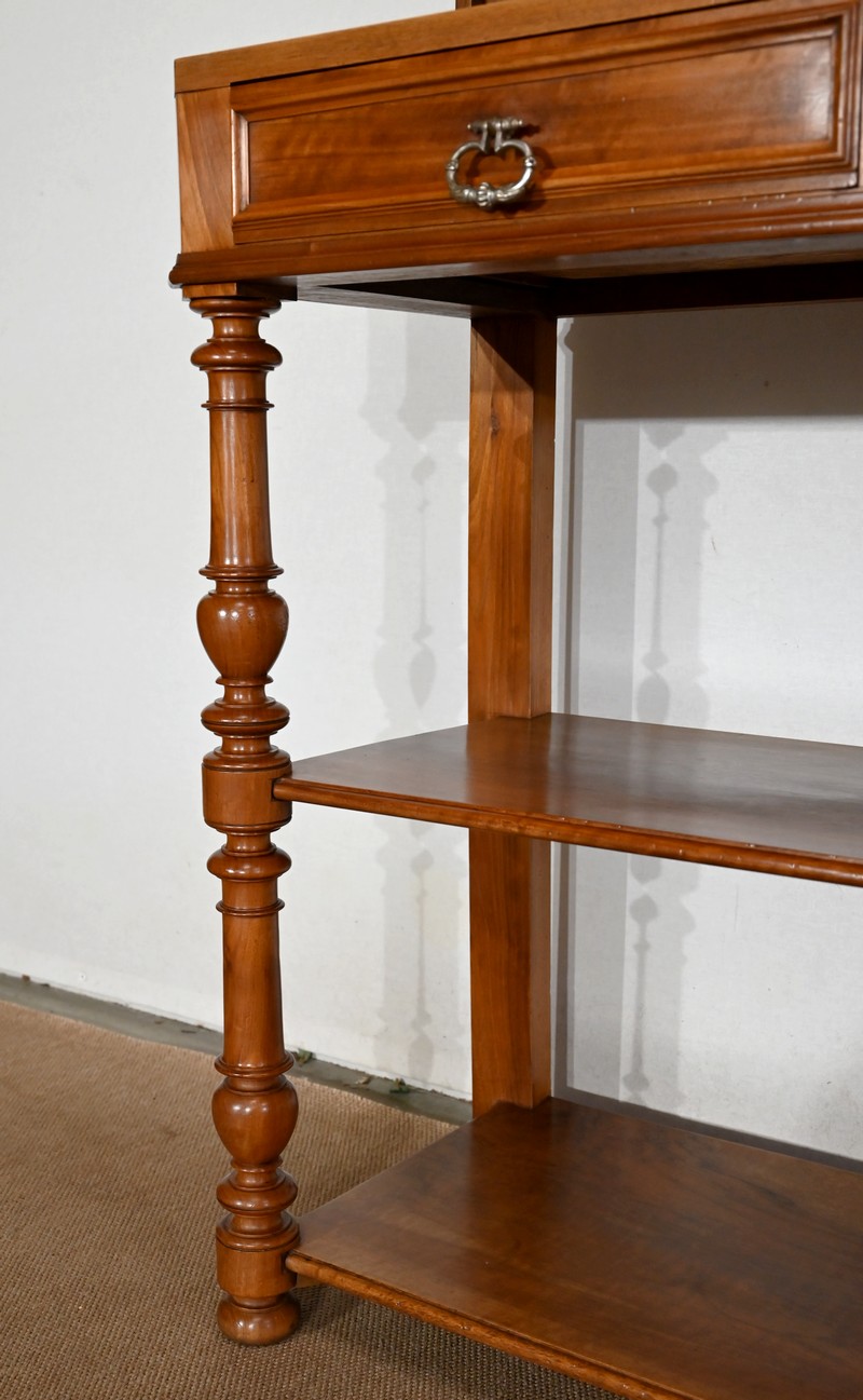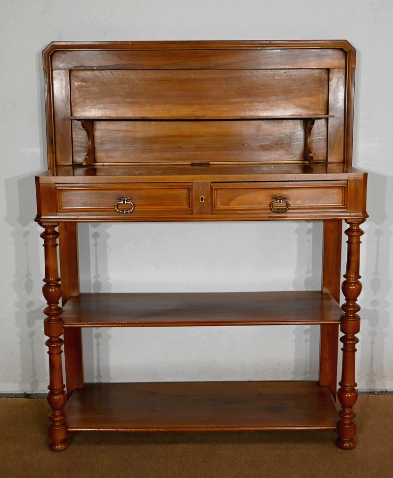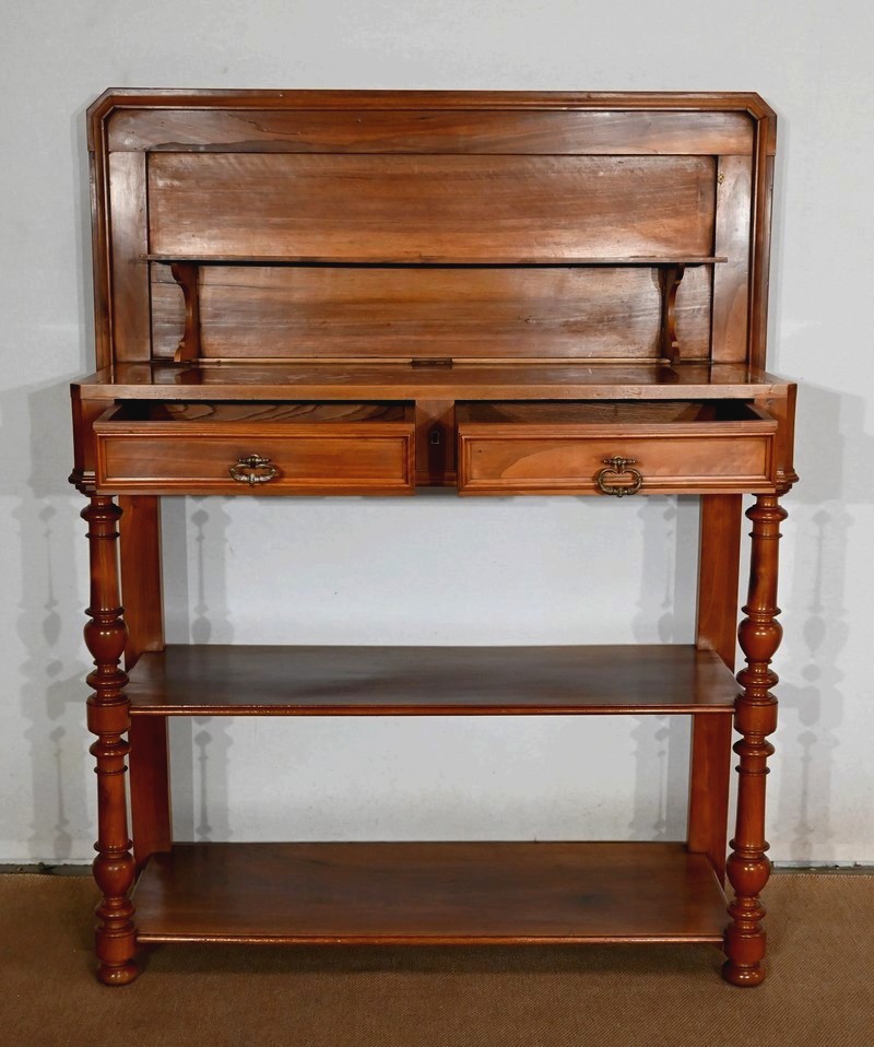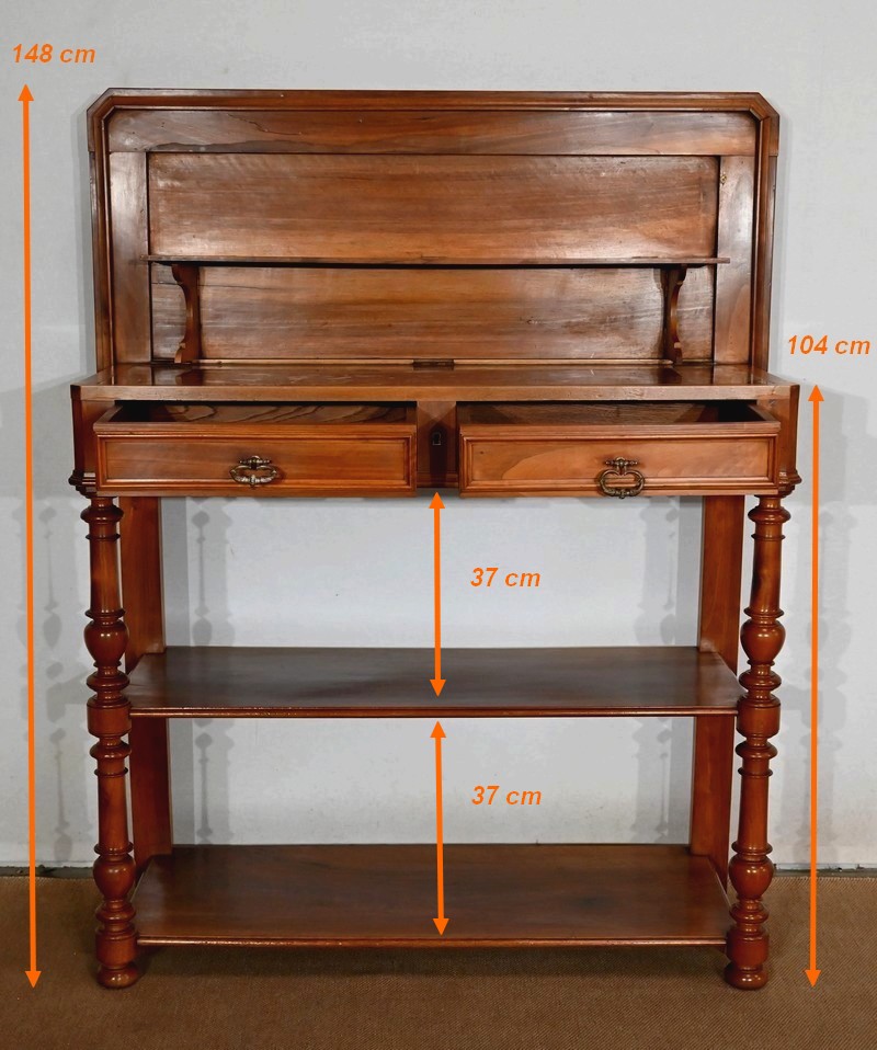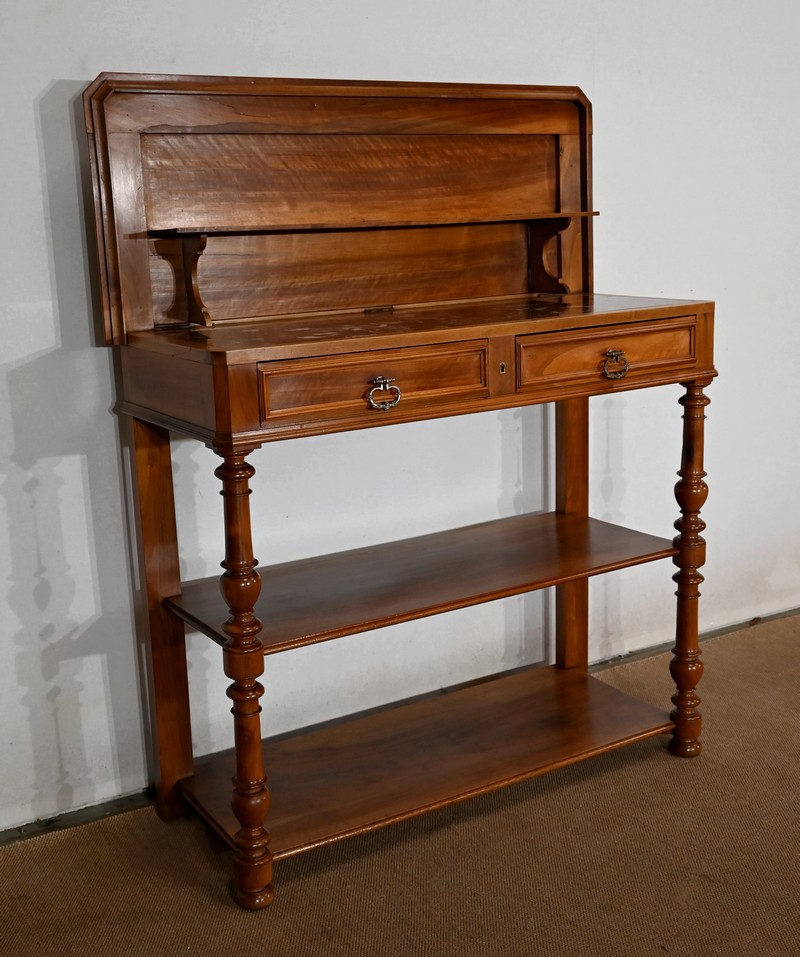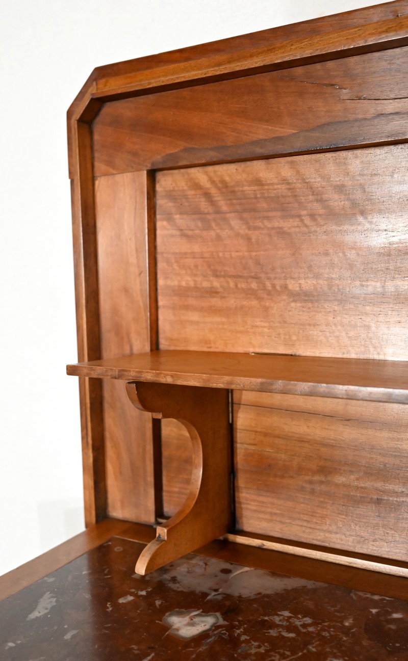 Son dessus à encadrement est mouluré en gorge et en bec de corbin. Le panneau qui le constitue est d’une seule partie sans joint. Il s’ouvre vers l’arrière à l’aide de charnières, laissant apparaitre un marbre rouge des Pyrénées, encastré dans un cadre en bois. Cet abattant propose deux supports se déployant pour recevoir une tablette de service.