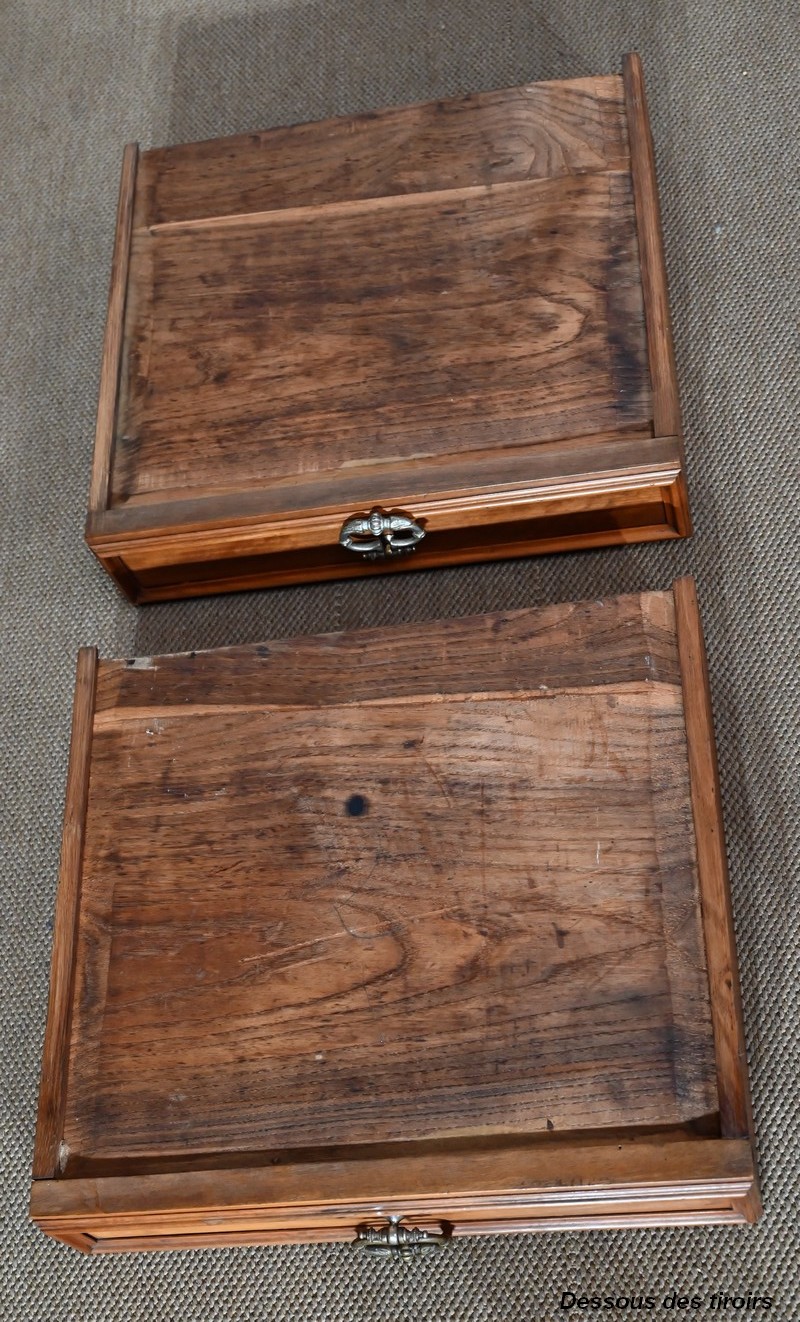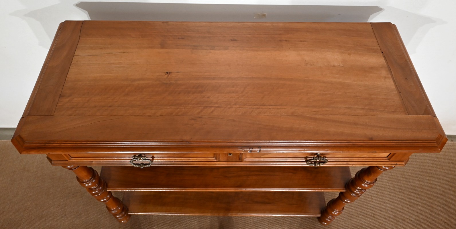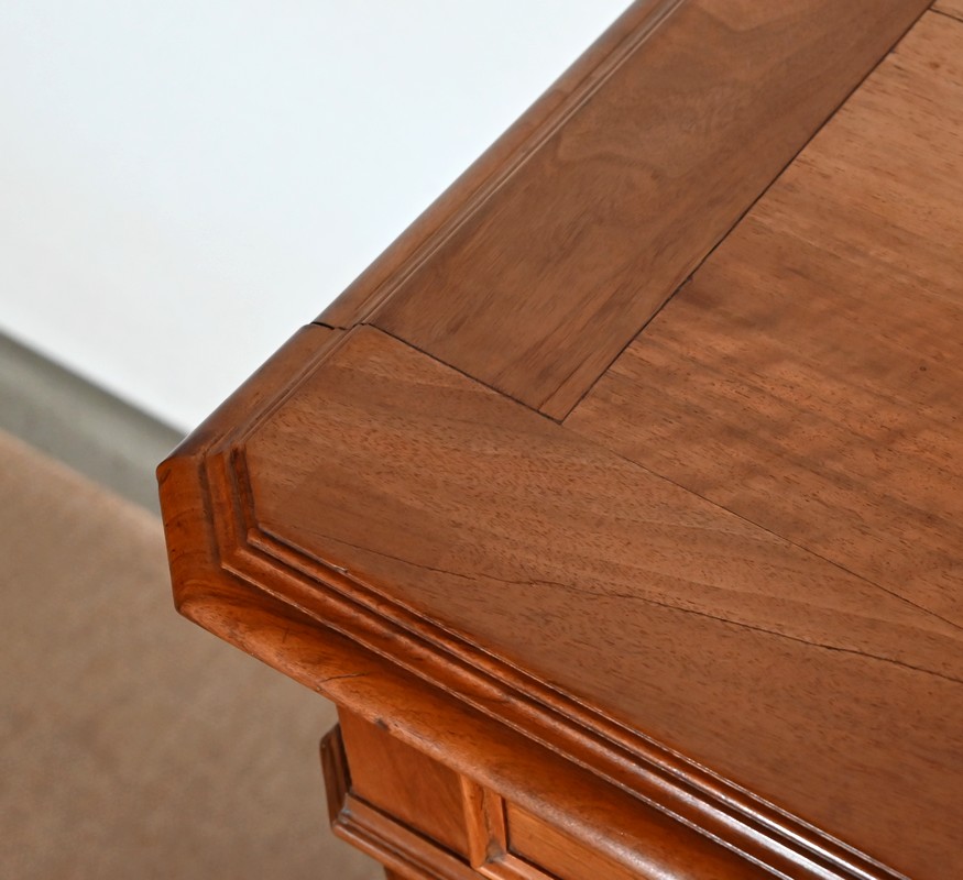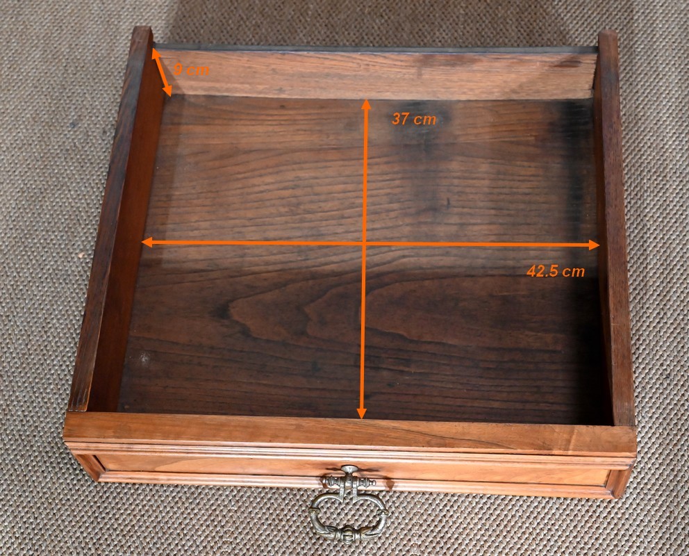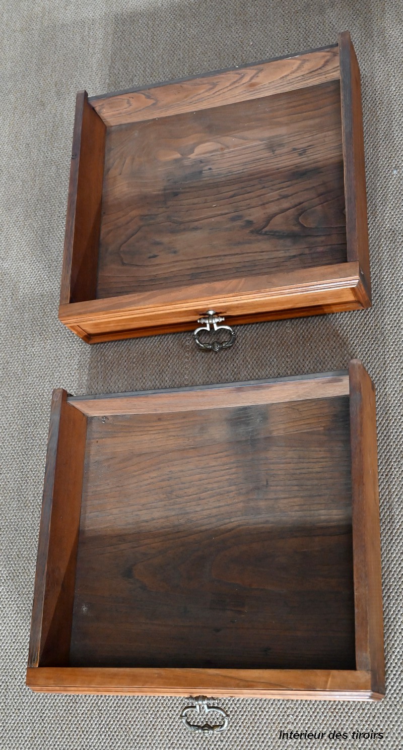 Ce meuble en noyer est composé en ceinture de deux tiroirs se tirant à l’aide de poignées tombantes et se fermant par une clef centrale.
