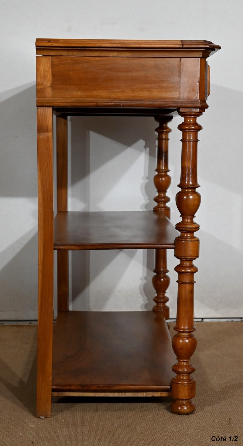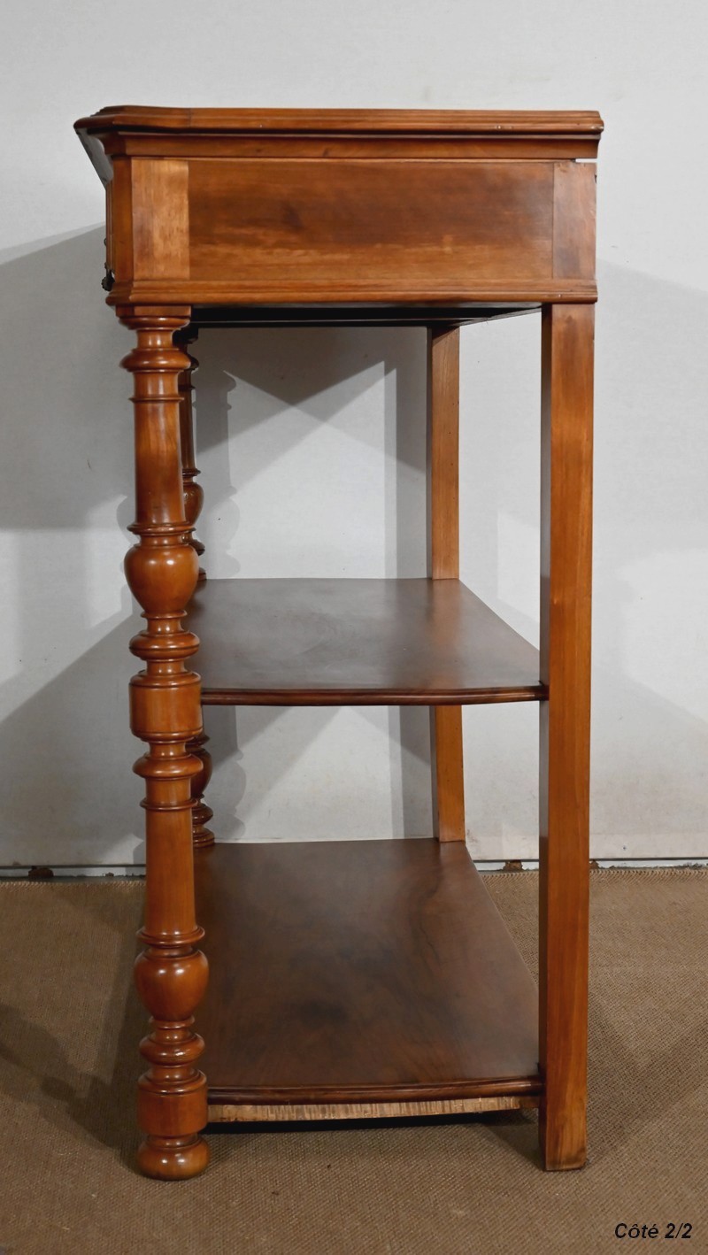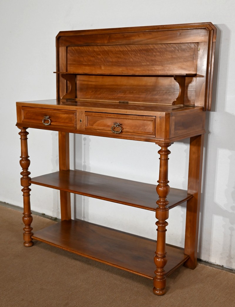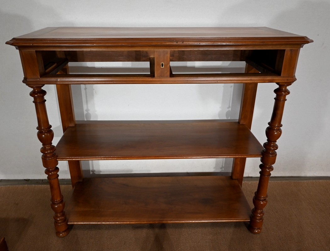 Ce meuble en noyer est composé en ceinture de deux tiroirs se tirant à l’aide de poignées tombantes et se fermant par une clef centrale.