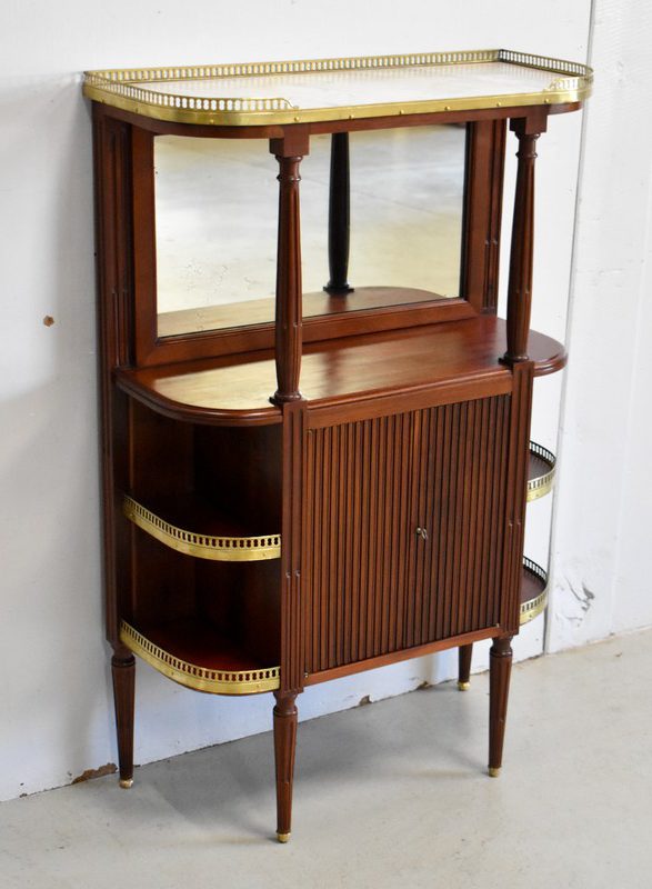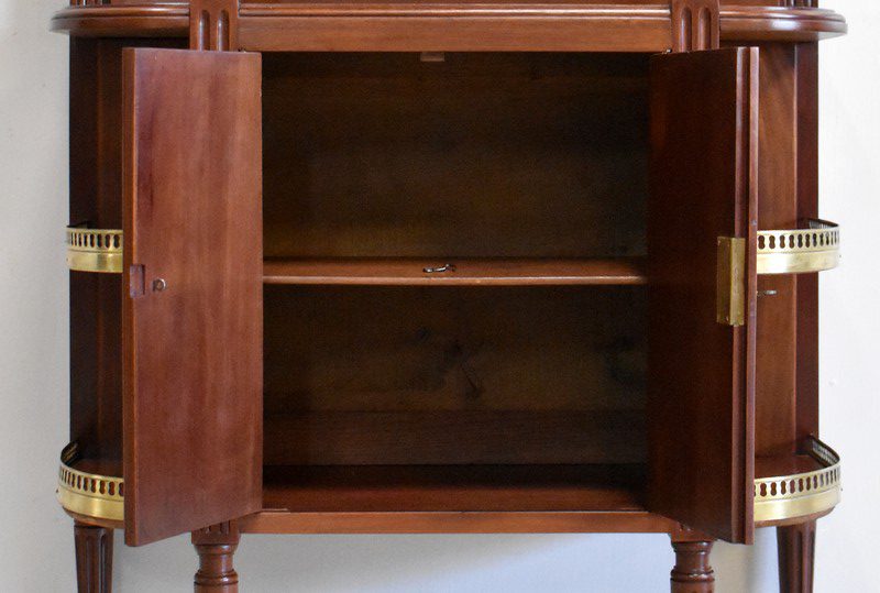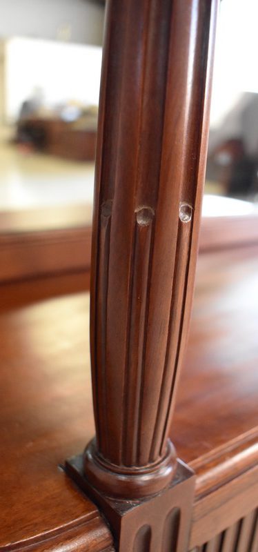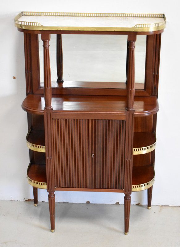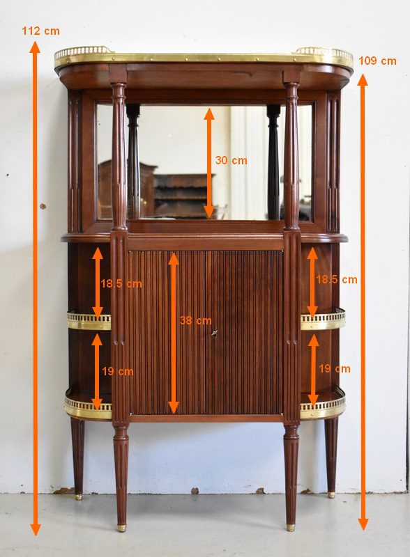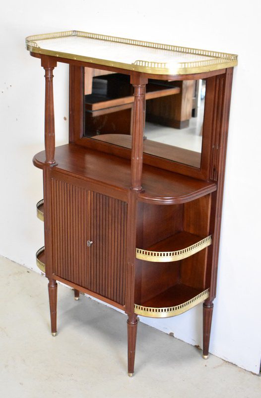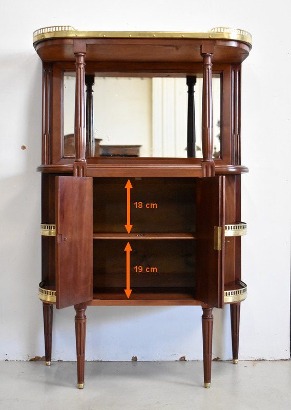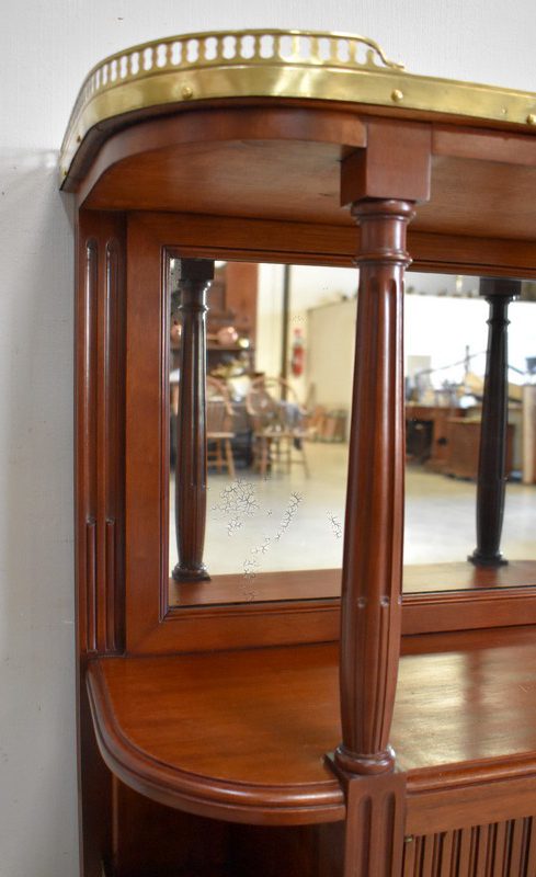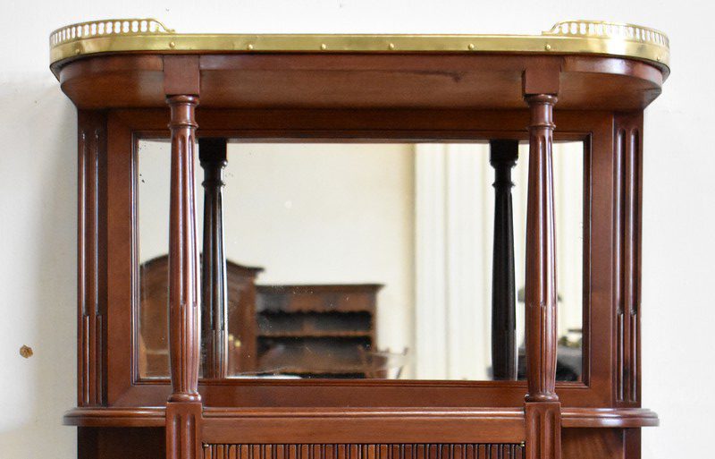 Son Dessus consiste en un Marbre Blanc de Carrare veiné de Gris, ceinturé d’une Galerie Laiton ajourée. Il repose sur deux Colonnes Tournées à Cannelures arrêtées, formant ainsi une Niche. Le Fond de celle-ci est agrémenté en partie centrale d’une Glace au Mercure avec Encadrement Mouluré.