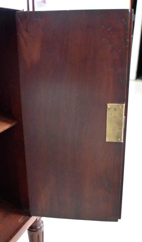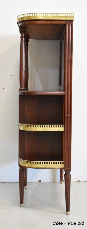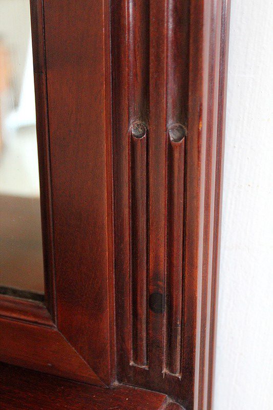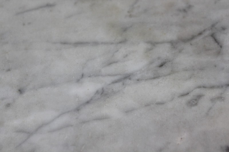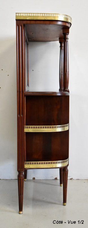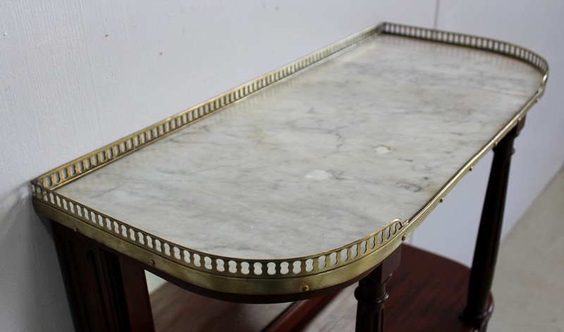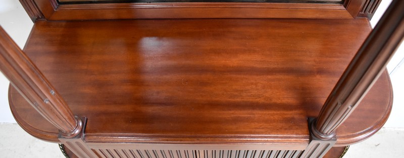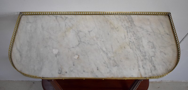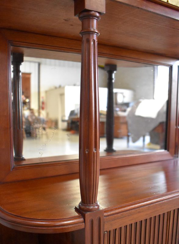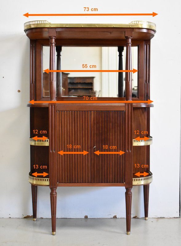 Son Dessus consiste en un Marbre Blanc de Carrare veiné de Gris, ceinturé d’une Galerie Laiton ajourée. Il repose sur deux Colonnes Tournées à Cannelures arrêtées, formant ainsi une Niche. Le Fond de celle-ci est agrémenté en partie centrale d’une Glace au Mercure avec Encadrement Mouluré.