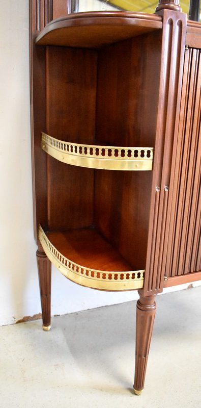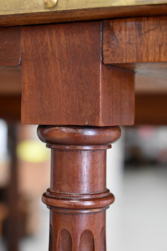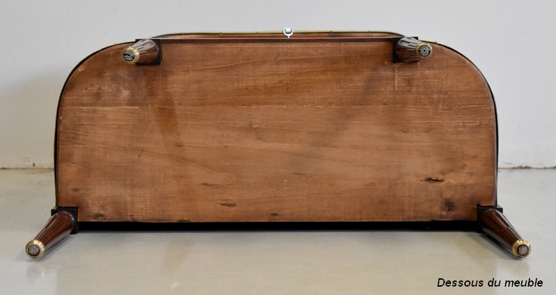 L’ensemble est enrichi par quatre montants, qui reprennent le Décor Cannelé évoqué plus haut. Ils se terminent par quatre Pieds tournés en Fuseau, avec Sabots en Bronze en partie basse.
