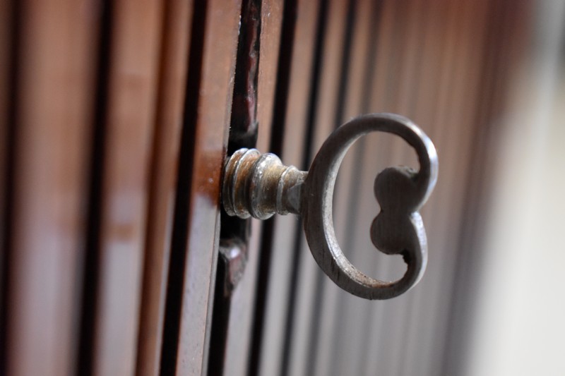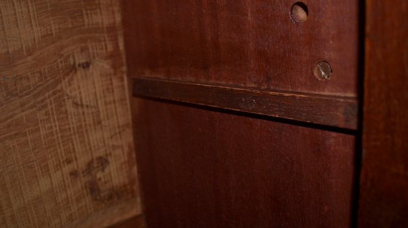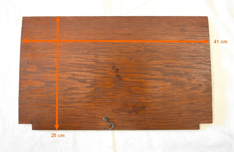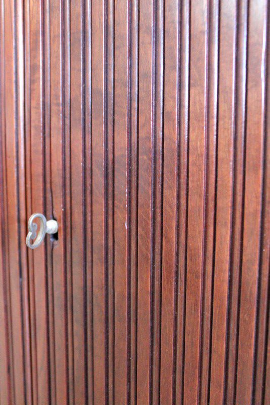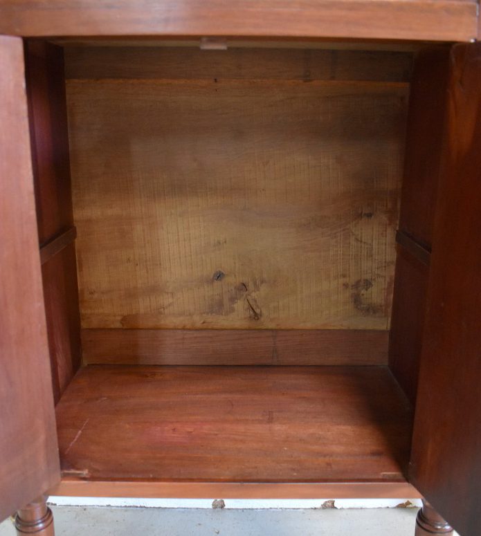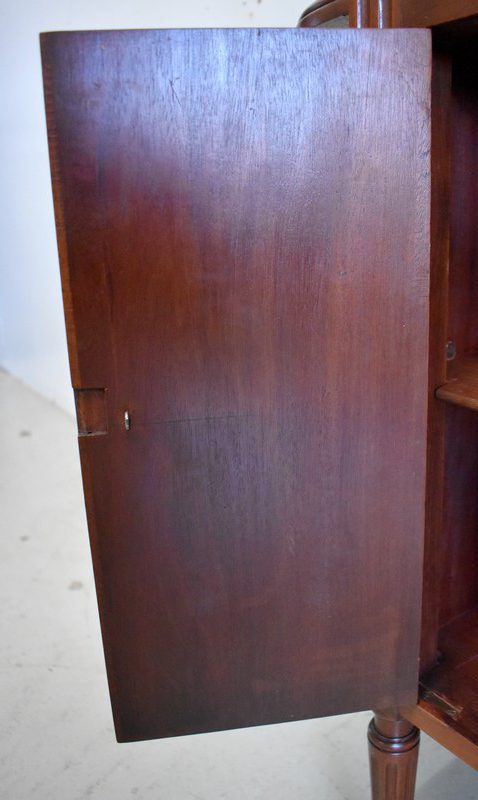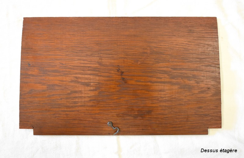 En dessous, ce Bien ouvre par deux portes à imitation rideau. L’une d’elle est munie de sa Serrure et de sa Clé. L’intérieur offre un espace de rangement garni d’une Étagère amovible posée sur tasseaux fixes.